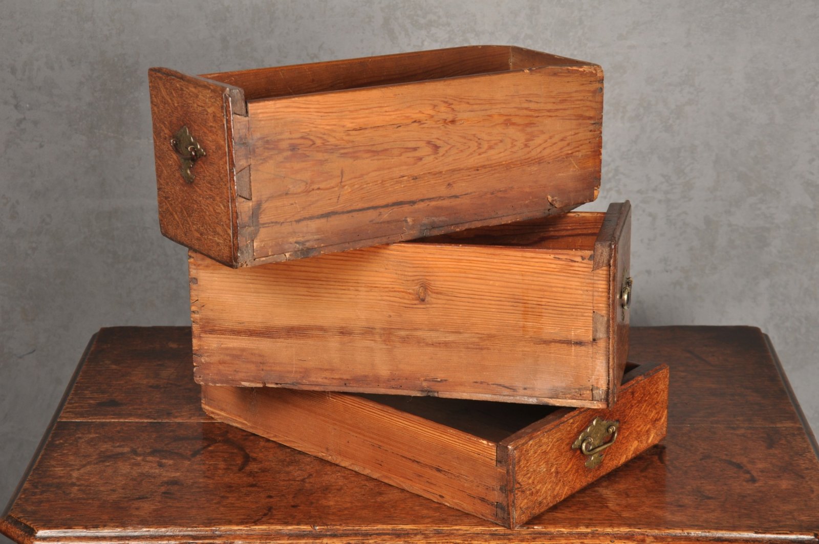 A very attractive early 18th Century George I figured Oak Lowboy of wonderful golden colour. Retaining the original chased handles.