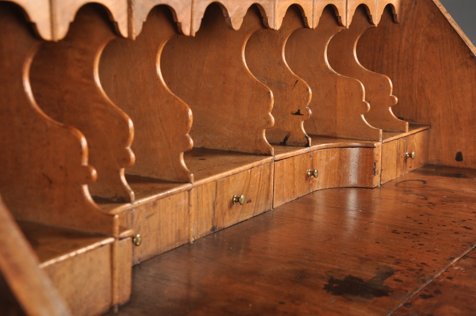 18th Century Walnut Bureau of wonderful glowing colour and patina. Retaining fine quality original shaped brass handles, locks and hinges throughout. Having shaped interior and clean original Oak drawer linings to the base and walnut ones to the interior.
