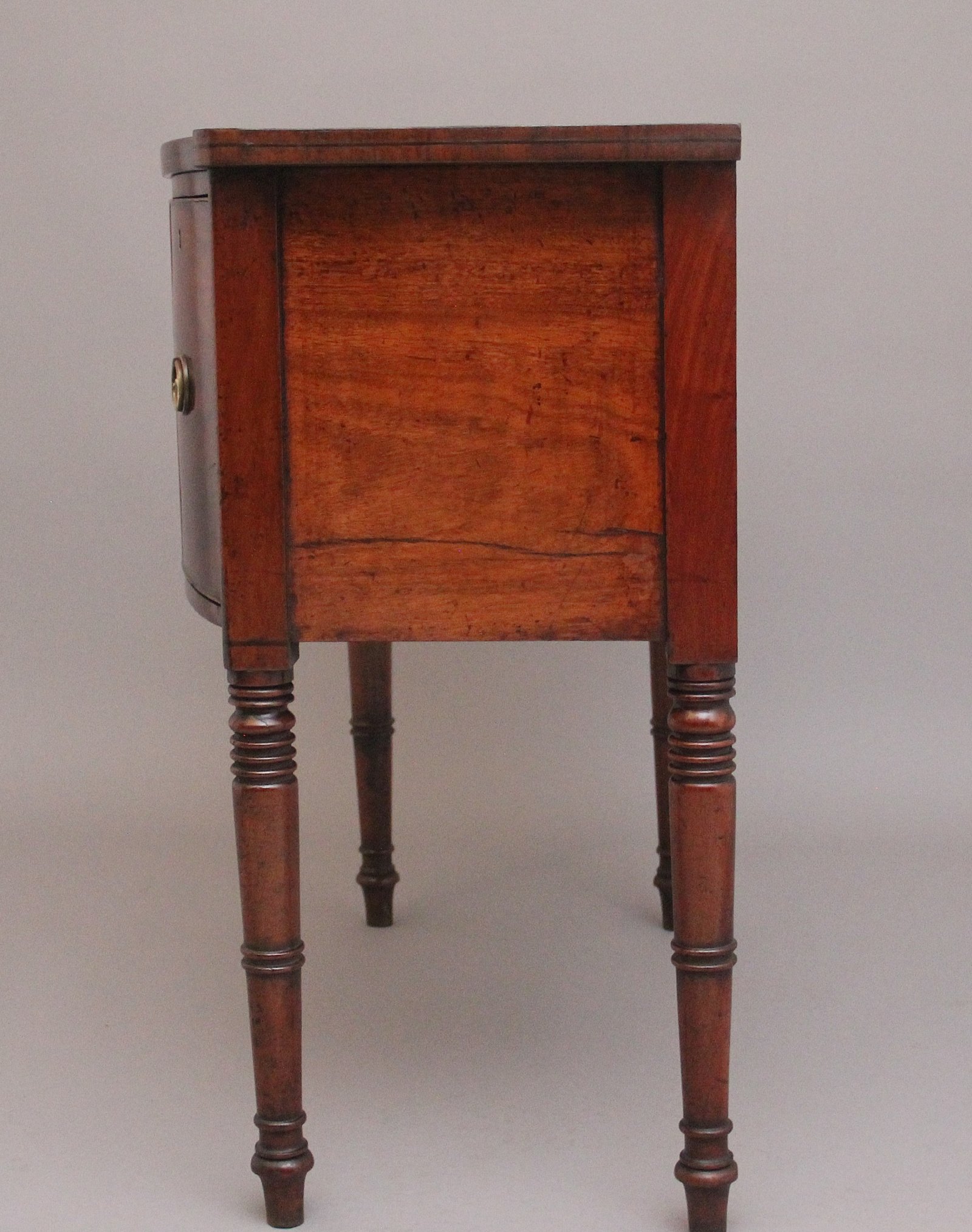 Early 19th Century mahogany bowfront sideboard of nice proportions , the well figured and shaped top above a central drawer flanked by a cupboard on one side and a deep drawer the other, all having brass engraved ring pull handles, having a decorative shaped apron below the central drawer, supported on elegant turned legs. Circa 1820.