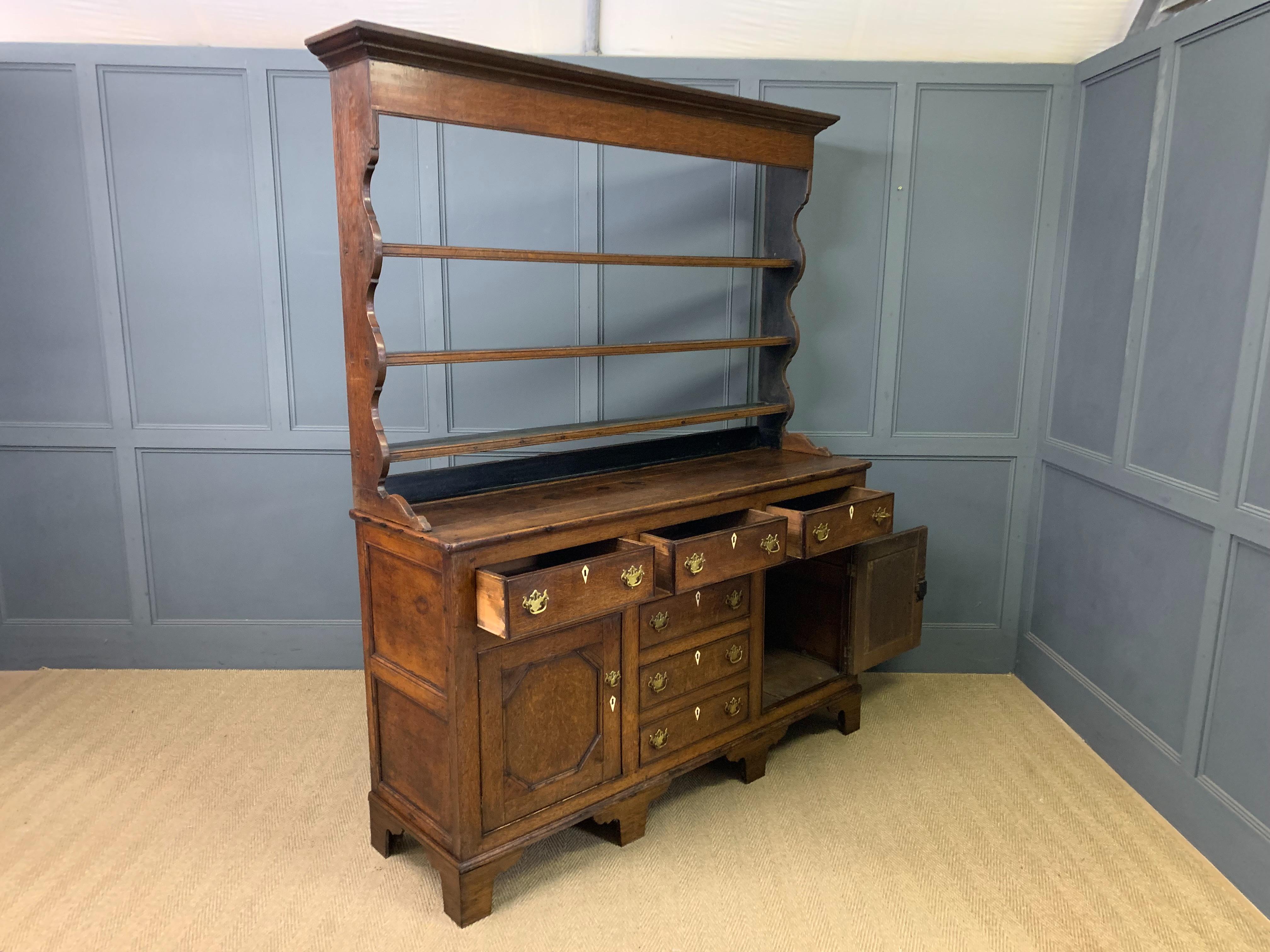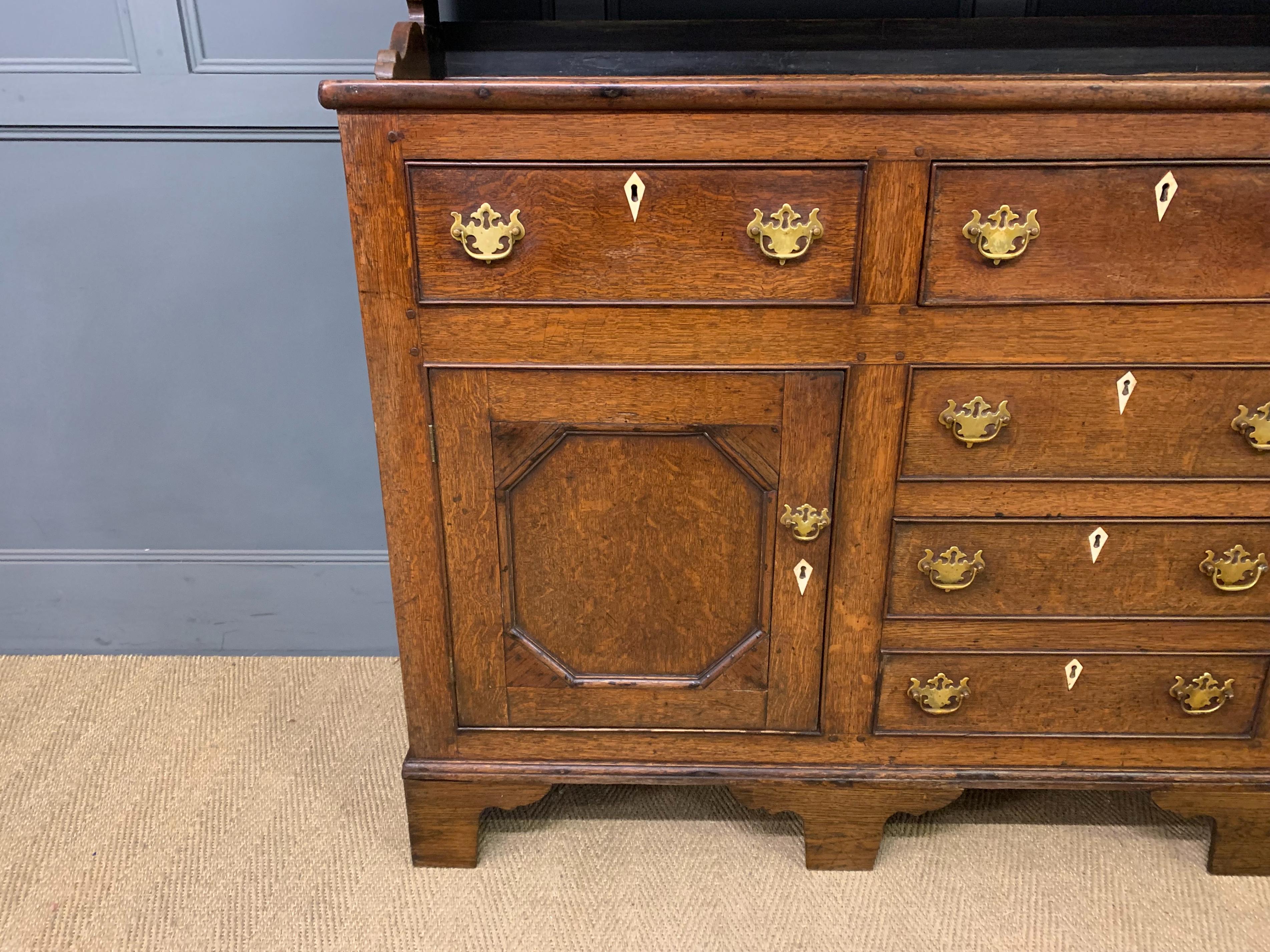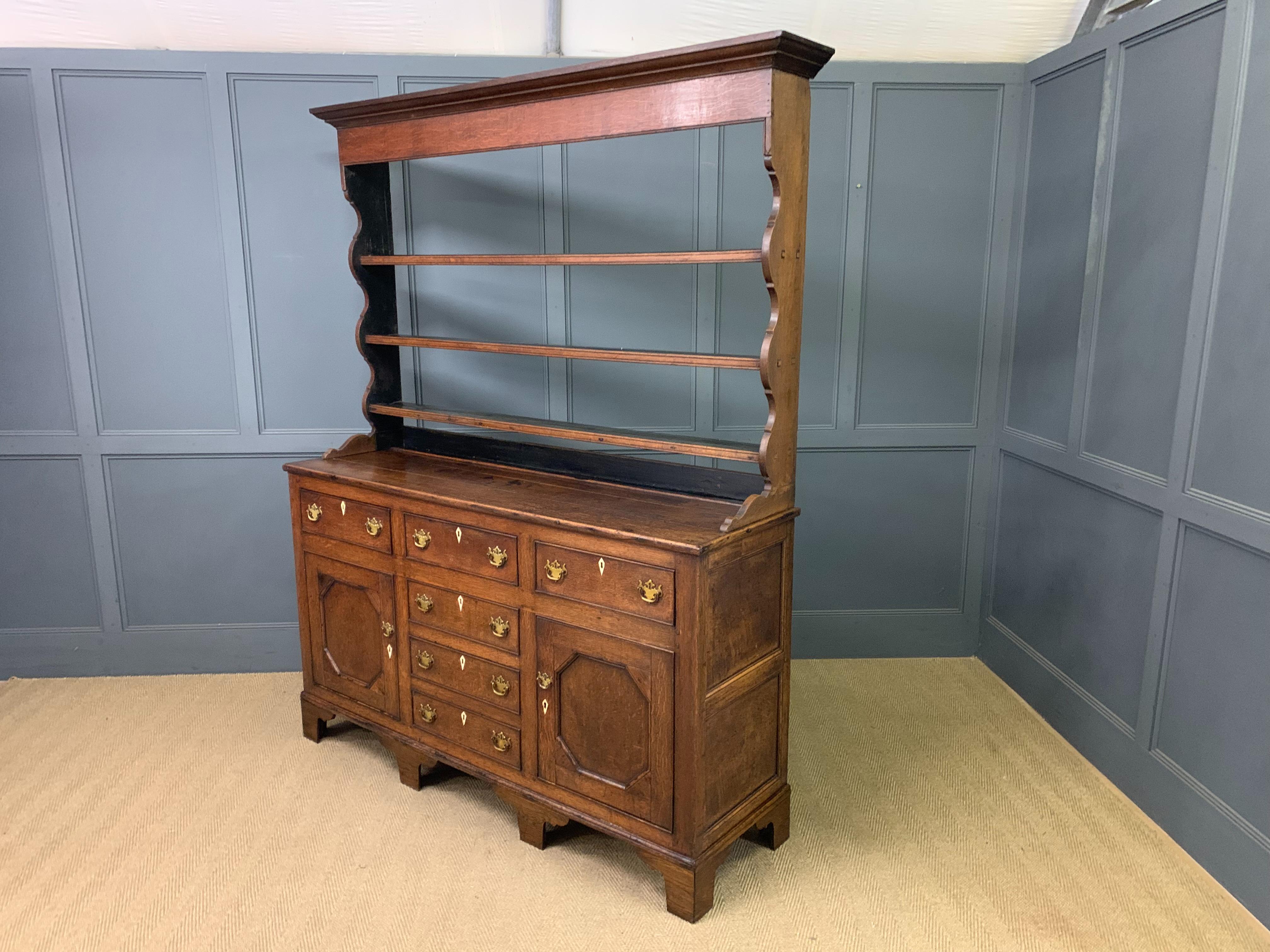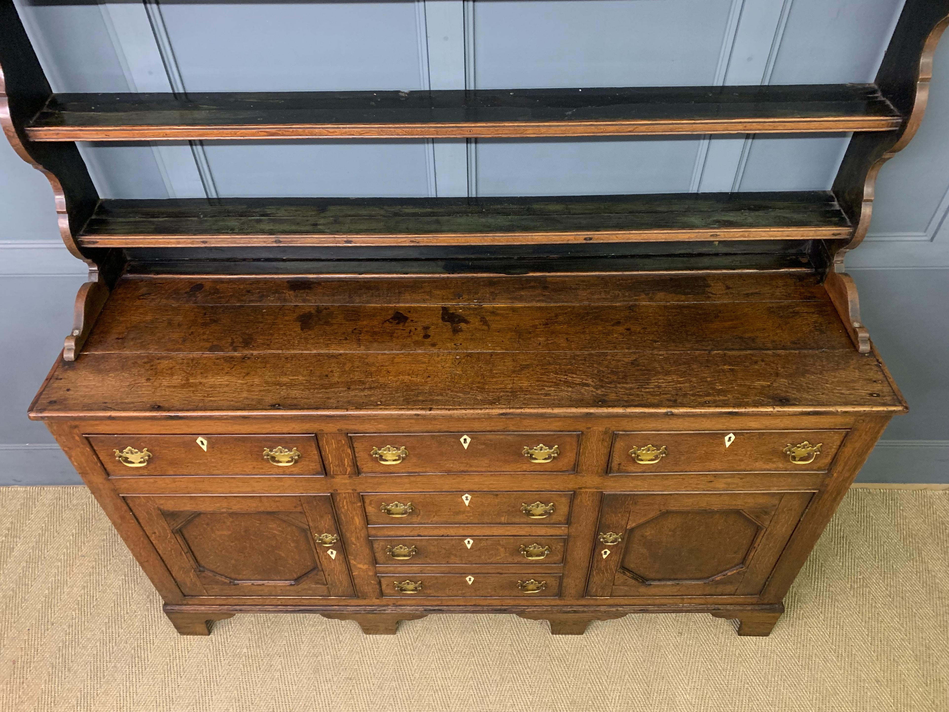 A very good early 19th century Welsh oak dresser. Well constructed in solid oak with bone escutcheons and solid brass handles. The rack with 3 shelves for display. The base section with 3 drawers over 2 cupboards and 3 dummy drawers. Cleaned and waxed in our workshops and now offered for sale with a good colour and patina. Packed full of rustic charm. Plates not included.