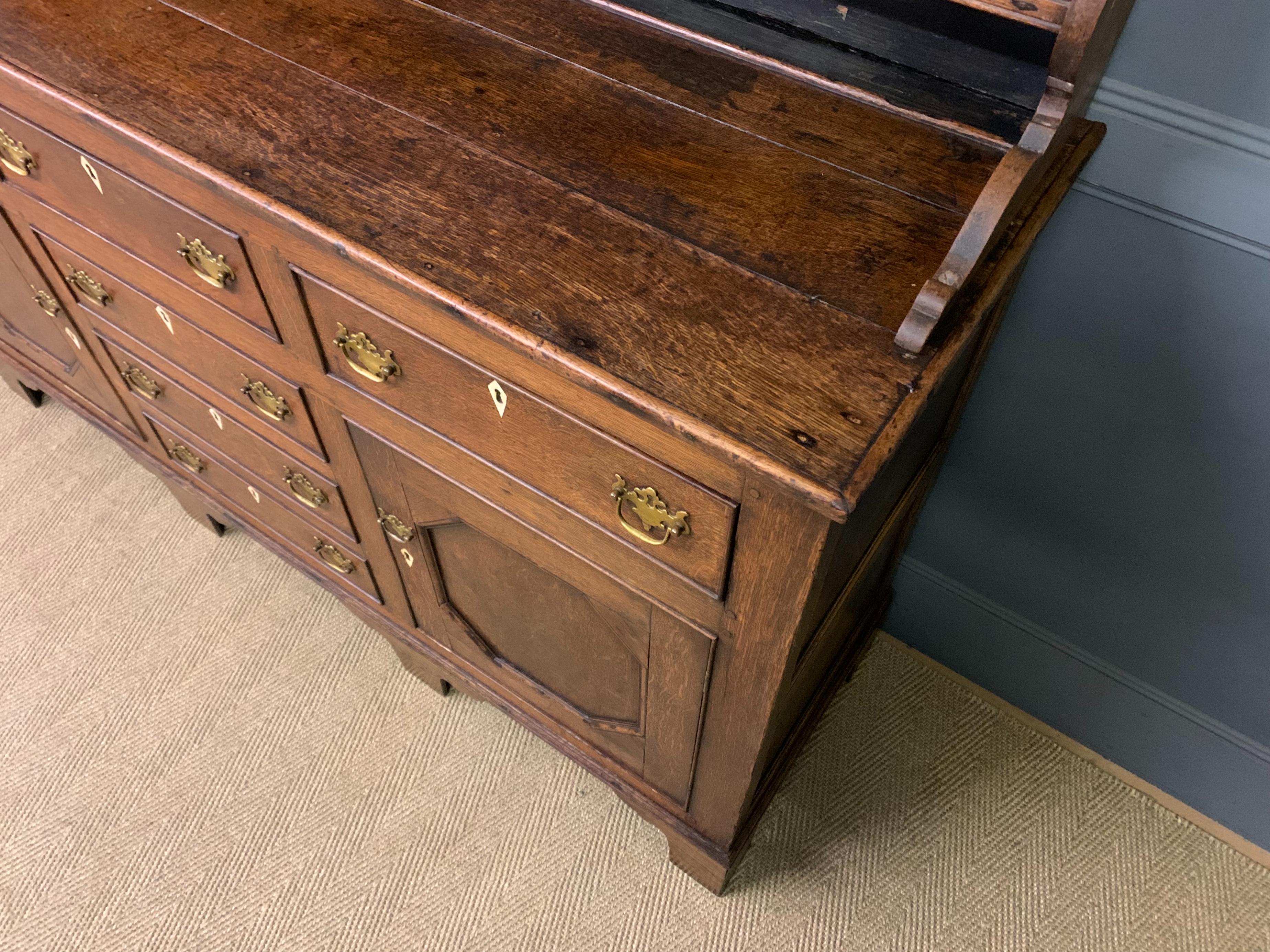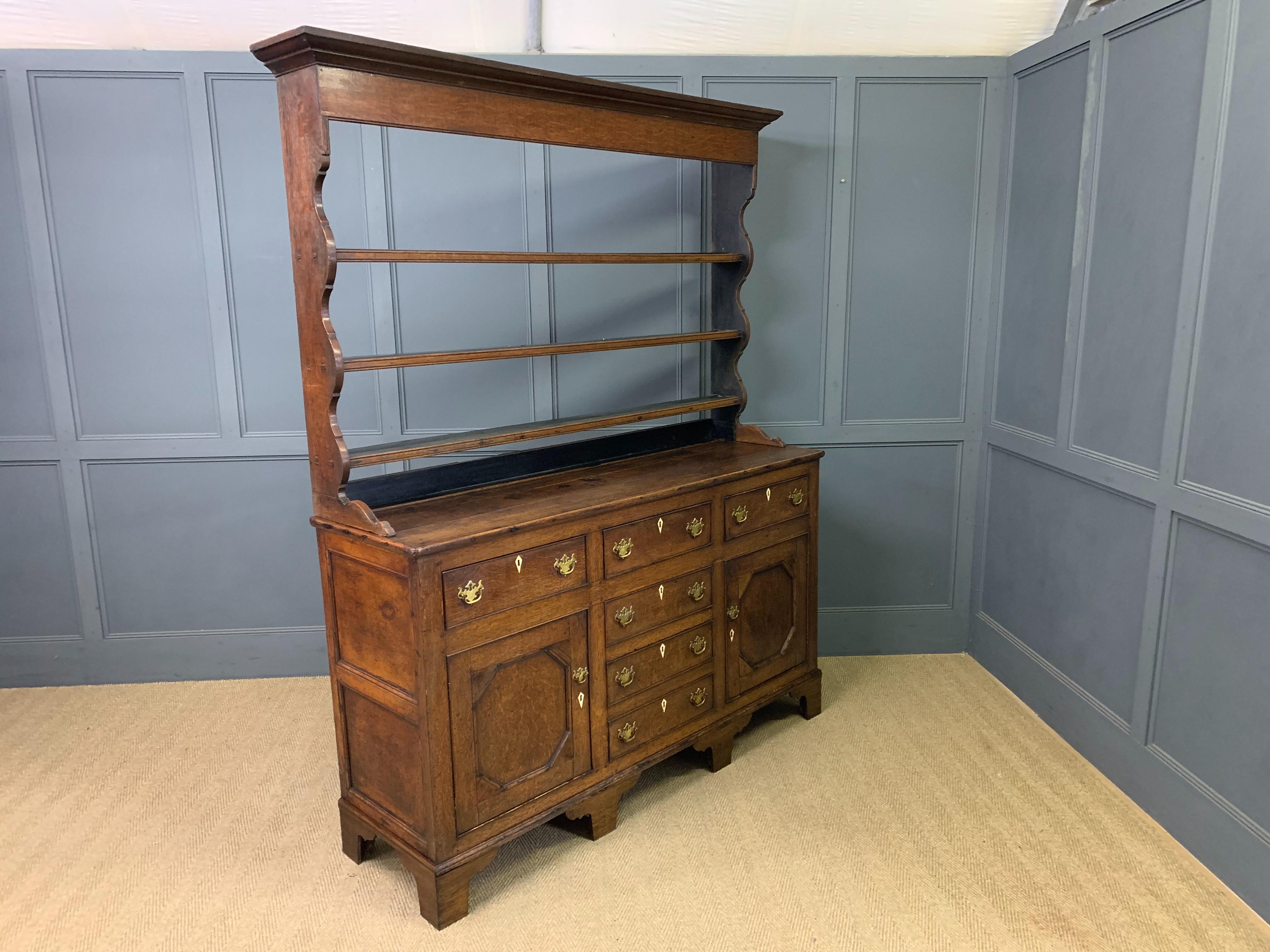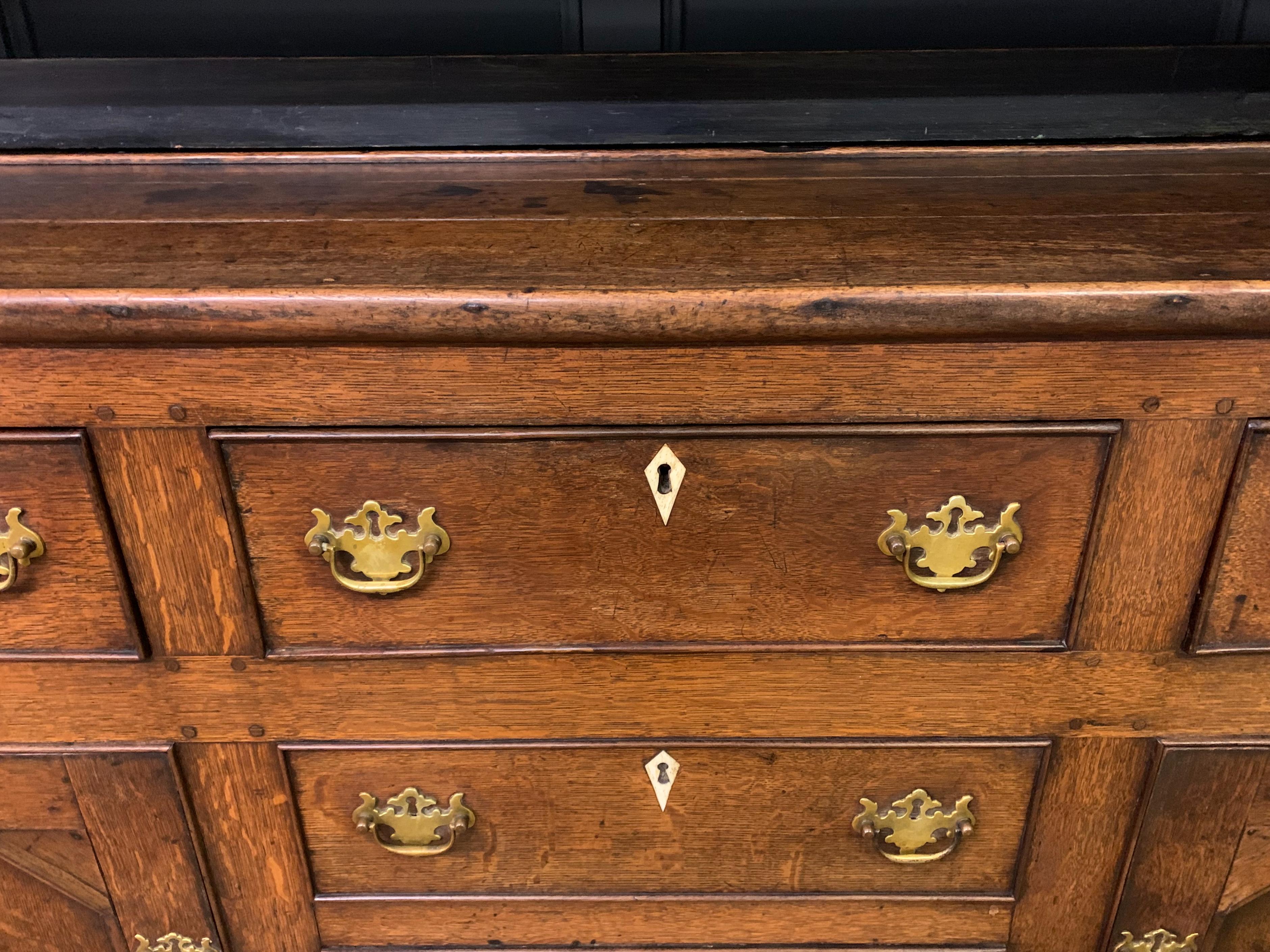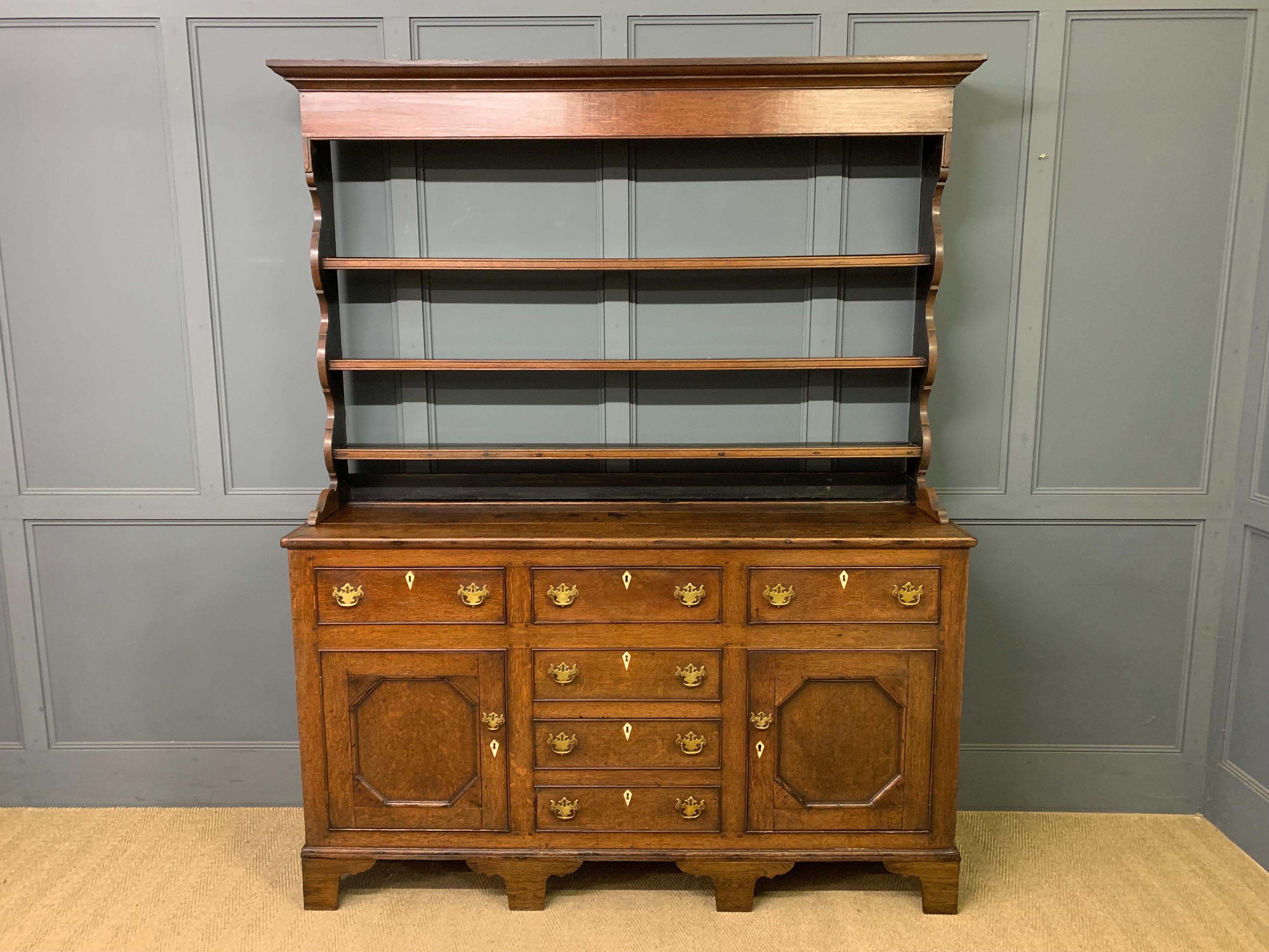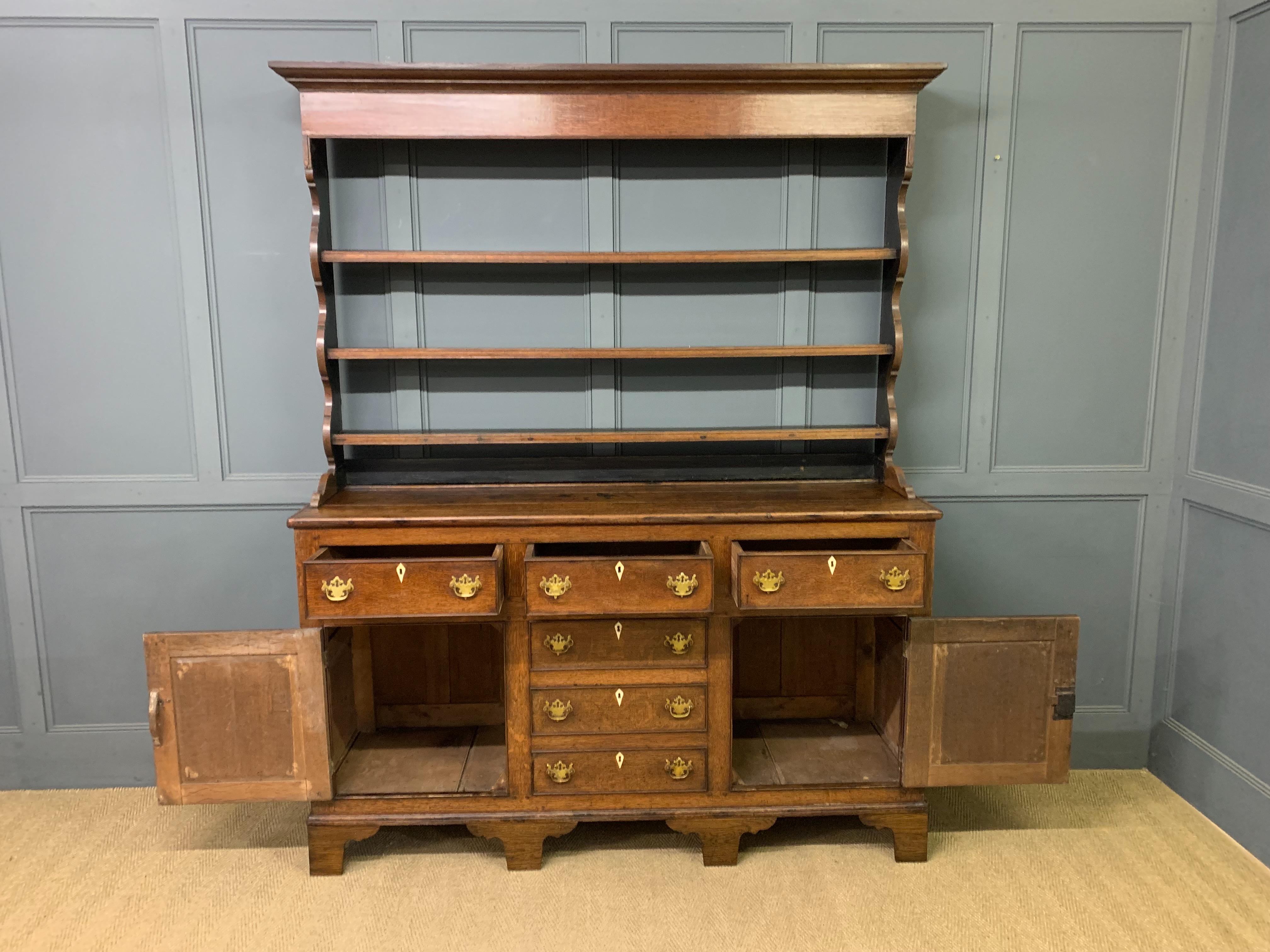 A very good early 19th century Welsh oak dresser. Well constructed in solid oak with bone escutcheons and solid brass handles. The rack with 3 shelves for display. The base section with 3 drawers over 2 cupboards and 3 dummy drawers. Cleaned and waxed in our workshops and now offered for sale with a good colour and patina. Packed full of rustic charm. Plates not included.
