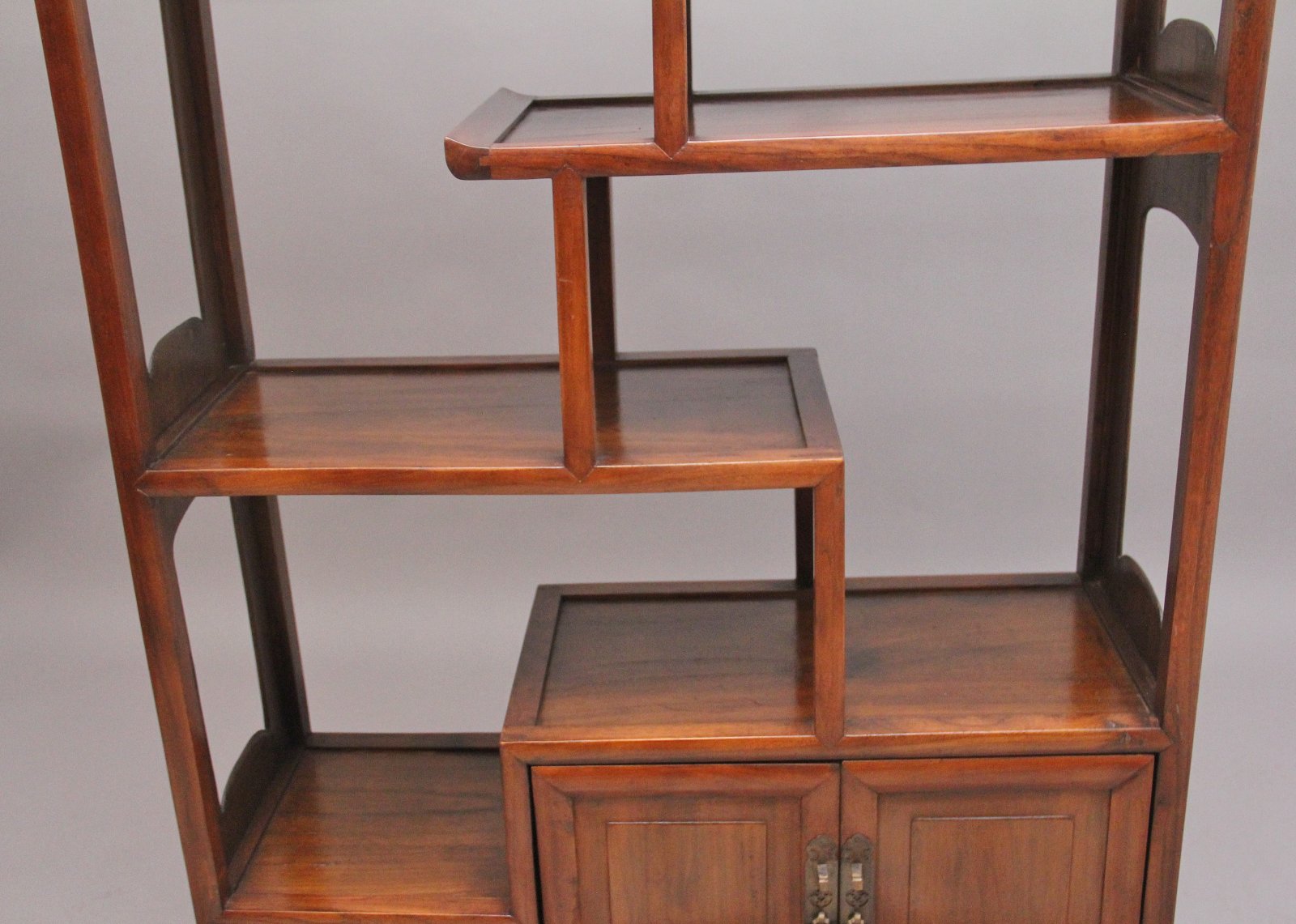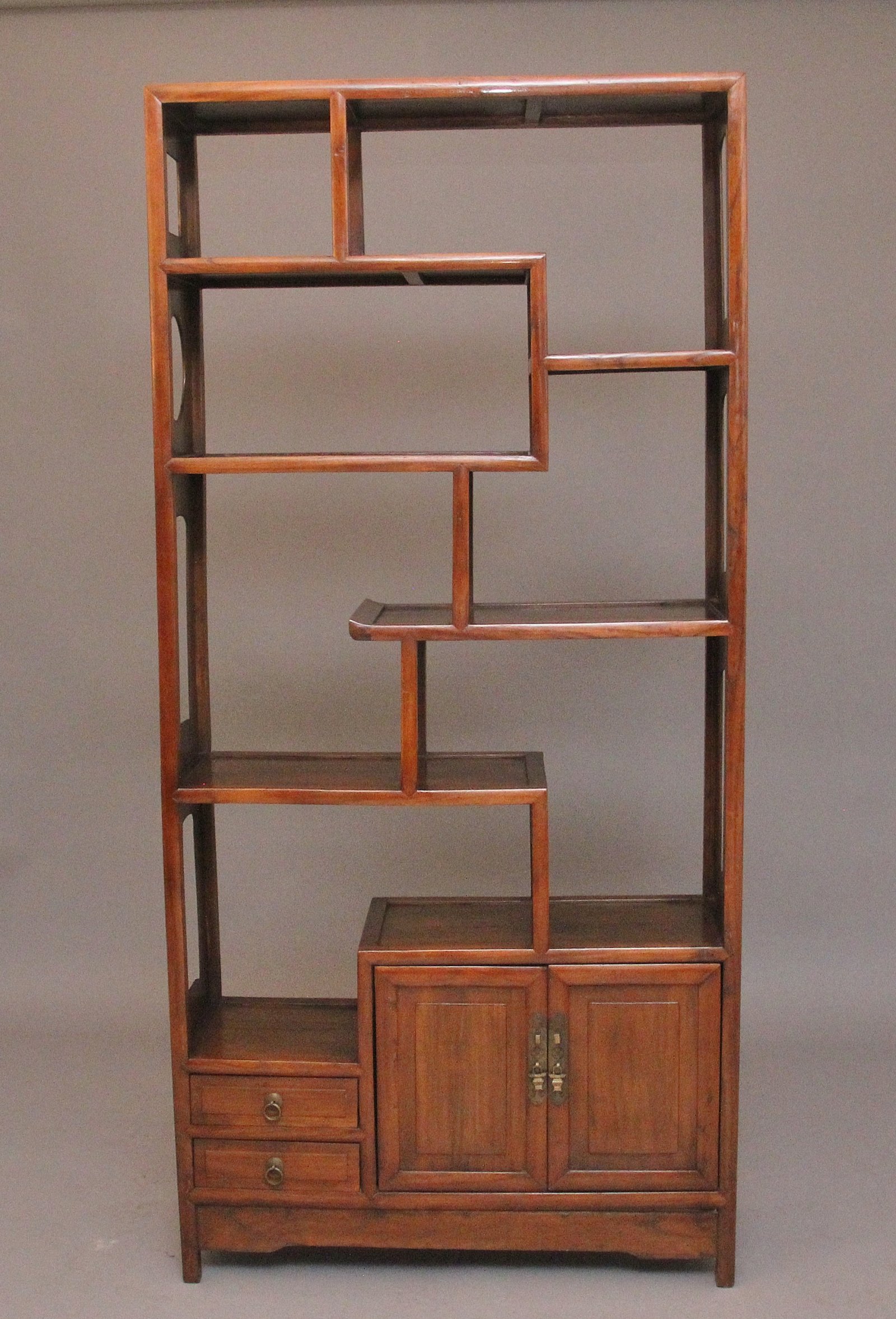Early 20th Century Chinese hardwood display cabinet, having a nice arrangement of shelves with cupboards and drawers below, original brassware, the sides of the cabinet having decorative shaped cut outs. Ideal for displaying items and the cabinet is in excellent condition. Circa 1910.