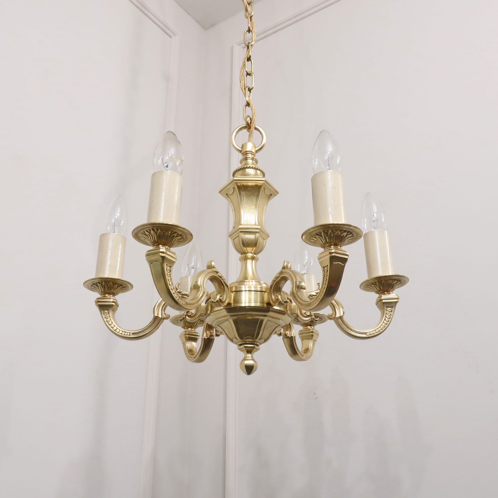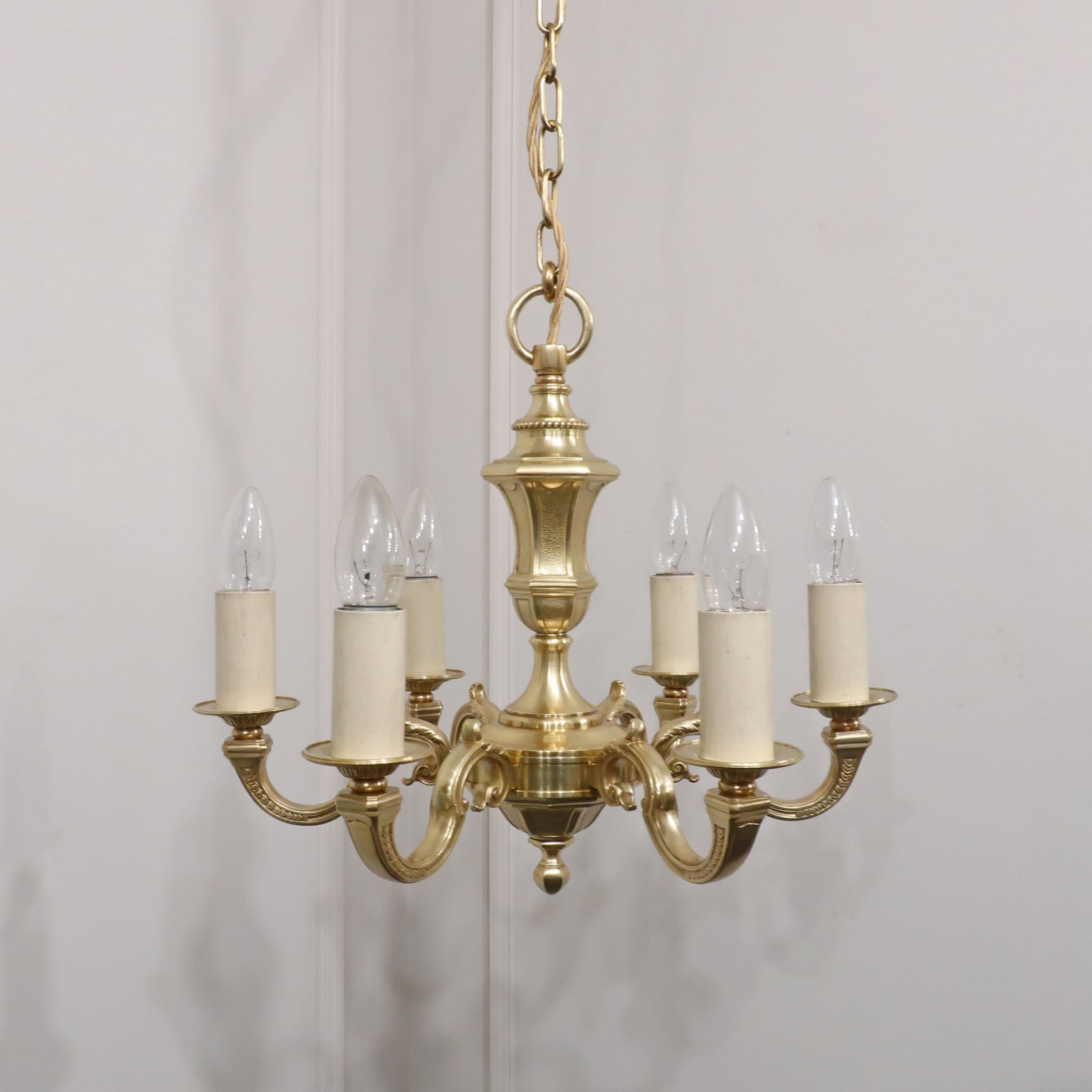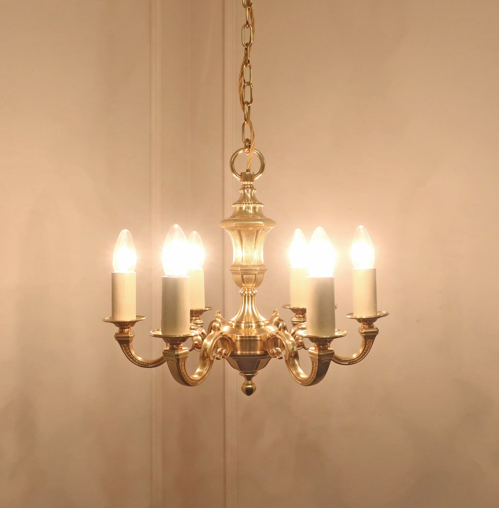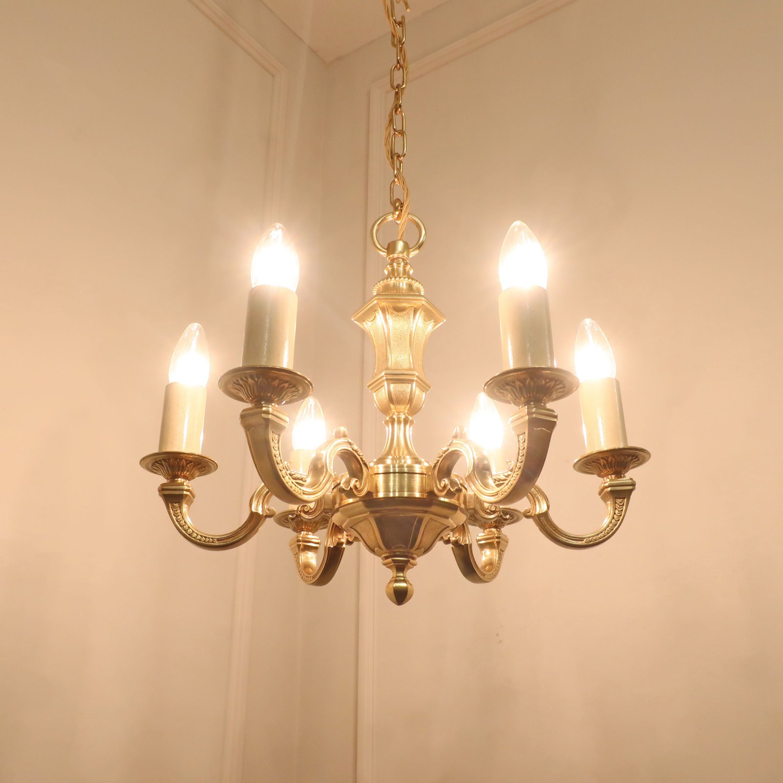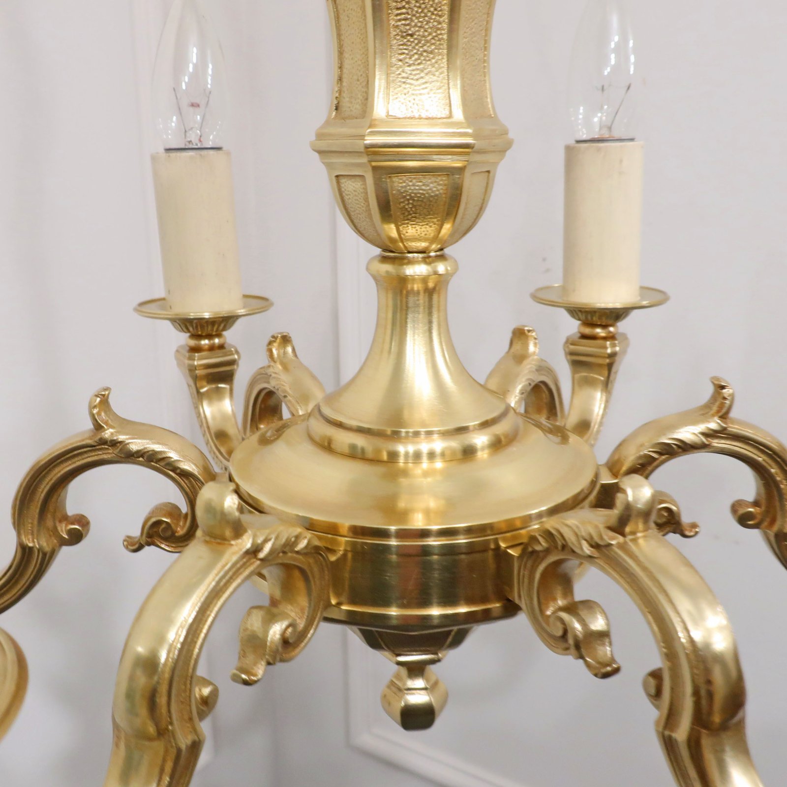 An early 20th century, French cast gilt bronze antique chandelier with hexagonal shaped tapering centre, supported by outswept socle, with hexagonal finial underneath. The light has six scroll arms with leaf detail, finishing with leaf detail bobeche trays/