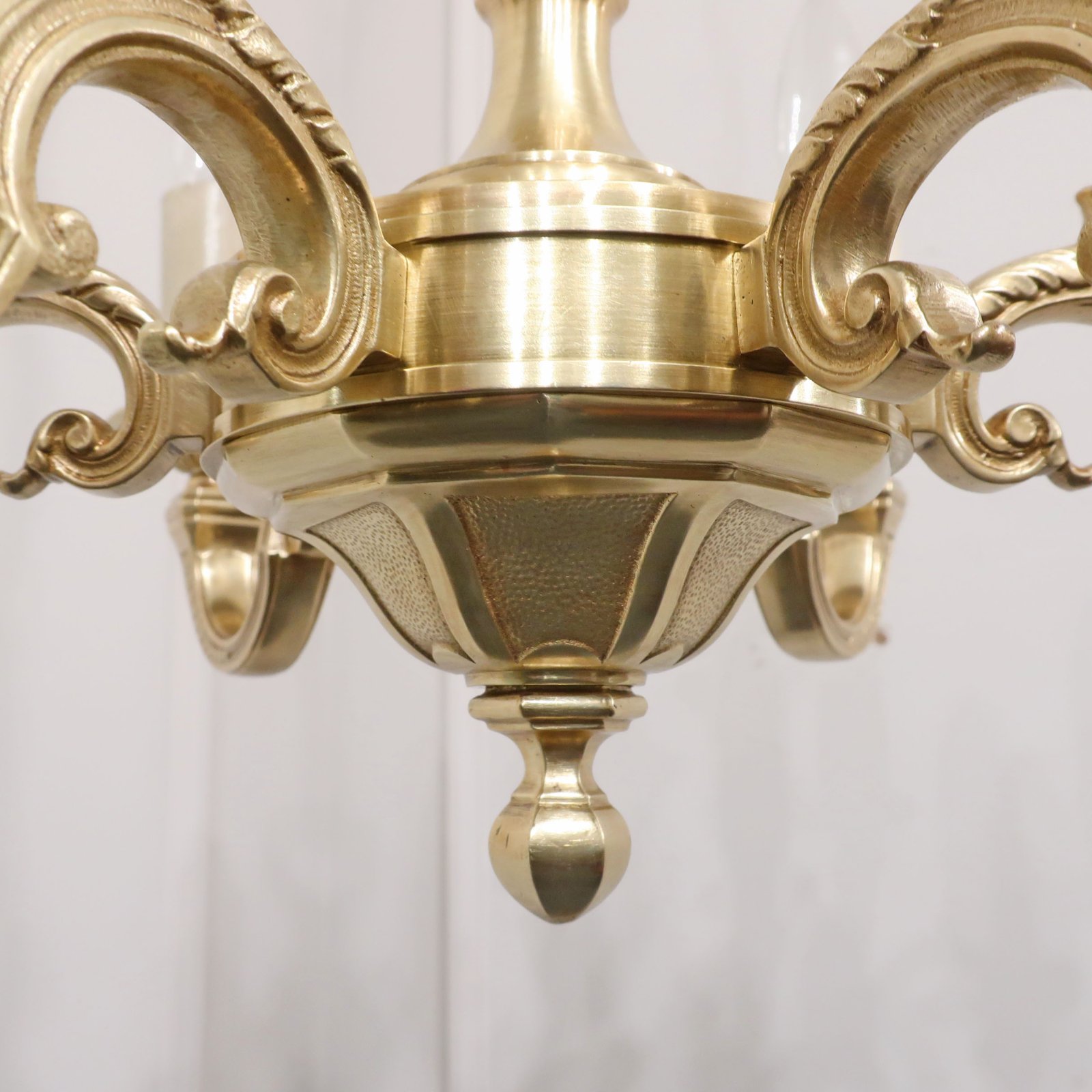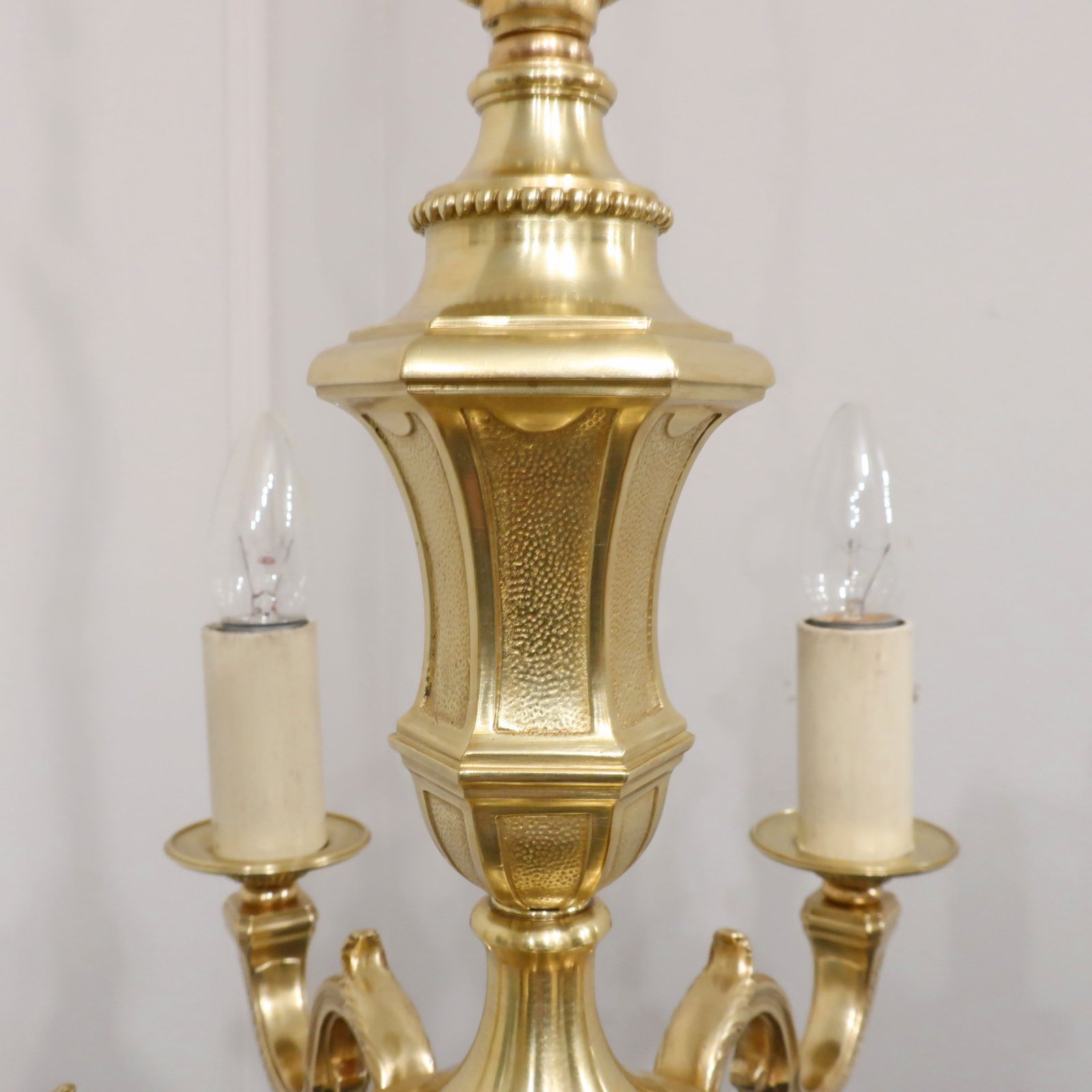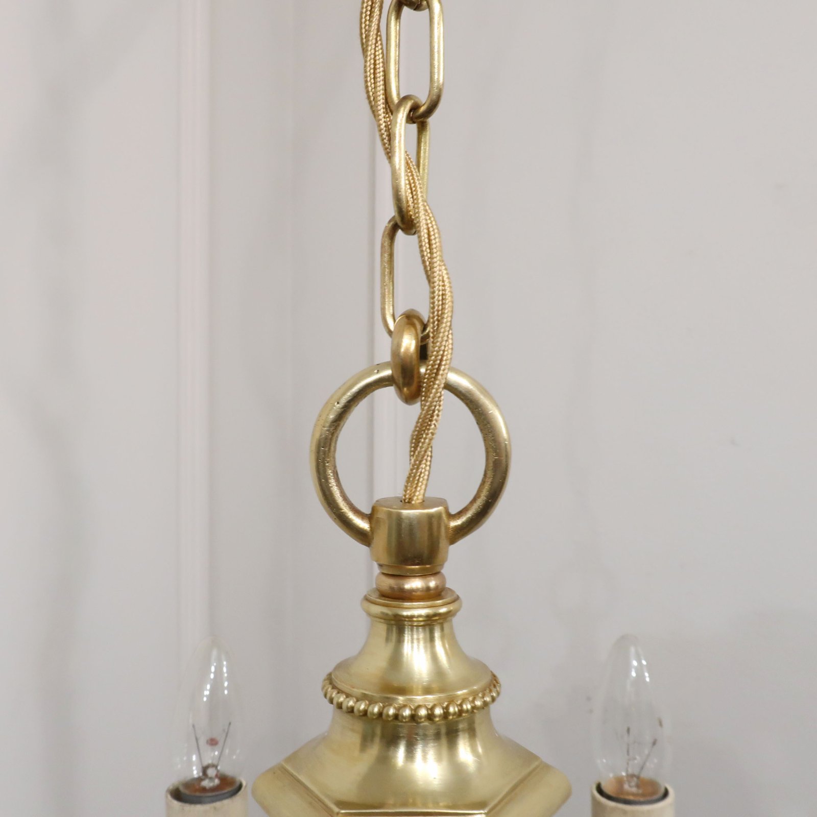 The light hangs on an adjustable 23 cm chain and comes with a ceiling rose. The gilt bronze has been cleaned and lacquered to prevent tarnishing, and the light has been rewired and is in working order.