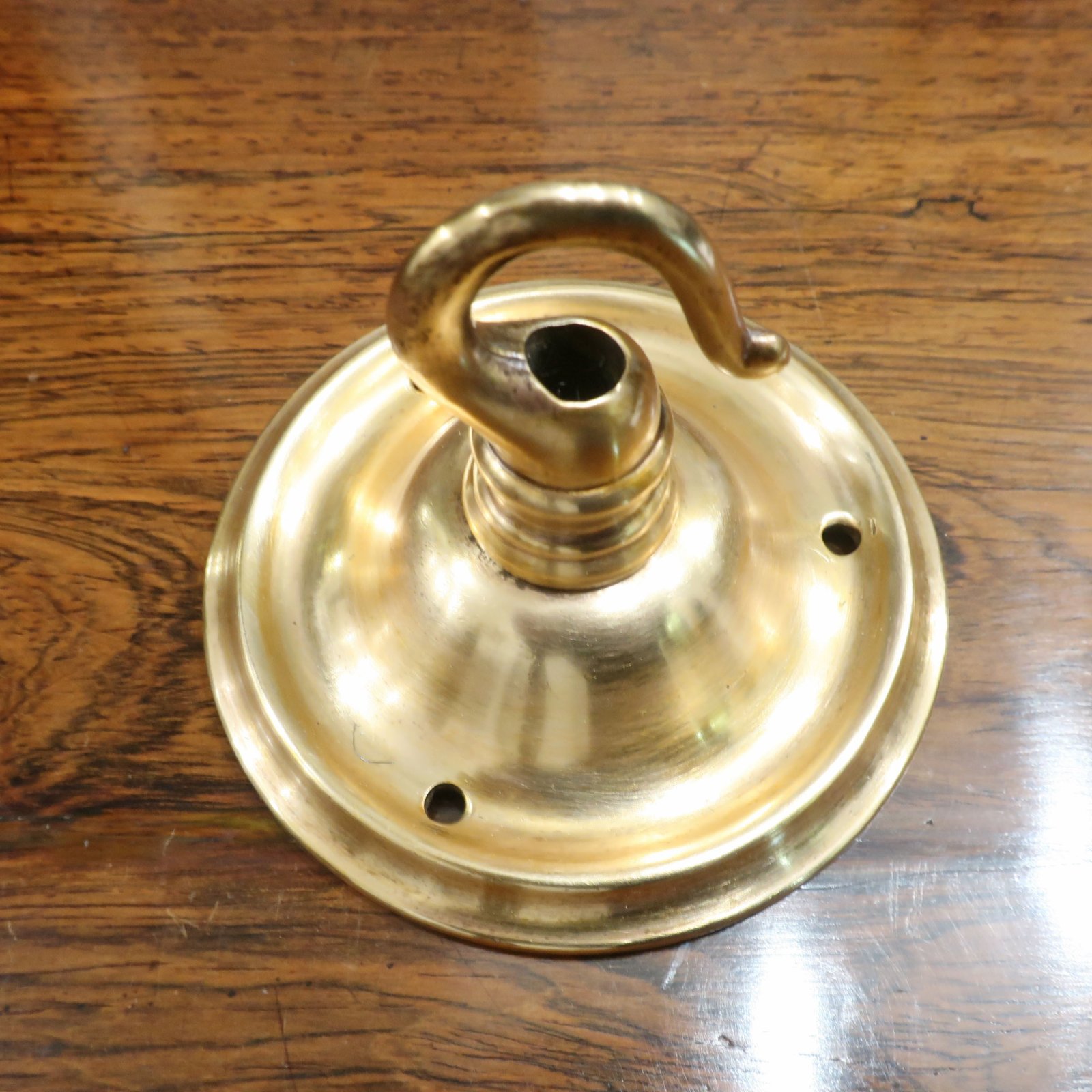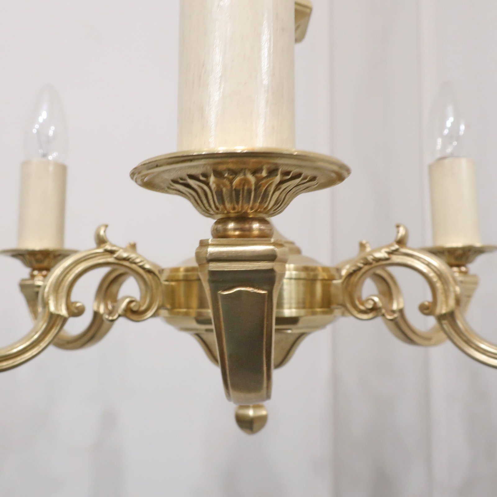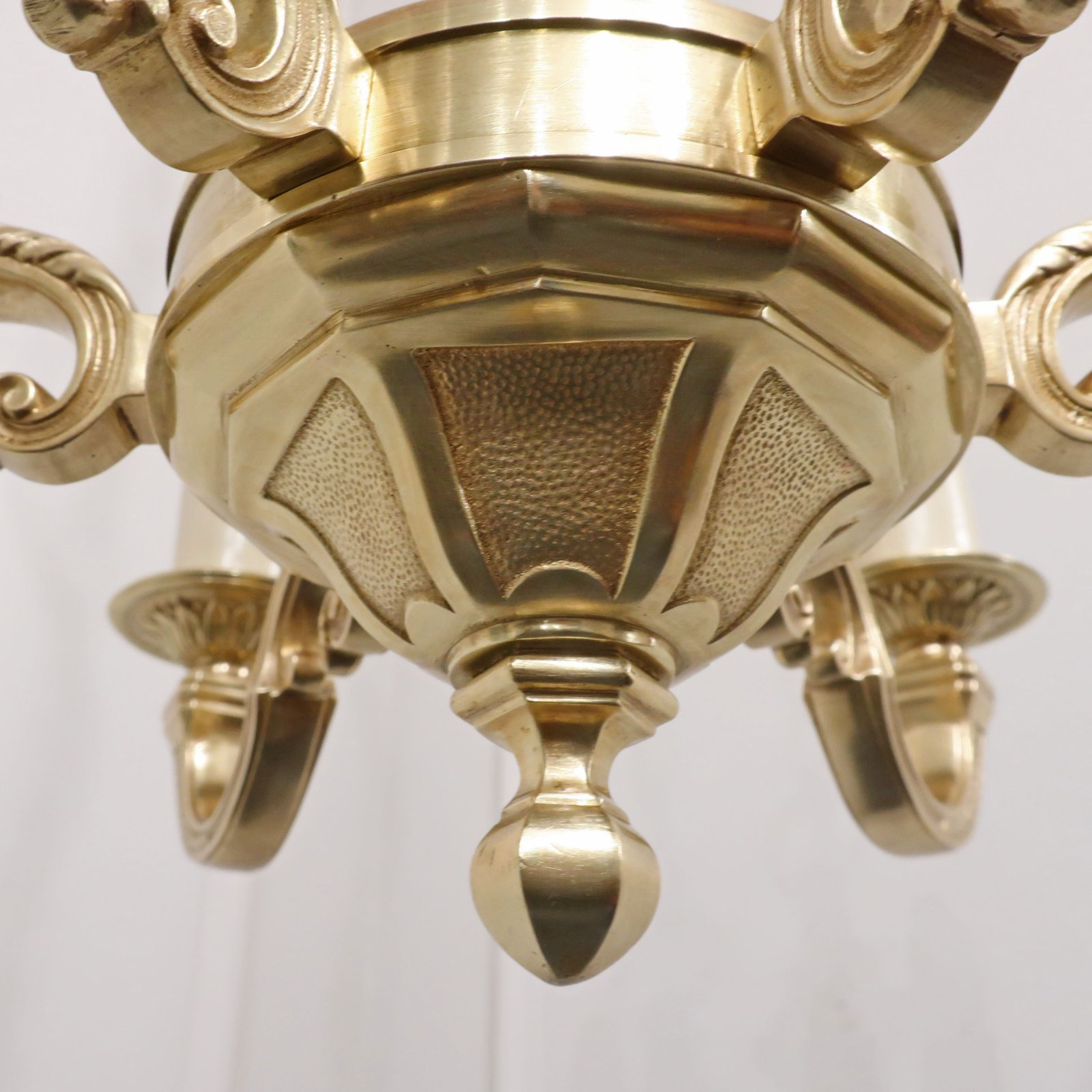 The light hangs on an adjustable 23 cm chain and comes with a ceiling rose. The gilt bronze has been cleaned and lacquered to prevent tarnishing, and the light has been rewired and is in working order.