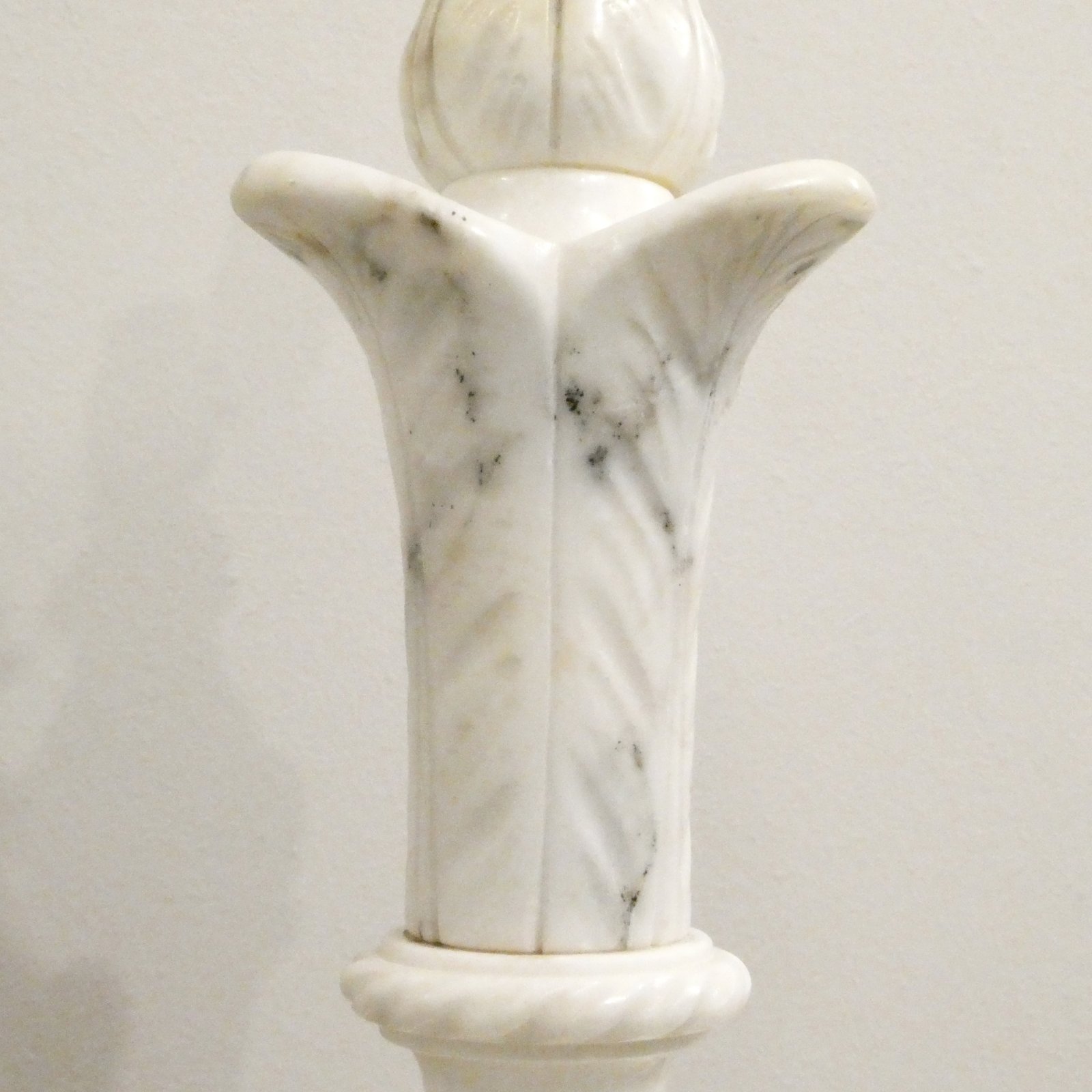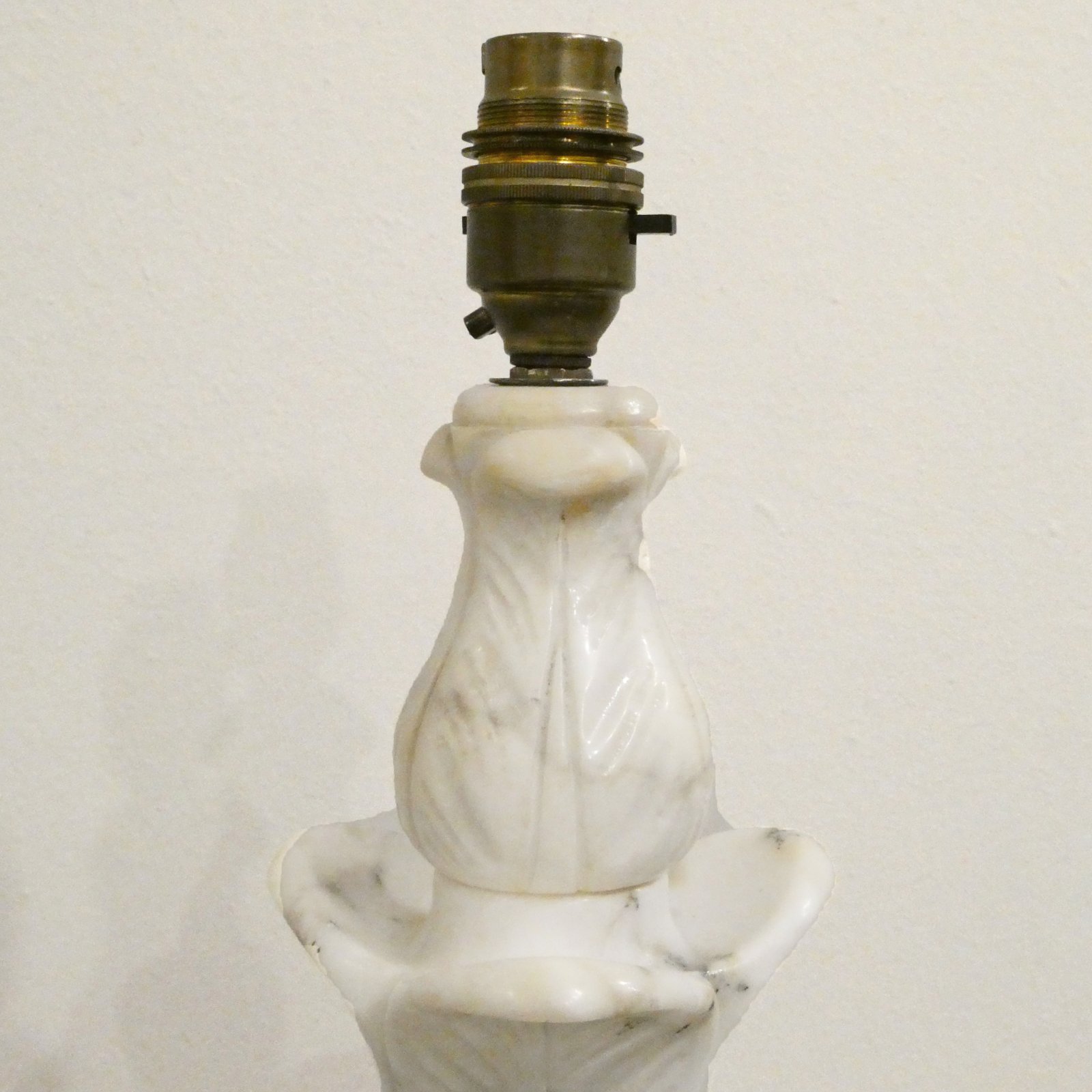 A good quality early 20th century, Italian alabaster antique table lamp with carved gadroon body, rope twist detail and scrolling foliate design, standing on a square plinth base.