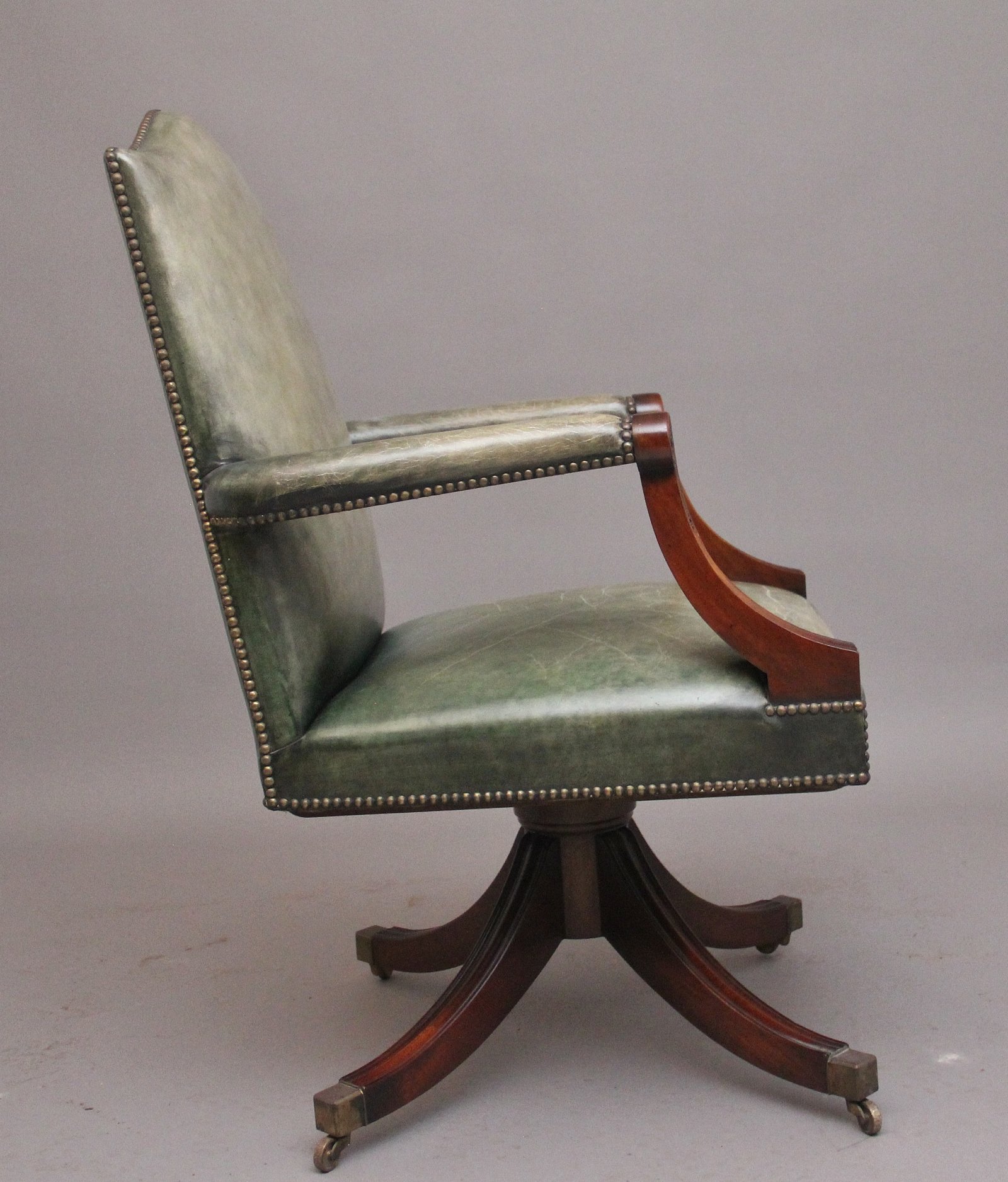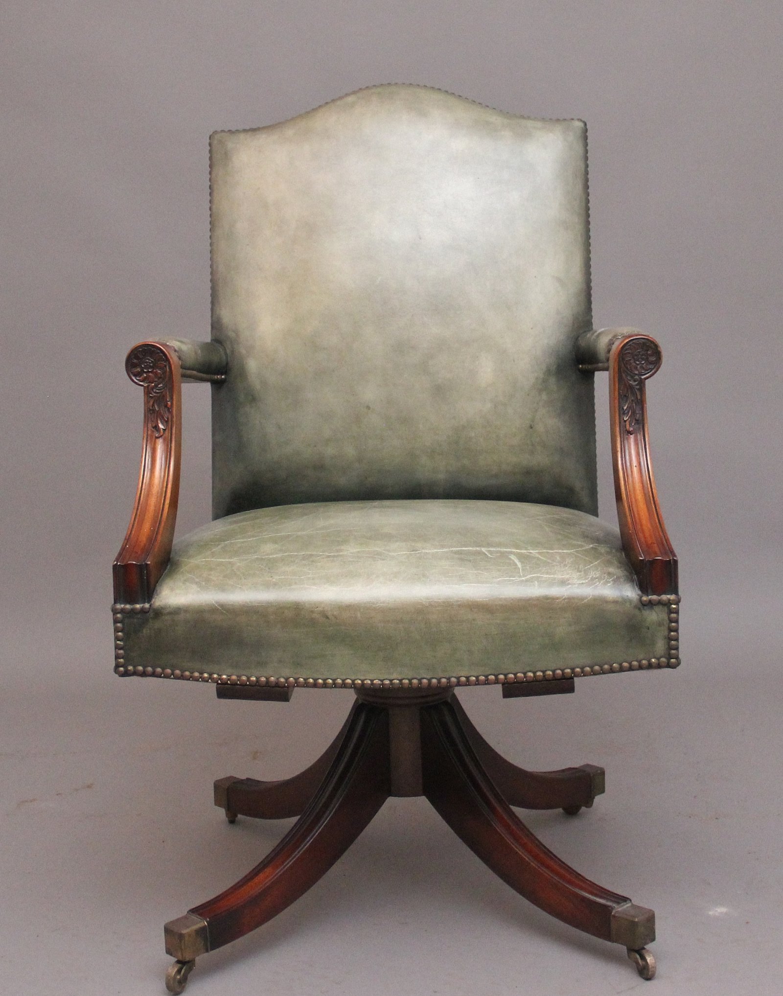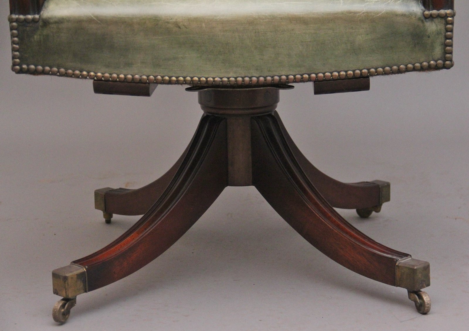 A lovely quality early 20th Century mahogany swivel desk chair, having a shaped high back and cushioned seat upholstered in a light green leather with brass stud decoration, mahogany arm supports with crisp carved decoration, supported on a mahogany column with four splay legs terminating on brass cap and castors. Circa 1920.
