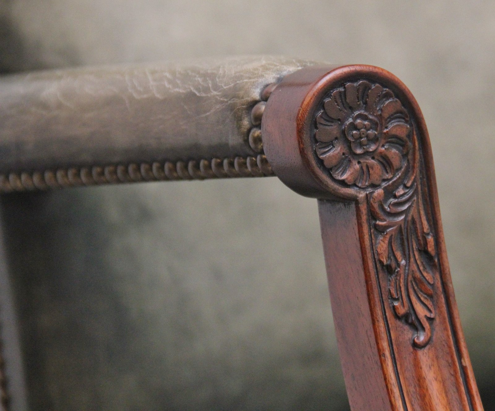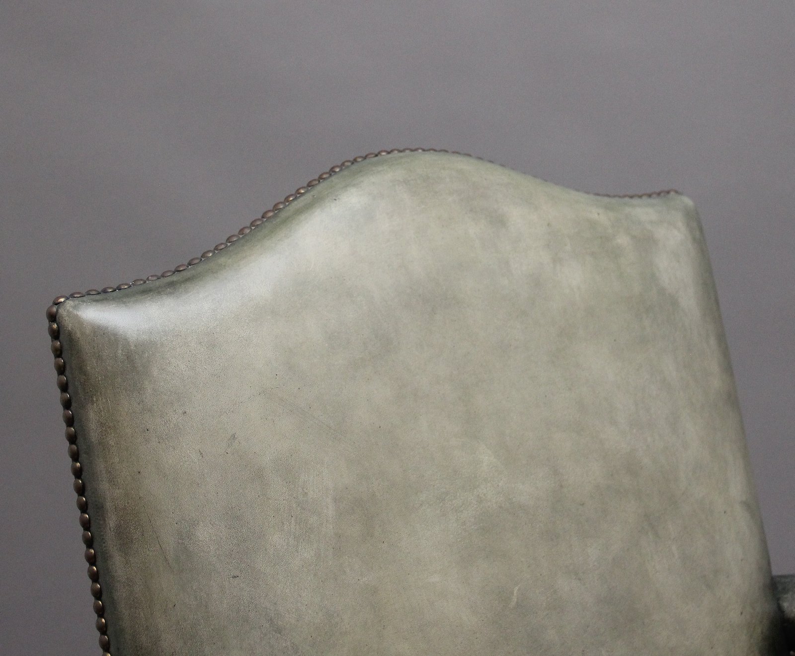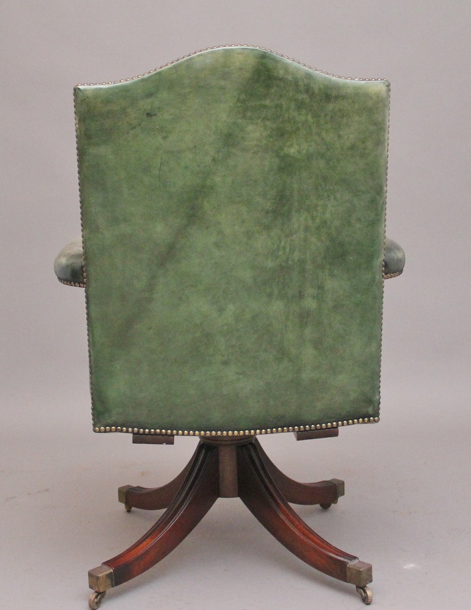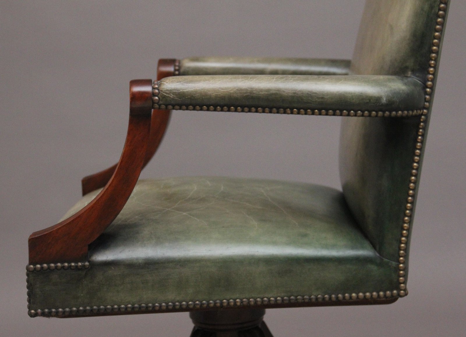A lovely quality early 20th Century mahogany swivel desk chair, having a shaped high back and cushioned seat upholstered in a light green leather with brass stud decoration, mahogany arm supports with crisp carved decoration, supported on a mahogany column with four splay legs terminating on brass cap and castors. Circa 1920.