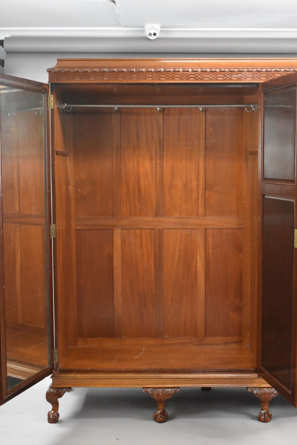 A fine quality Edwardian flame mahogany triple wardrobe of excellent colour and craftsmanship. The three panelled doors feature beautifully figured mahogany veneers with carved corner details and an intricately pierced cornice above. The interior is fitted with a combination of hanging space, adjustable shelves, and drawers, providing ample storage. The wardrobe stands on elegant cabriole legs with acanthus carving and ball-and-claw feet, showcasing refined Edwardian design and construction.