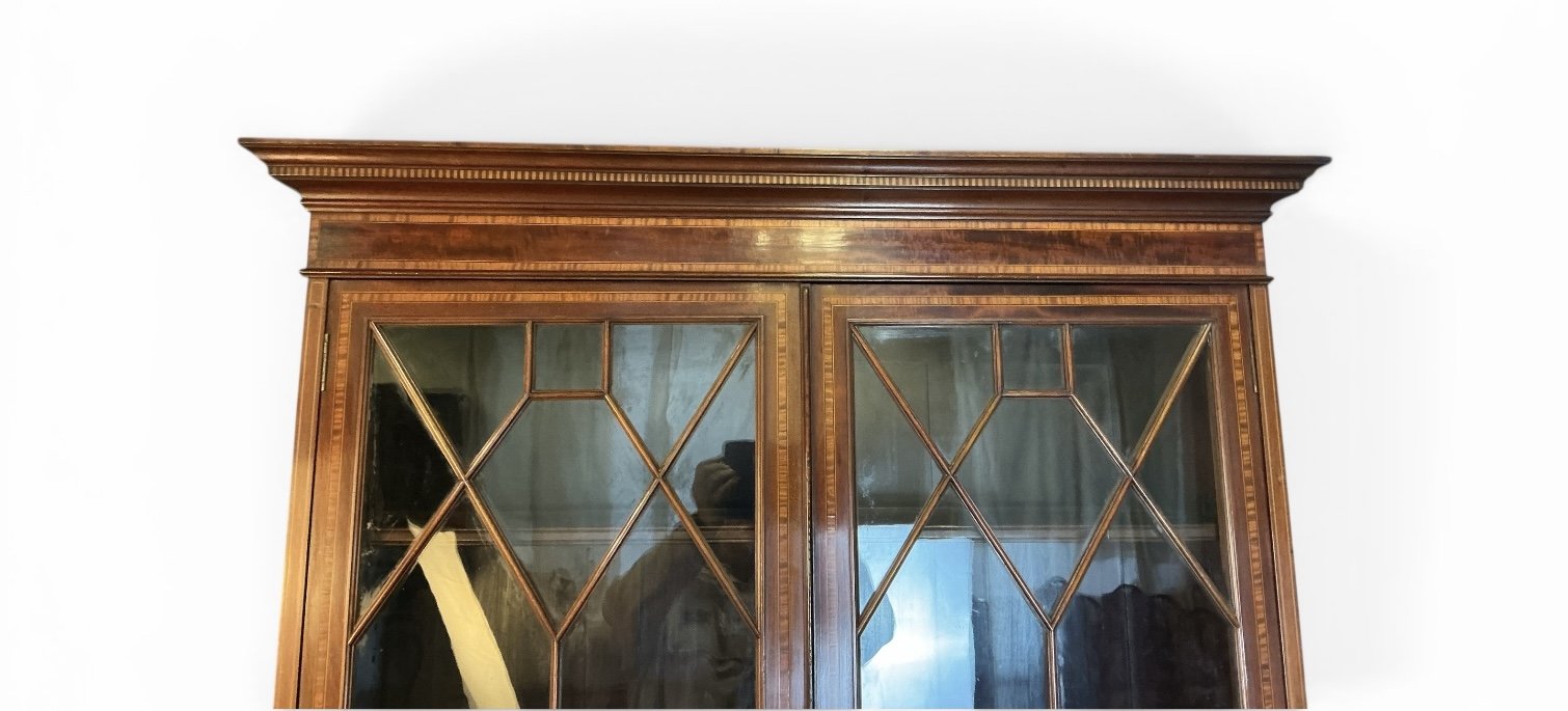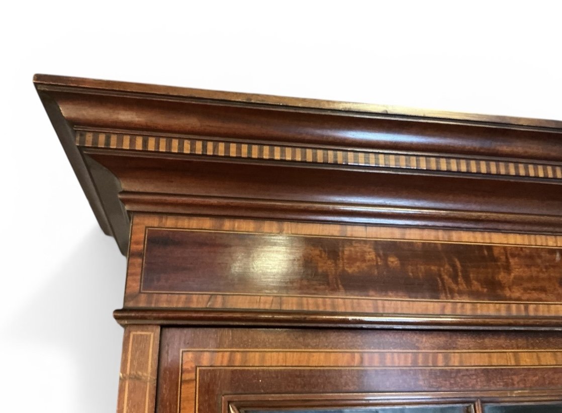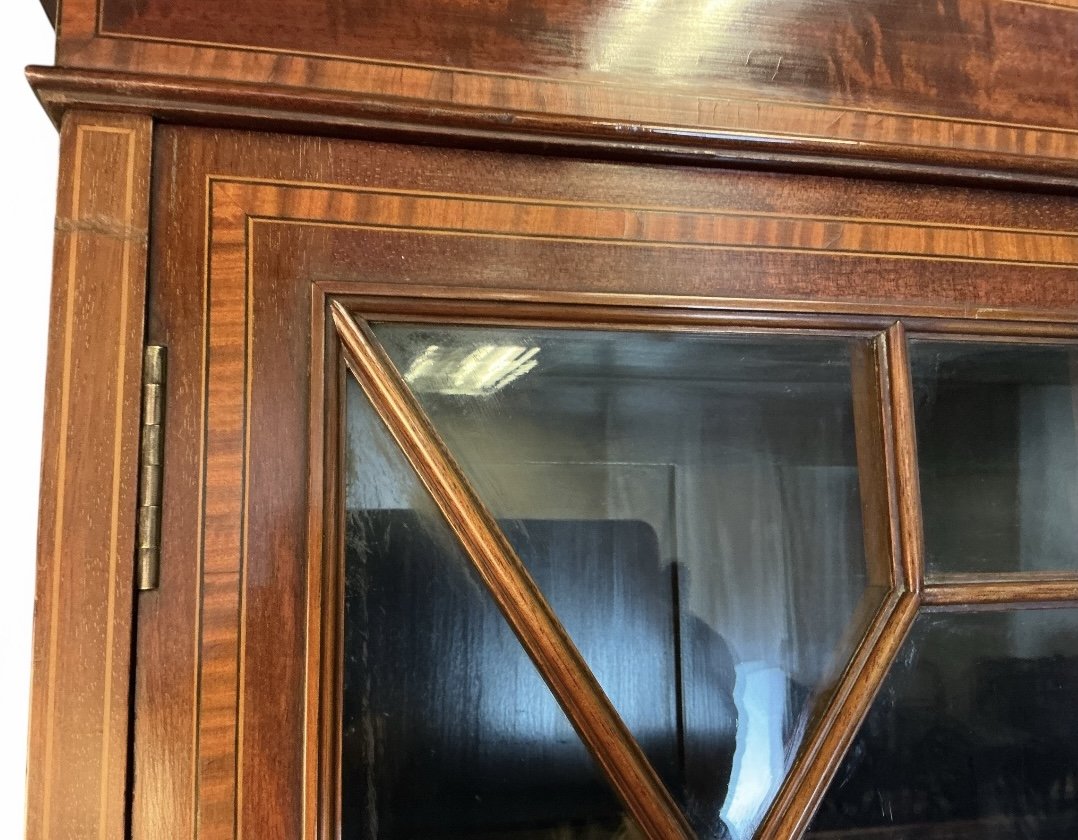 Good quality Edwardian line inlaid and cross banded mahogany bookcase, having a moulded cornice above two glazed doors, the upper section has four adjustable shelves. The lower section has two drawers furnished with the original brass swan neck handles above two panelled doors and standing on bracket feet