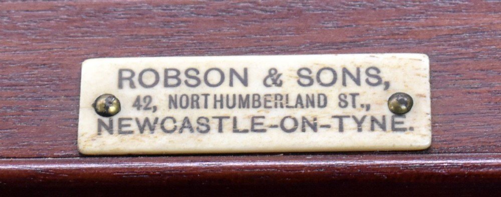 * Maker’s plaque: Robson & Sons, 42 Northumberland Street, Newcastle-on-Tyne