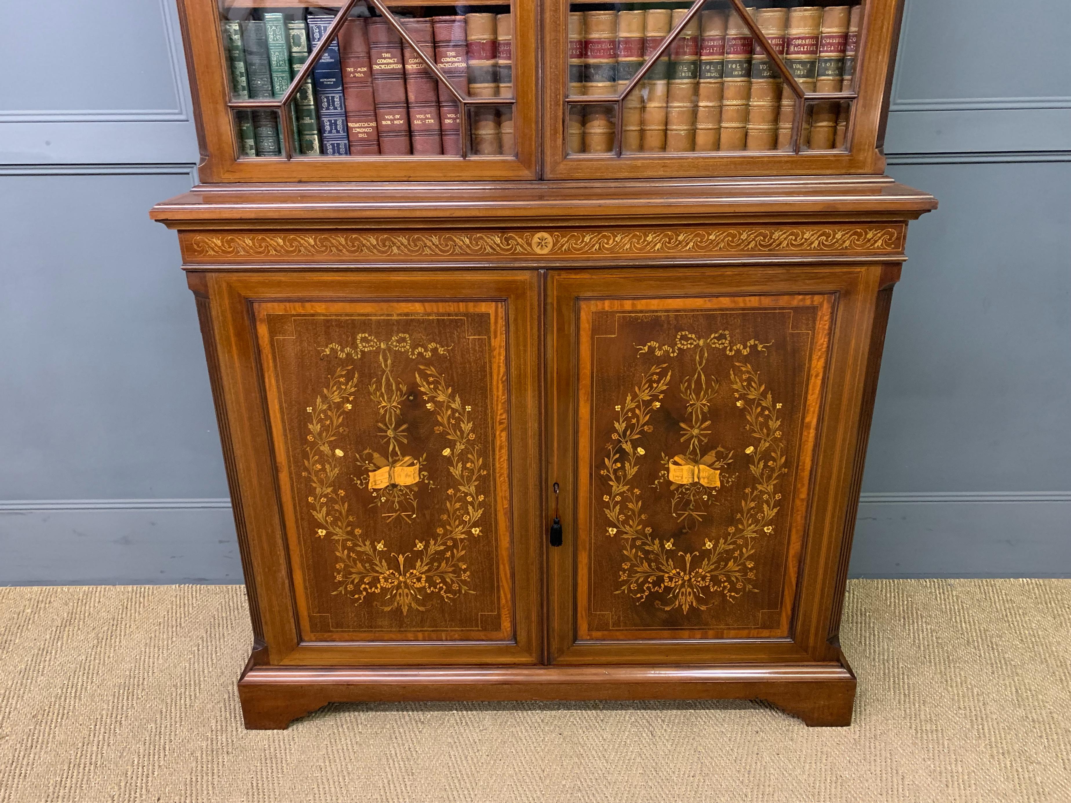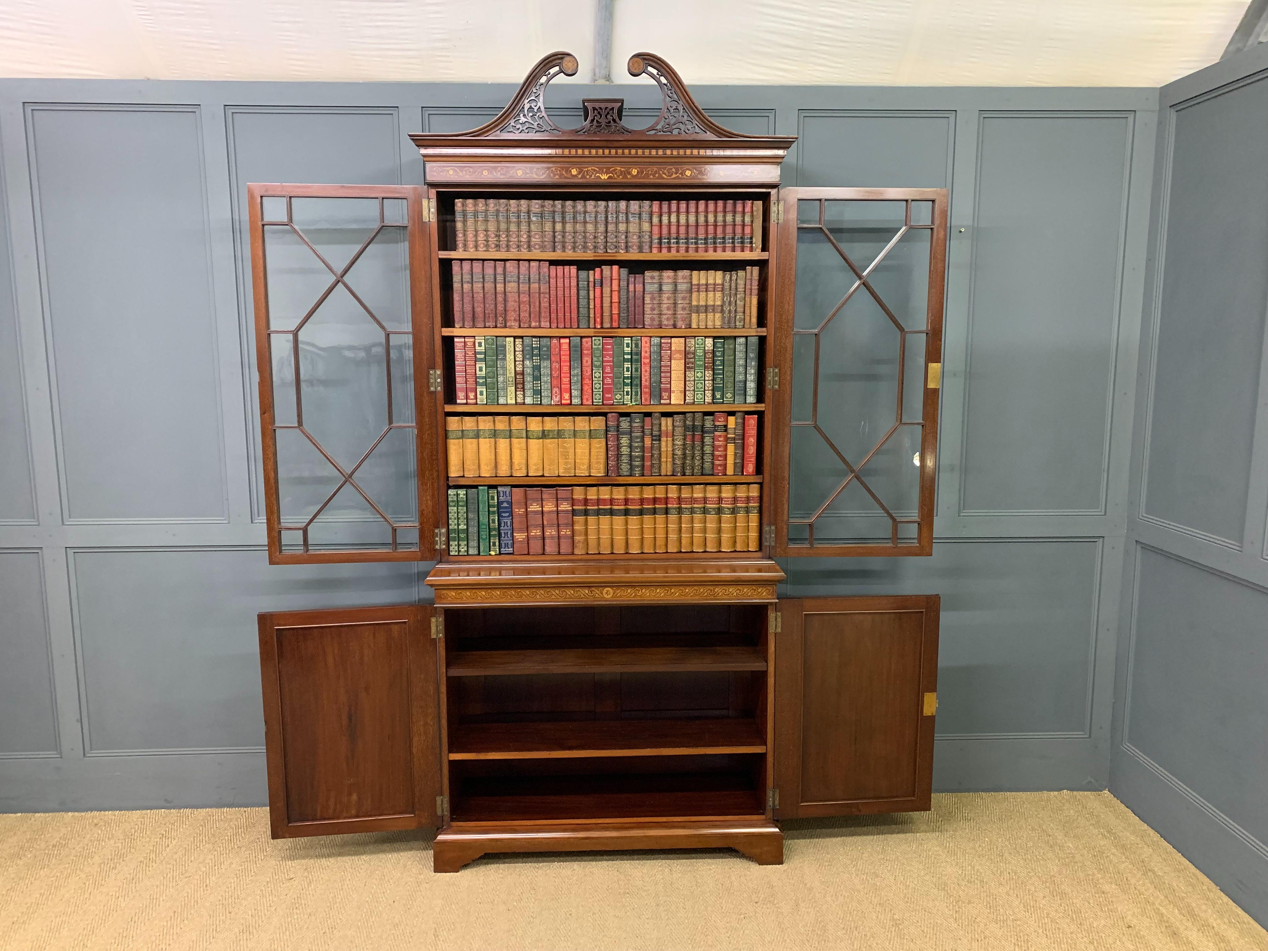 A superb quality inlaid mahogany bookcase by Edwards and Roberts of London. Late 19th century and of fine construction in solid mahogany and attractive mahogany veneers. Embellished with boxwood stringing and satinwood banding throughout. With floral inlaid detailing to the freeze and with profuse floral marquetry inlaid panels to the cupboard doors. The bookcase top with a pair of glazed doors which open to access an interior with adjustable shelving. The top section is surmounted by a broken arch swan neck pediment in open fretwork. The bottom section with a pair of cupboard doors which open to reveal an interior with adjustable shelving. All doors are lockable (keys supplied). Both bottom and top sections with canted corners. Sympathetically refinished in our workshops to a very high standard. Now offered for sale in excellent condition with a rich colour and patina. Splits into two sections for ease of installation.