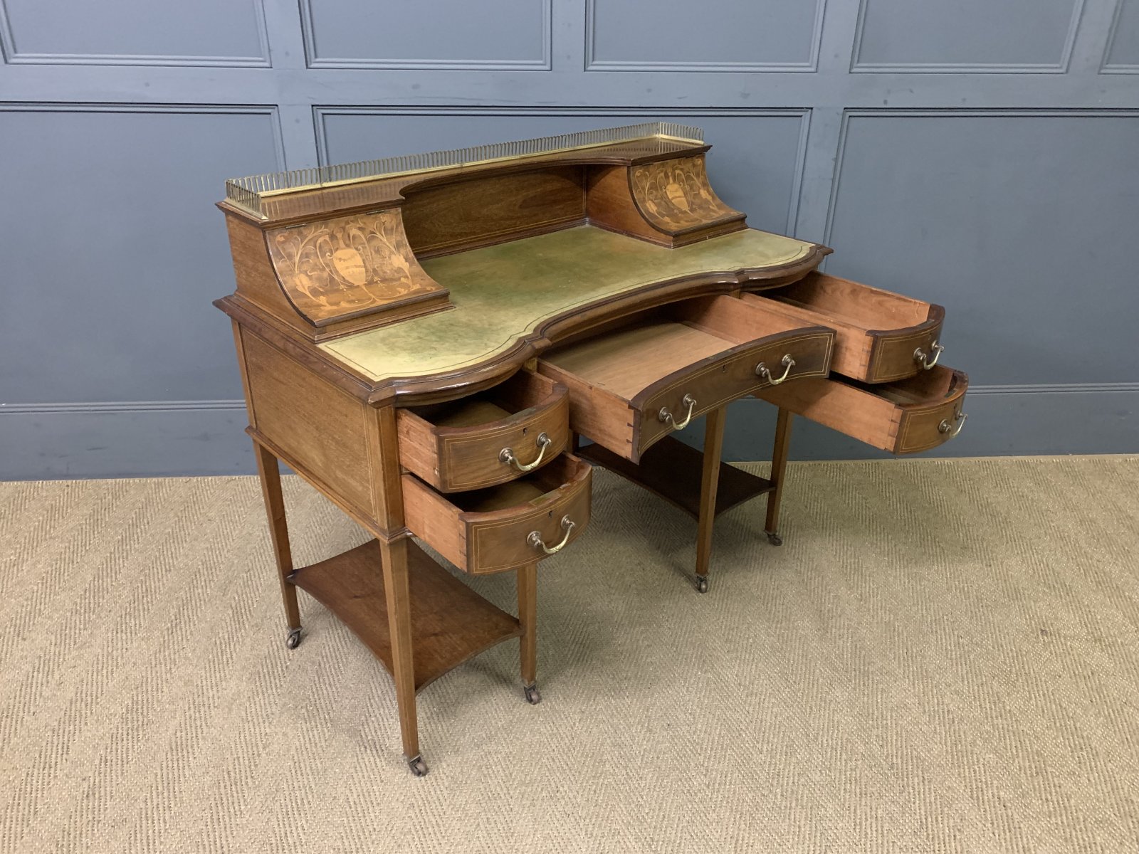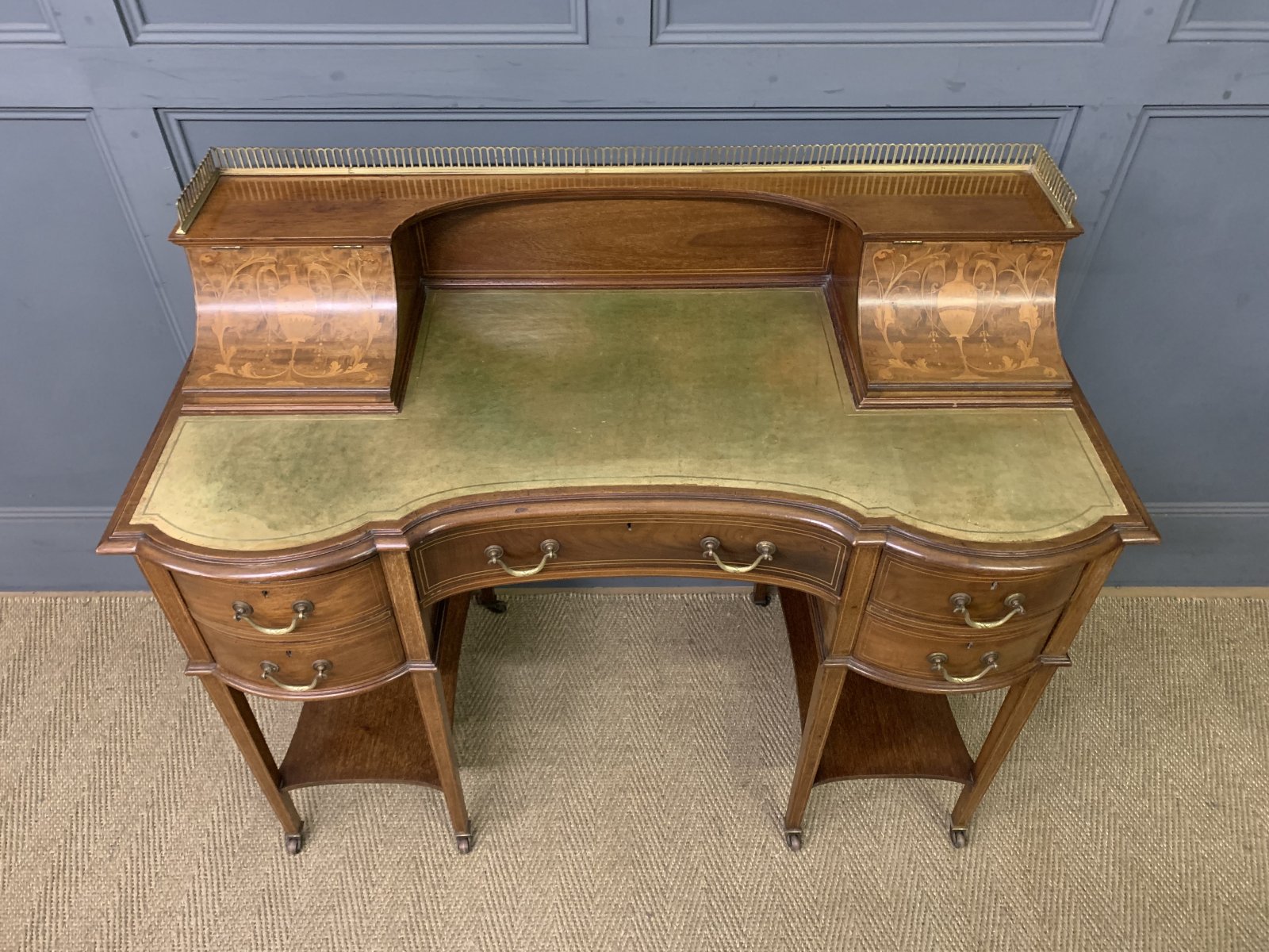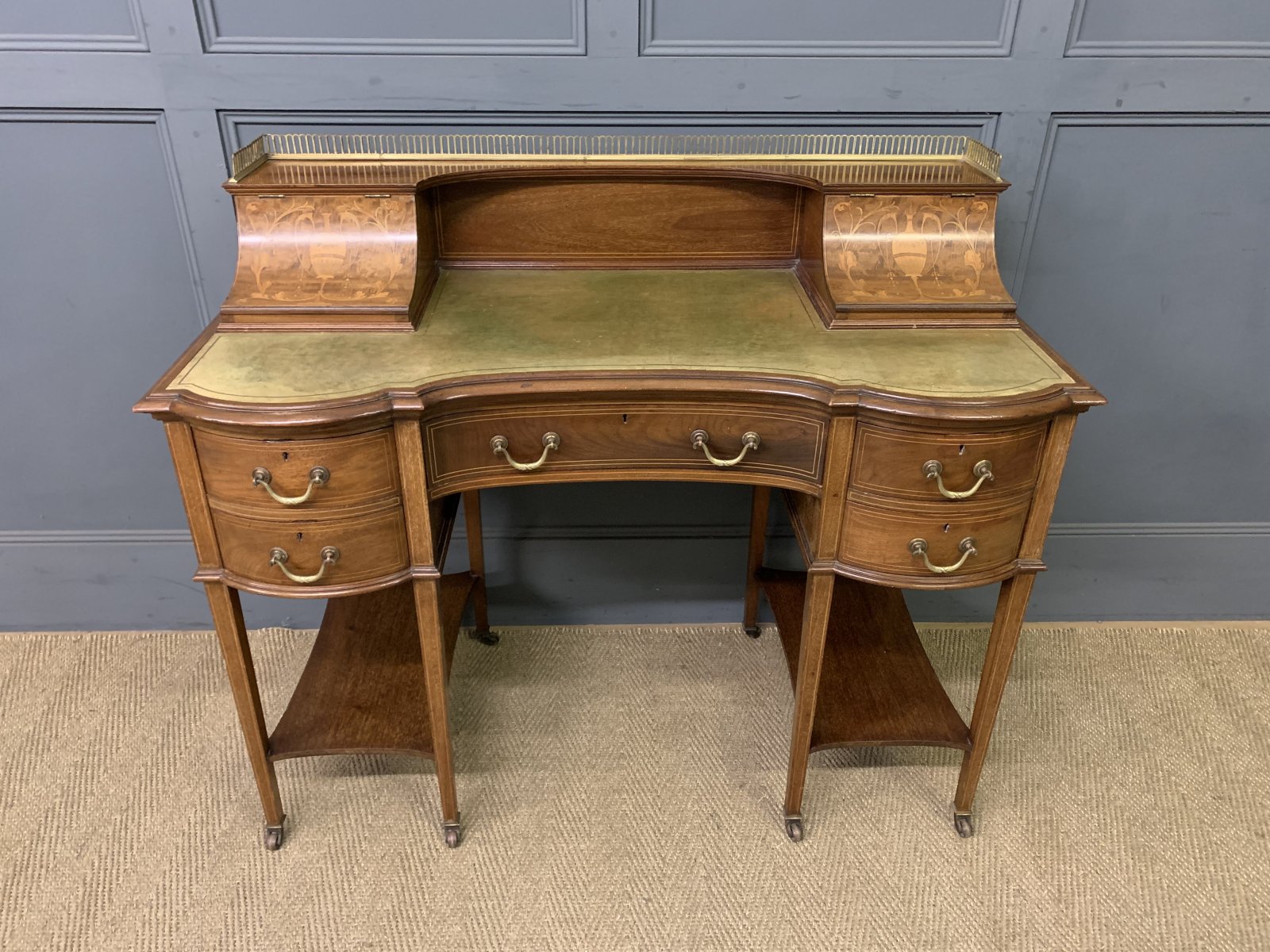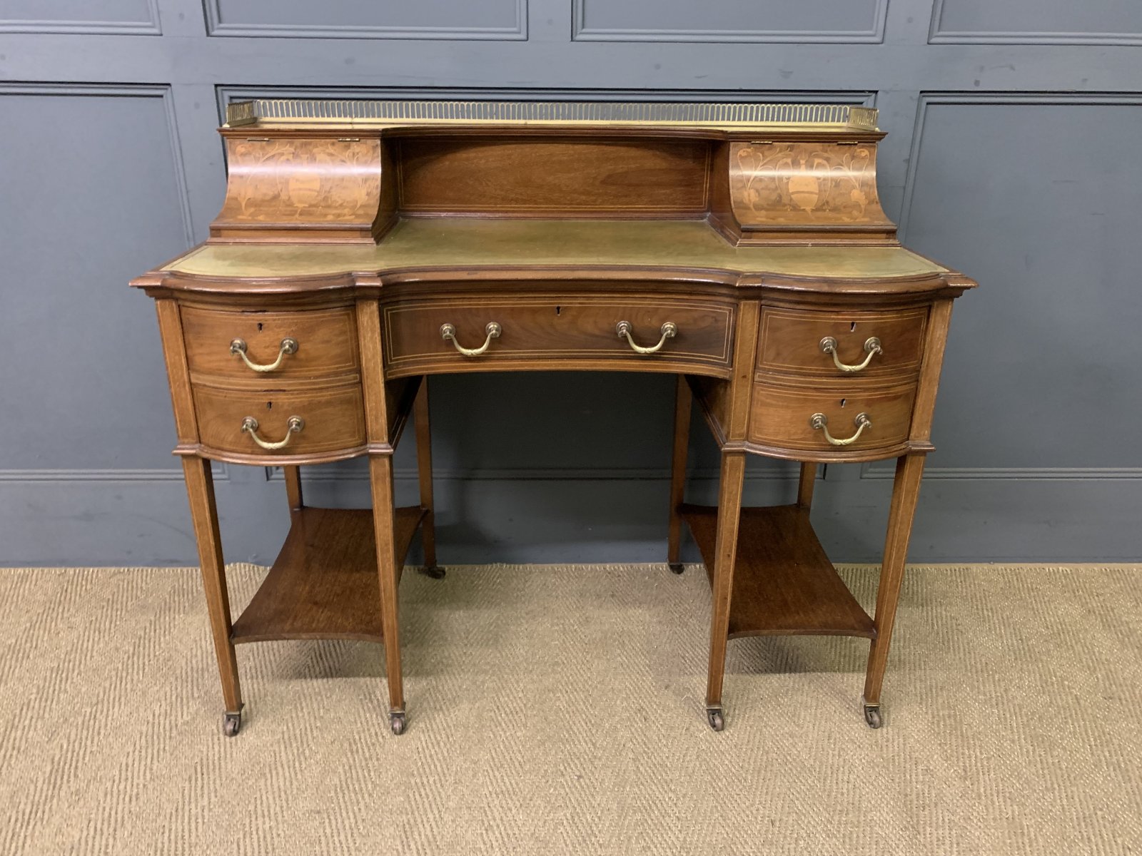 A very good quality inlaid mahogany writing desk by Edwards and Roberts of London. Of fine construction in solid mahogany and attractive mahogany veneers. With inlaid stringing throughout. The top surmounted by a pierced brass gallery. Beneath are a pair of lift-up top stationary boxes. The lids adorned with neo-classical inlaid detailing. They open to reveal fitted interiors. The desk top is fitted with a green leather writing surface with gilt tooling to the surrounds. This desk is of break-fronted serpentine form. There is an arrangement of 5 drawers, all fitted with their original solid brass swan neck handles. The square tapering legs terminate in original brass castors and are united by under-tiers. Offered for sale in very good original condition, ready to go straight into the home or office.