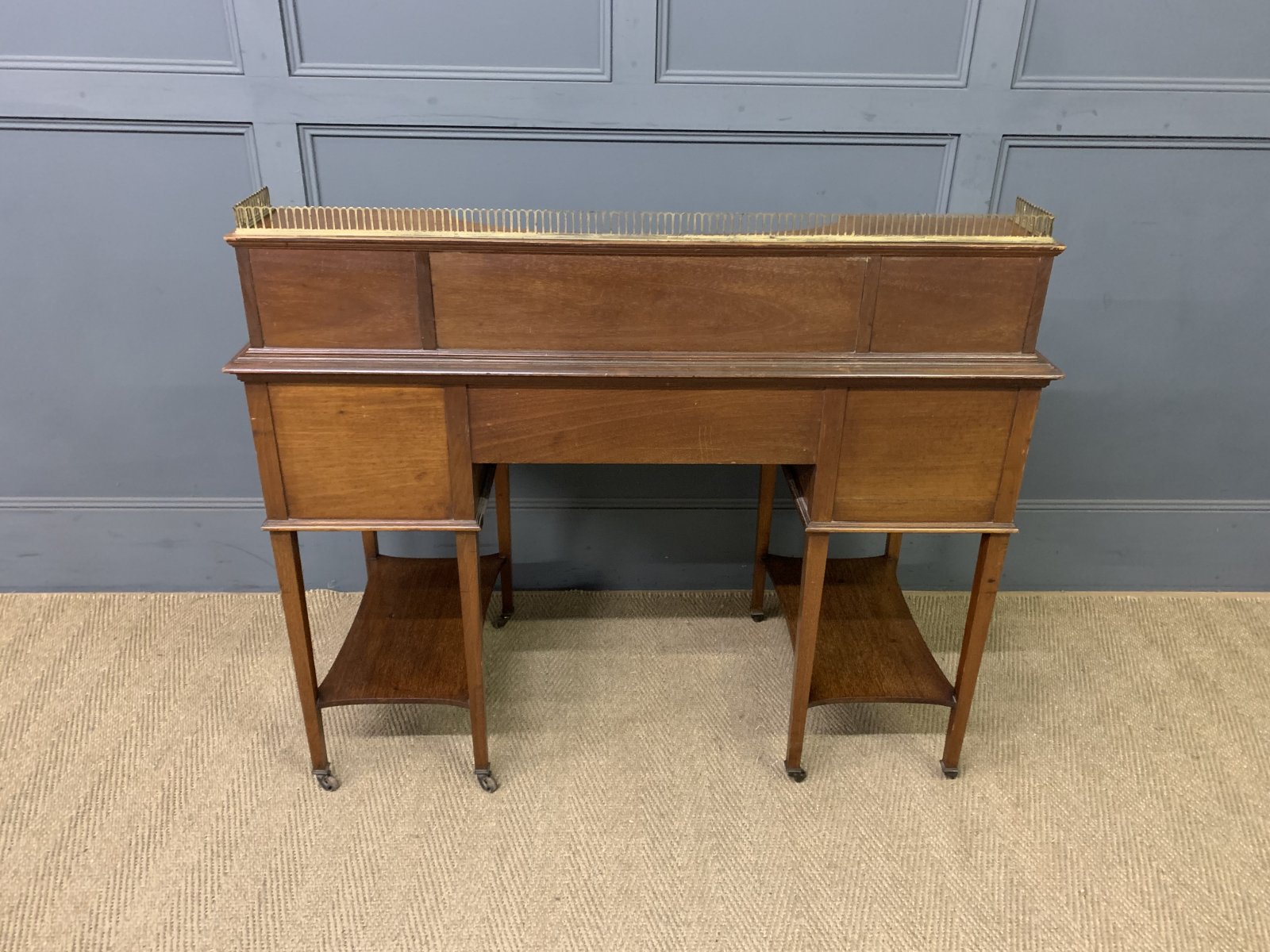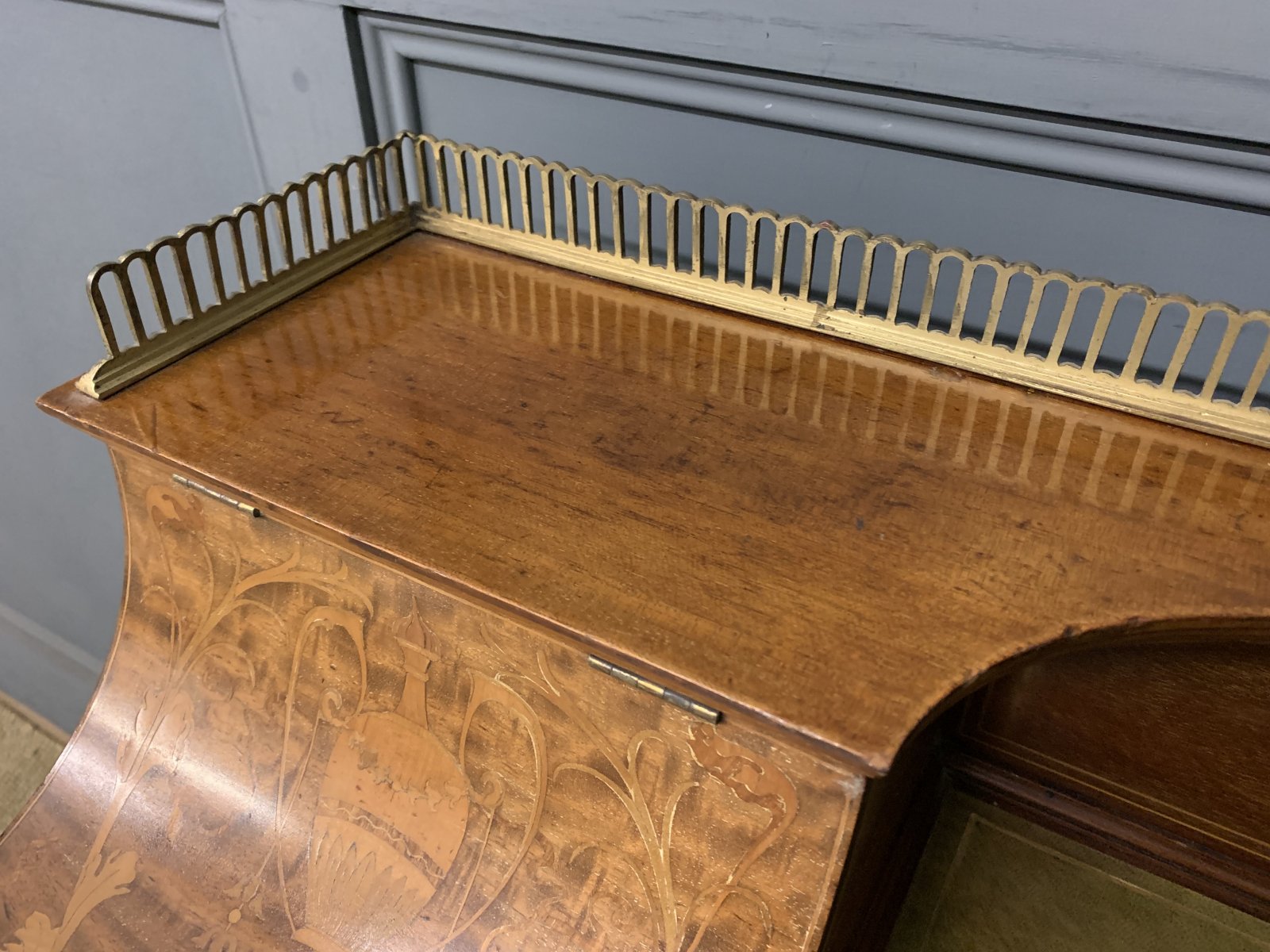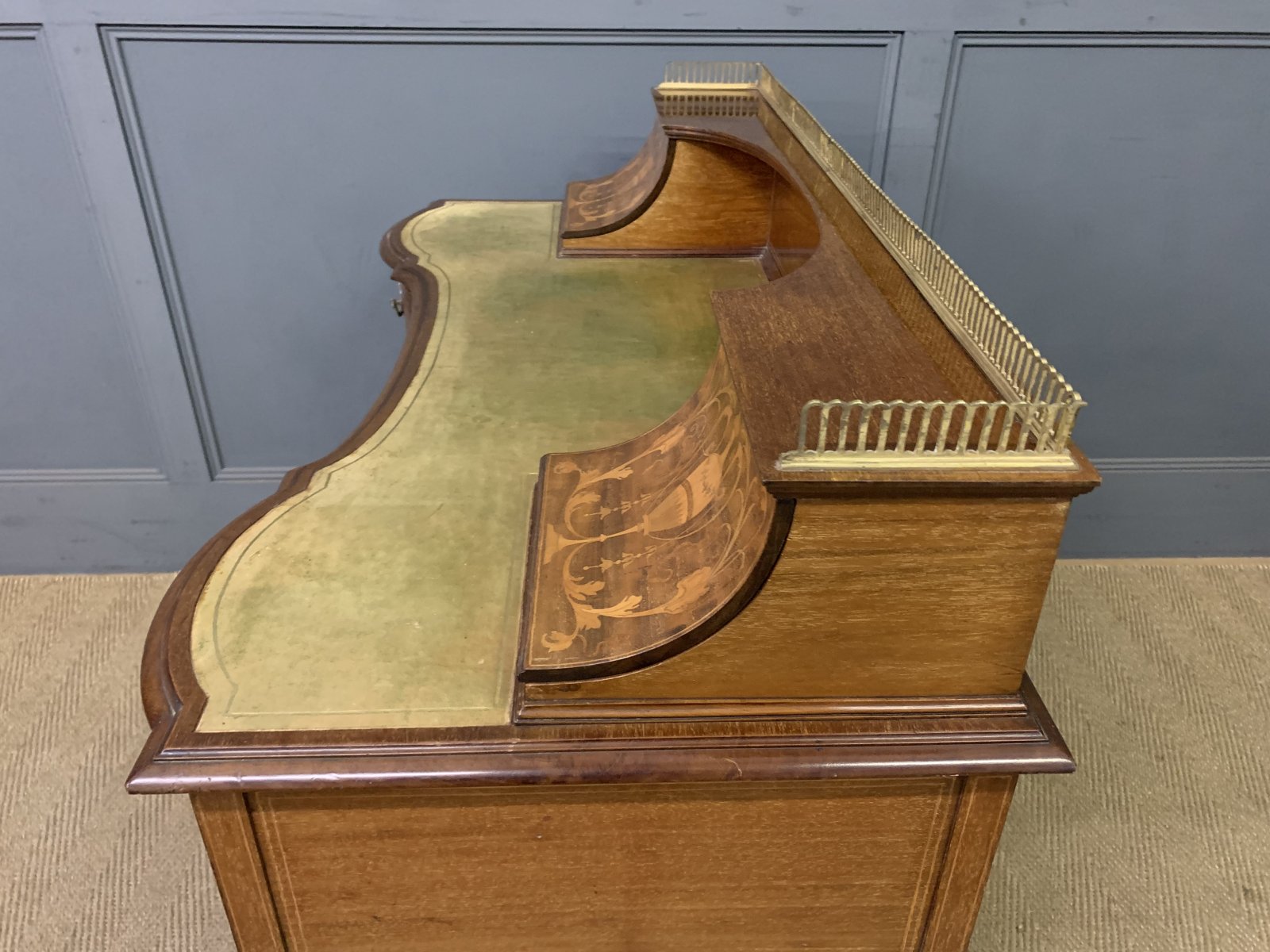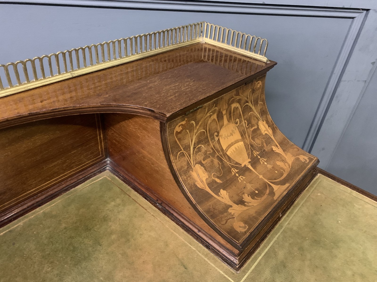 A very good quality inlaid mahogany writing desk by Edwards and Roberts of London. Of fine construction in solid mahogany and attractive mahogany veneers. With inlaid stringing throughout. The top surmounted by a pierced brass gallery. Beneath are a pair of lift-up top stationary boxes. The lids adorned with neo-classical inlaid detailing. They open to reveal fitted interiors. The desk top is fitted with a green leather writing surface with gilt tooling to the surrounds. This desk is of break-fronted serpentine form. There is an arrangement of 5 drawers, all fitted with their original solid brass swan neck handles. The square tapering legs terminate in original brass castors and are united by under-tiers. Offered for sale in very good original condition, ready to go straight into the home or office.