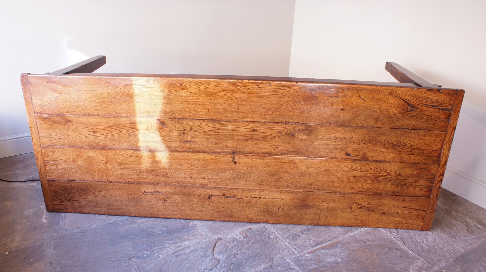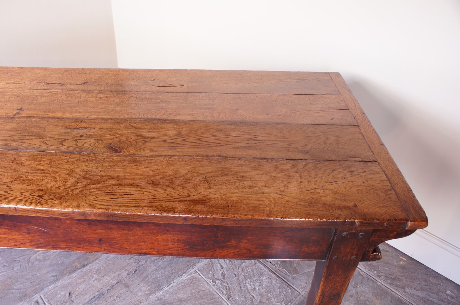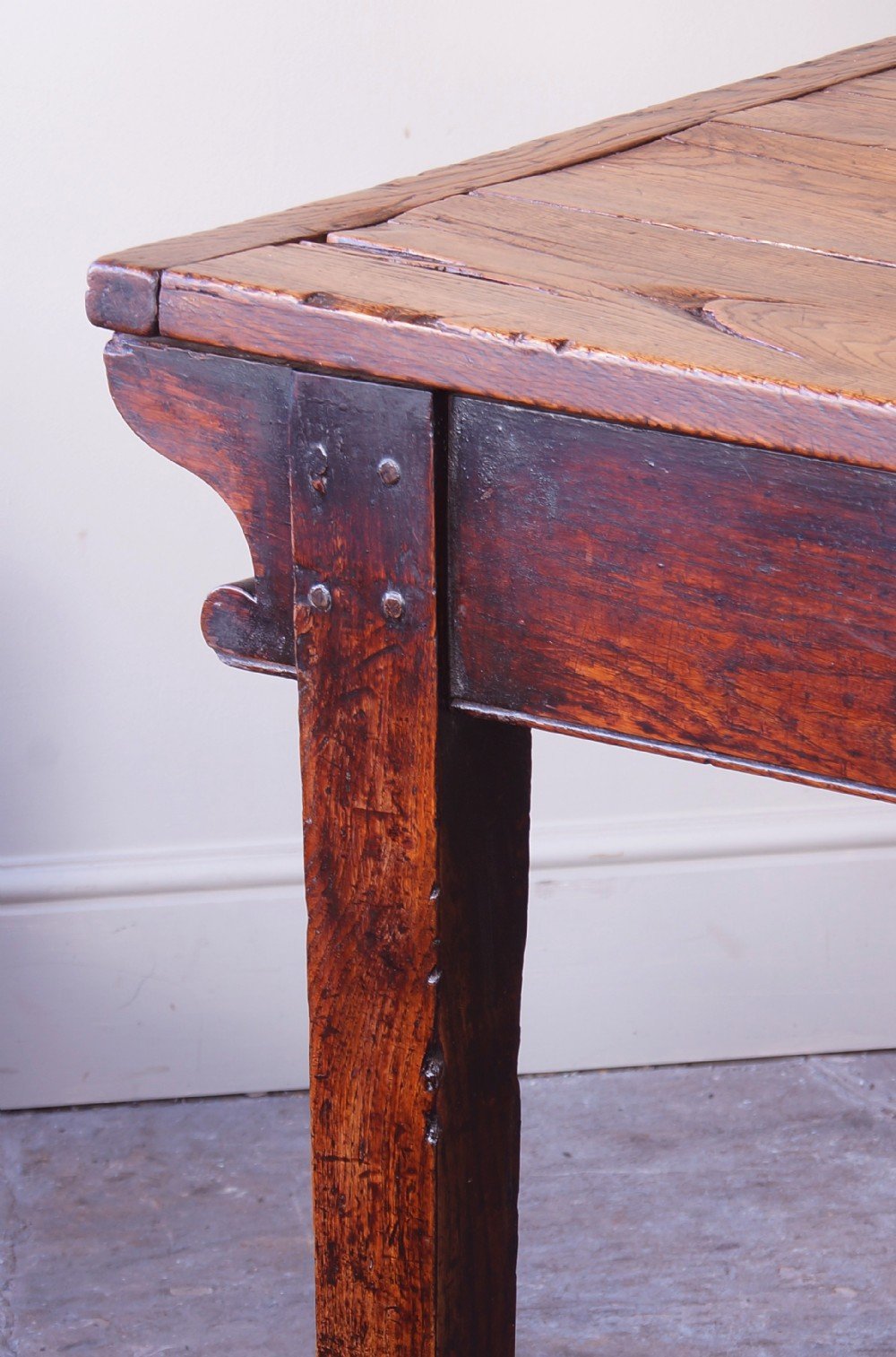A large 18th century English oak farmhouse table from Cumbria . Having a four-piece cleated top supported on square tapering legs of a pegged construction with the side rails continuing through the legs and having shaped ends. This feature is associated with the Westmorland area. Circa 1780.