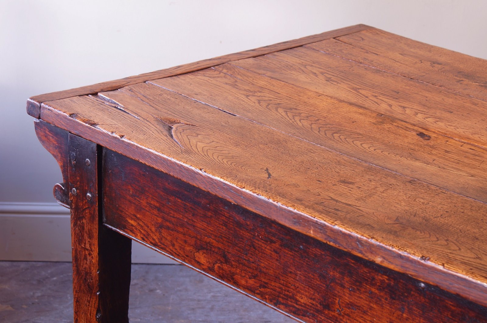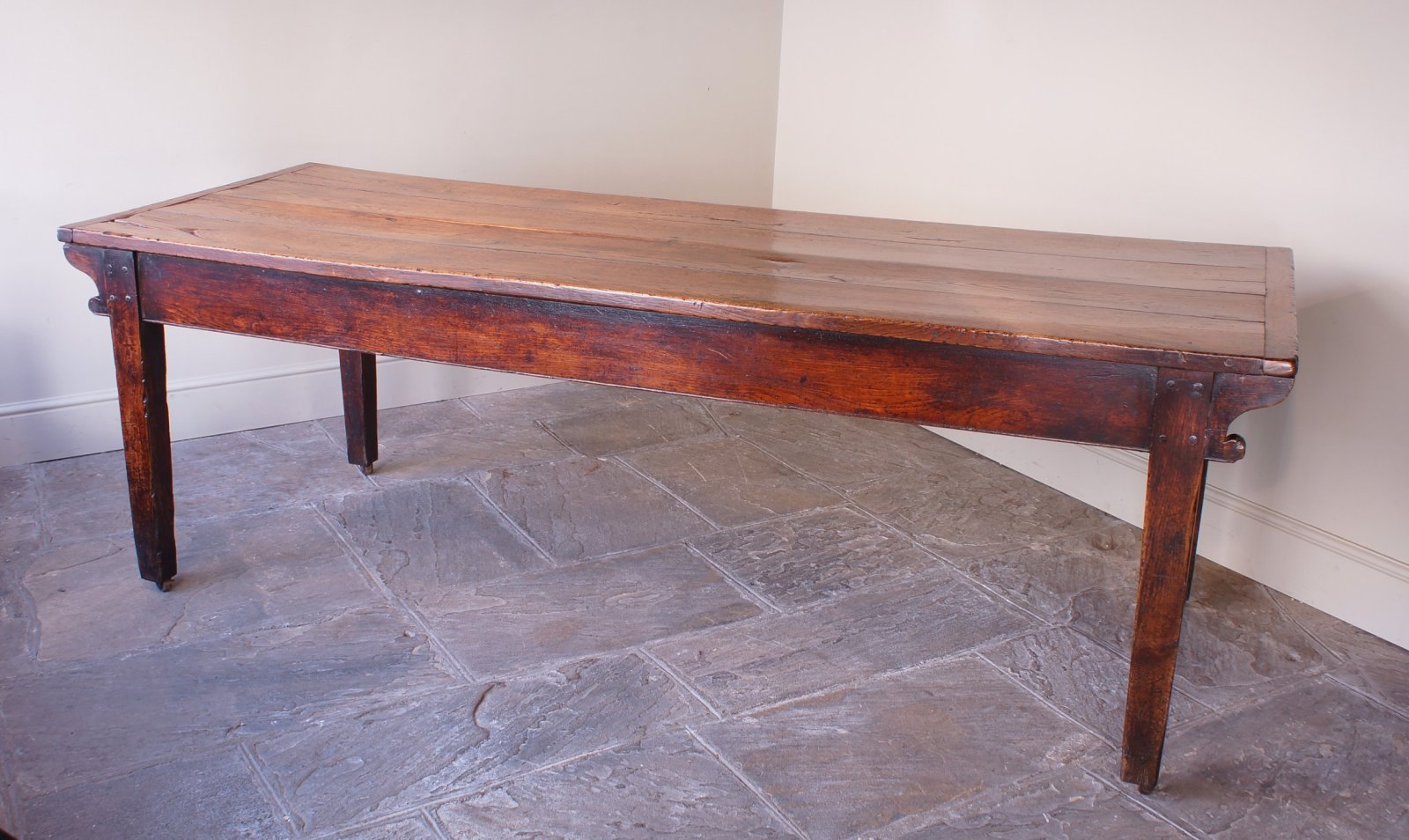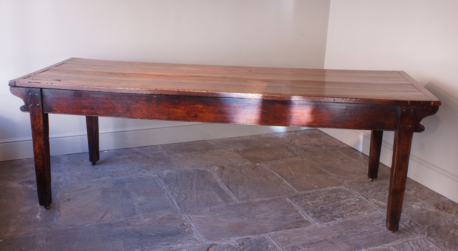 A large 18th century English oak farmhouse table from Cumbria . Having a four-piece cleated top supported on square tapering legs of a pegged construction with the side rails continuing through the legs and having shaped ends. This feature is associated with the Westmorland area. Circa 1780.