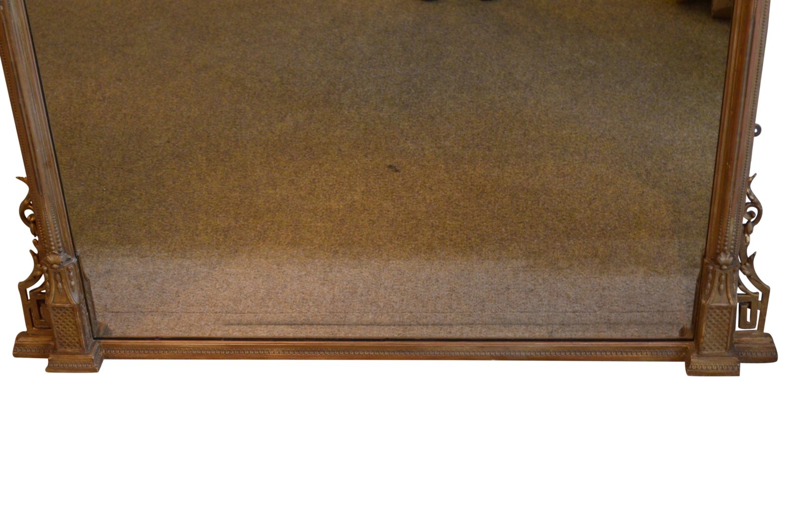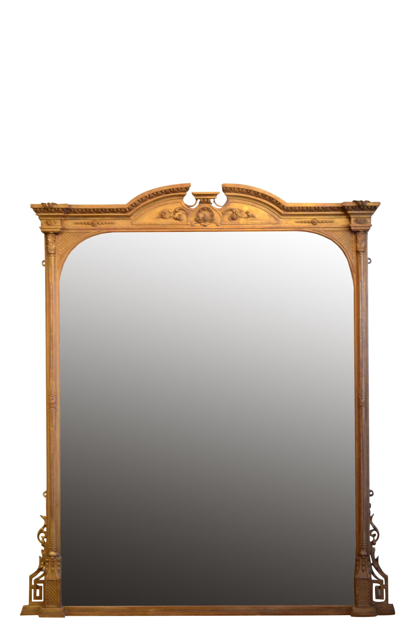 K0574 Superb Victorian overmantle giltwood mirror, having original plate with minor imperceptions in gilded frame with reeded columns, acanthus leaves, floral scrolls, Greek key decoration and egg and dart cornice. This antique mirror retains its original gilt and good patina. Original glass and panelled backboards with newspapers dated 1899. The mirror is solid, sturdy, no woodworm. No missing or loose decoration. This mirror would grace any interior.