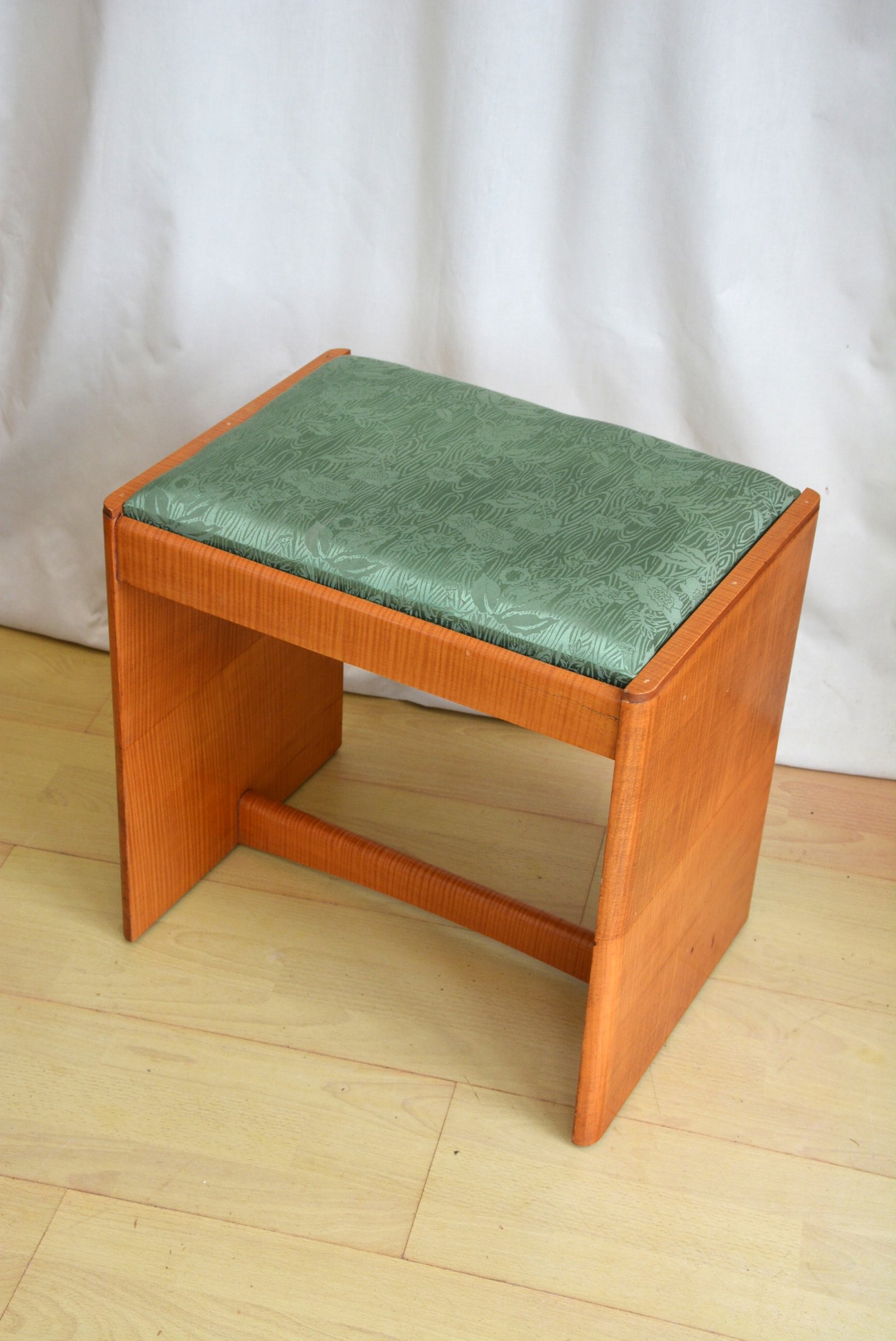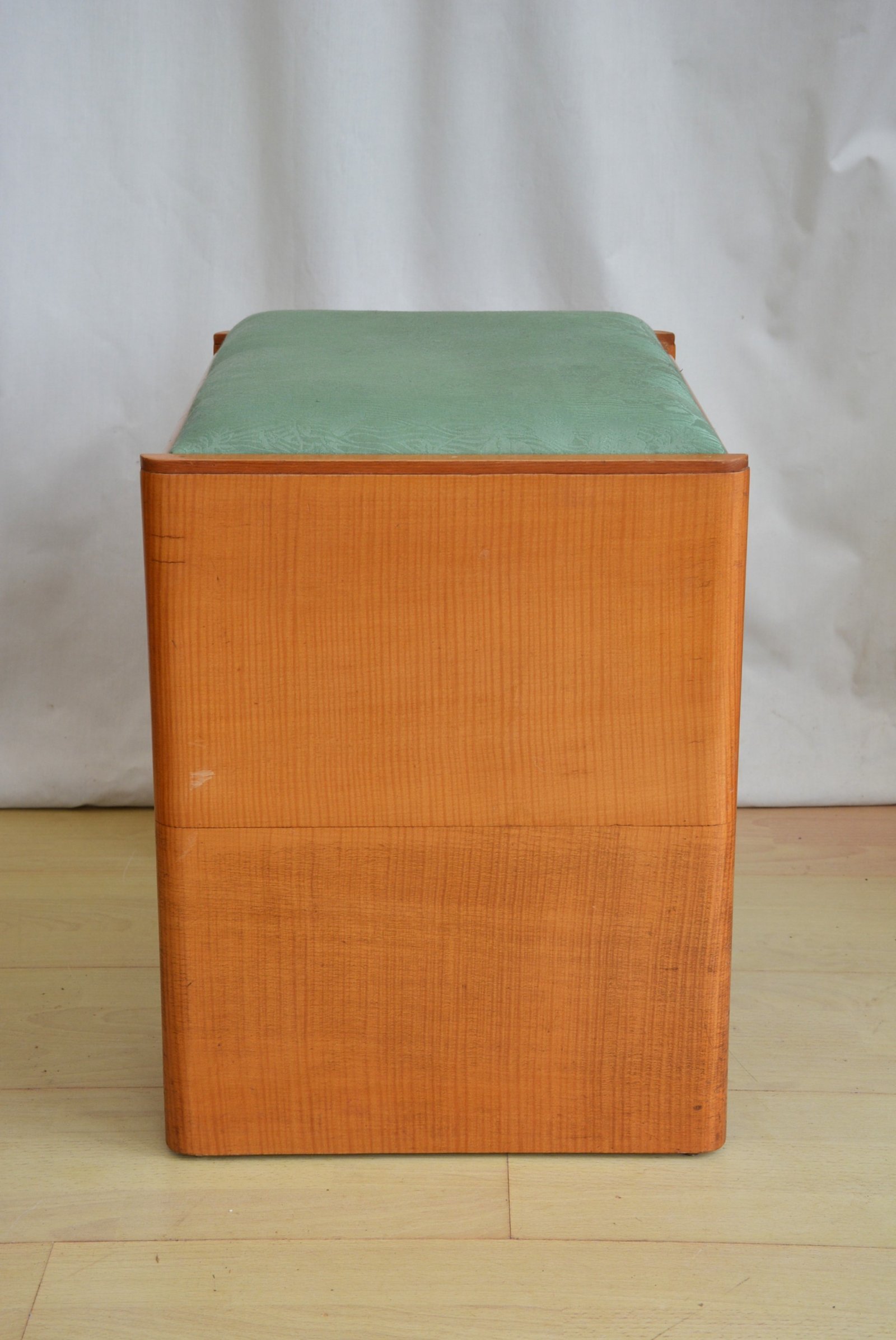 K0644 Stylish and very attractive English Art Deco dressing table stool, having drop in seat with green flowery green top cover showing minor signs of usage enclosed in a beautiful sycamore frame with rounded corners, all united by shaped stretcher. This Art Deco stool retains its soft and mellow colour and original finish which has been cleaned and waxed. The stool is solid, sturdy and ready to place at home.