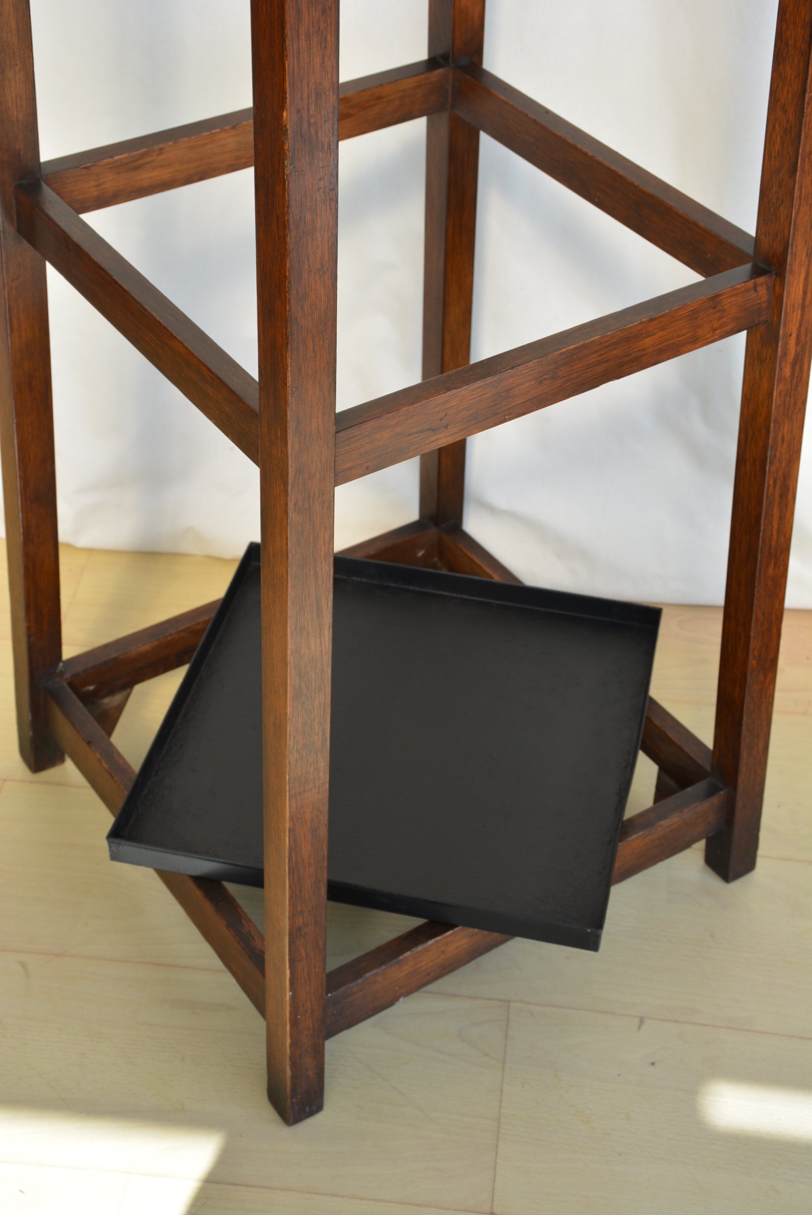 K0645 English antique Arts and Crafts coat stand, having four double coat and hat hook above eight single hooks on four square uprights with stylised top ends united by umbrella holders and terminating in a square base enclosing original removable drip tray. This antique hall stand retains its original finish which has been cleaned and waxed, original mellow colour and soft patina showing minor age related signs. No cracks, no breaks, no repairs. Solid, sturdy, woodworm free, all in home ready condition. The coat stand has been very well looked after over the years. Good size. c1900