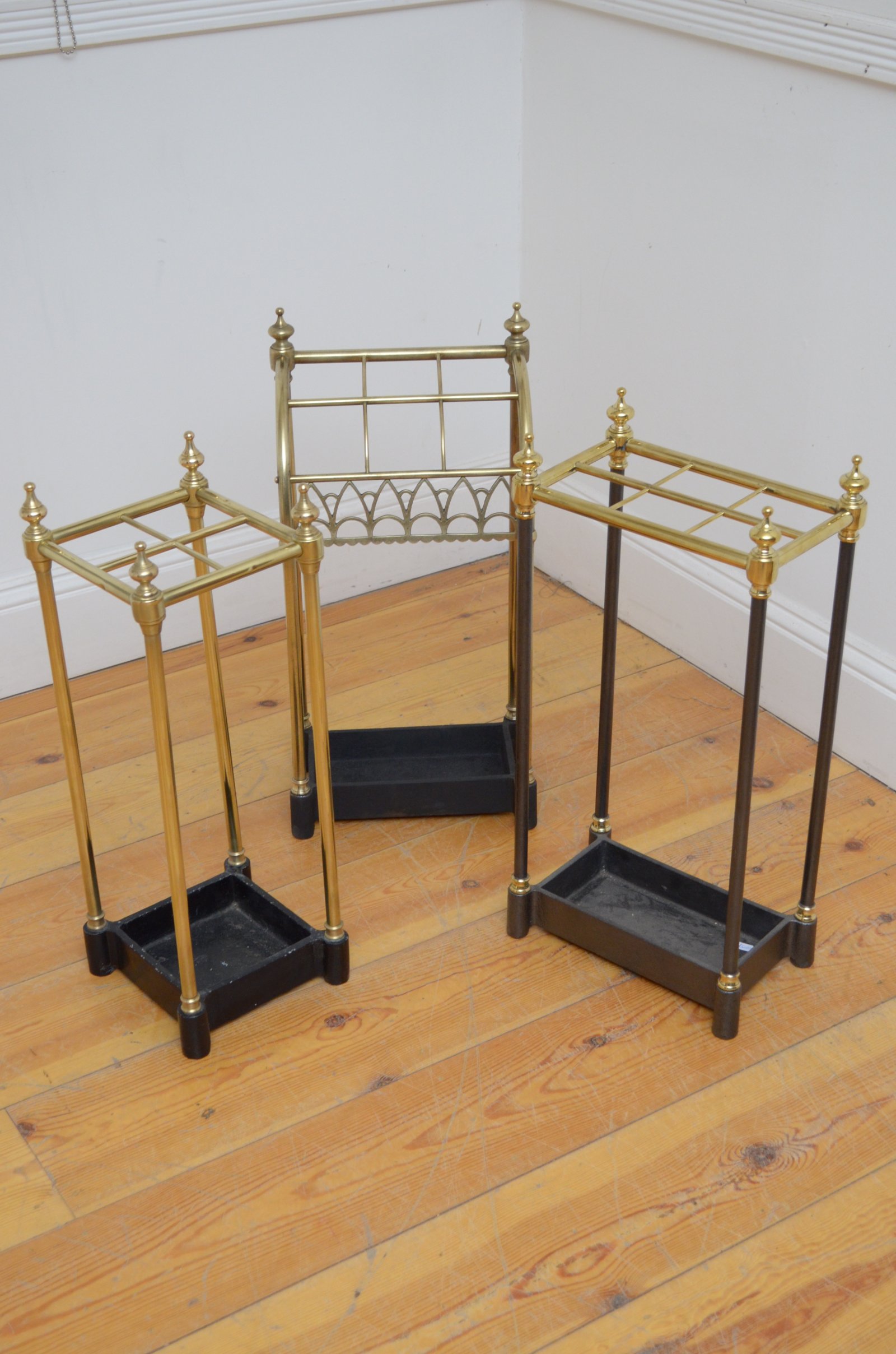 P0174 English demi lune, brass stick stand with four sections, decorative finials and shaped drip with decorative dog tooth motifs tray. This umbrella stand has been cleaned and polished and is in home ready condition. No cracks, breaks or repairs. XXth century.