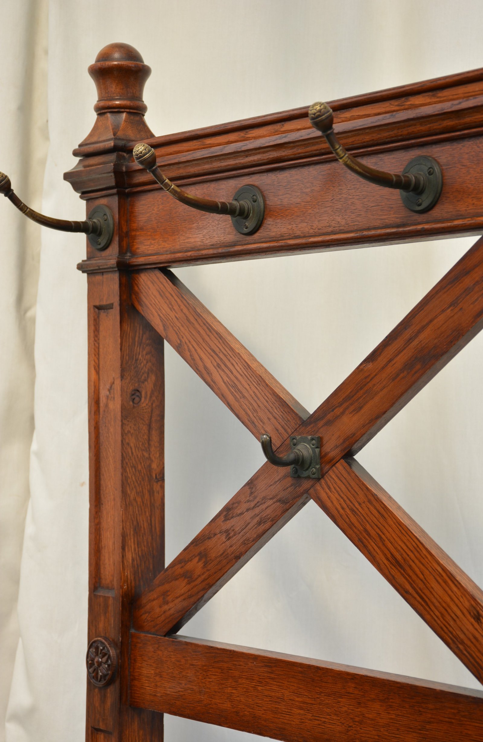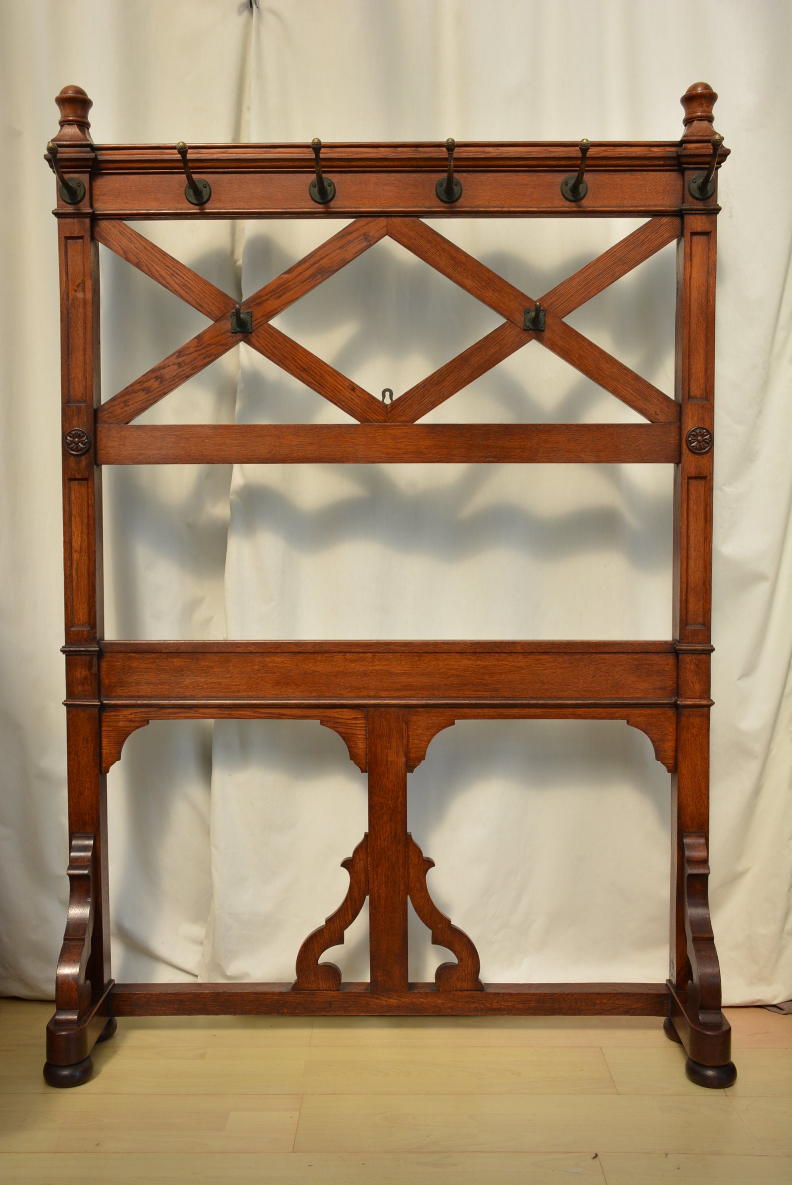 K0641a Stylish, elegant and very unusual, fine quality solid oak Victorian Gothic hall stand / coat stand, having six original very decorative coat hooks with petal motif on moulded back, flanked by turned finials and two short hat / coat hooks below, raised on fielded uprights with Gothic rosettes. The uprights follow to form a base with scroll carved legs and shaped and carved centre support all standing on original bun feet. This antique hall stand / coat stand has been sympathetically cleaned and waxed. It retains its original mellow colour, original French polish finish and soft patina. No woodworm, solid and in home ready condition. This stylish Gothic Revival coat stand would grace any interior. c1860