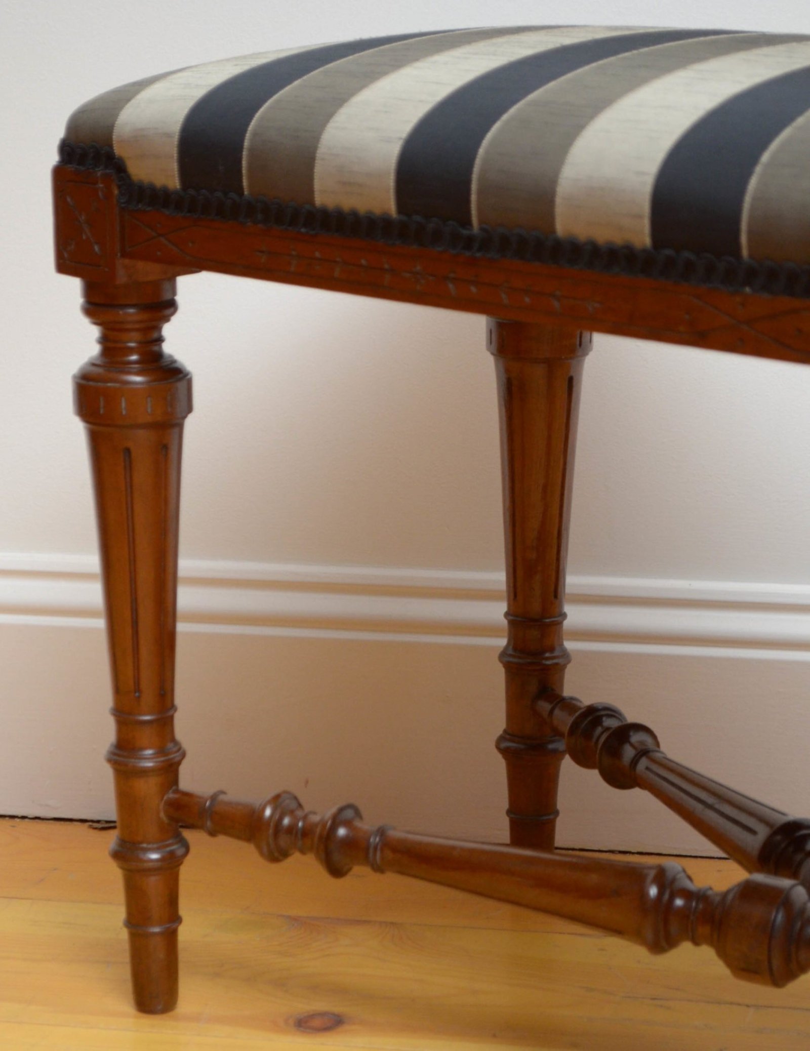 K Very attractive Victorian duet stool or hall seat in walnut, having newly recovered seat above decorative carved frieze, all standing on four turned and fluted legs united by turned and fluted X stretchers with a elegant finial to centre. This antique duet stool / window seat is in home ready condition. No breaks or historic repairs, all joints have been checked and tighten where necessary, solid and sturdy, no woodworm. c1880