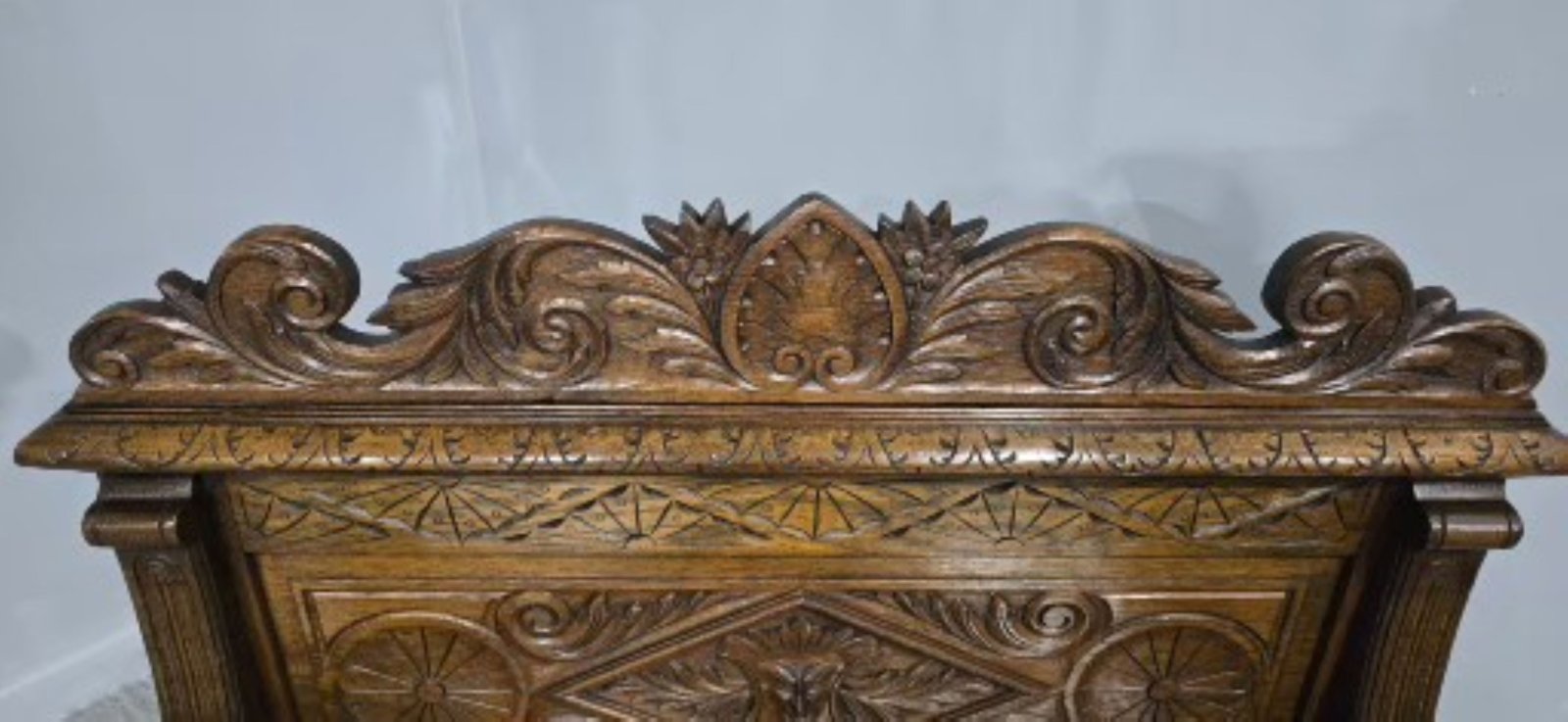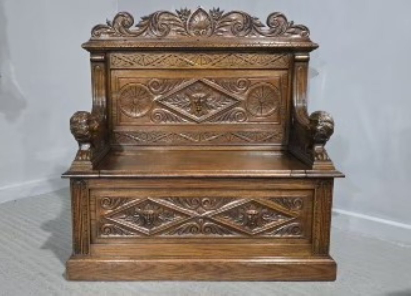 See shipping detailsA very good medium oak hall settle, carved green man decoration, opposing lions, lift up lid for storage, in excellent overall condition.