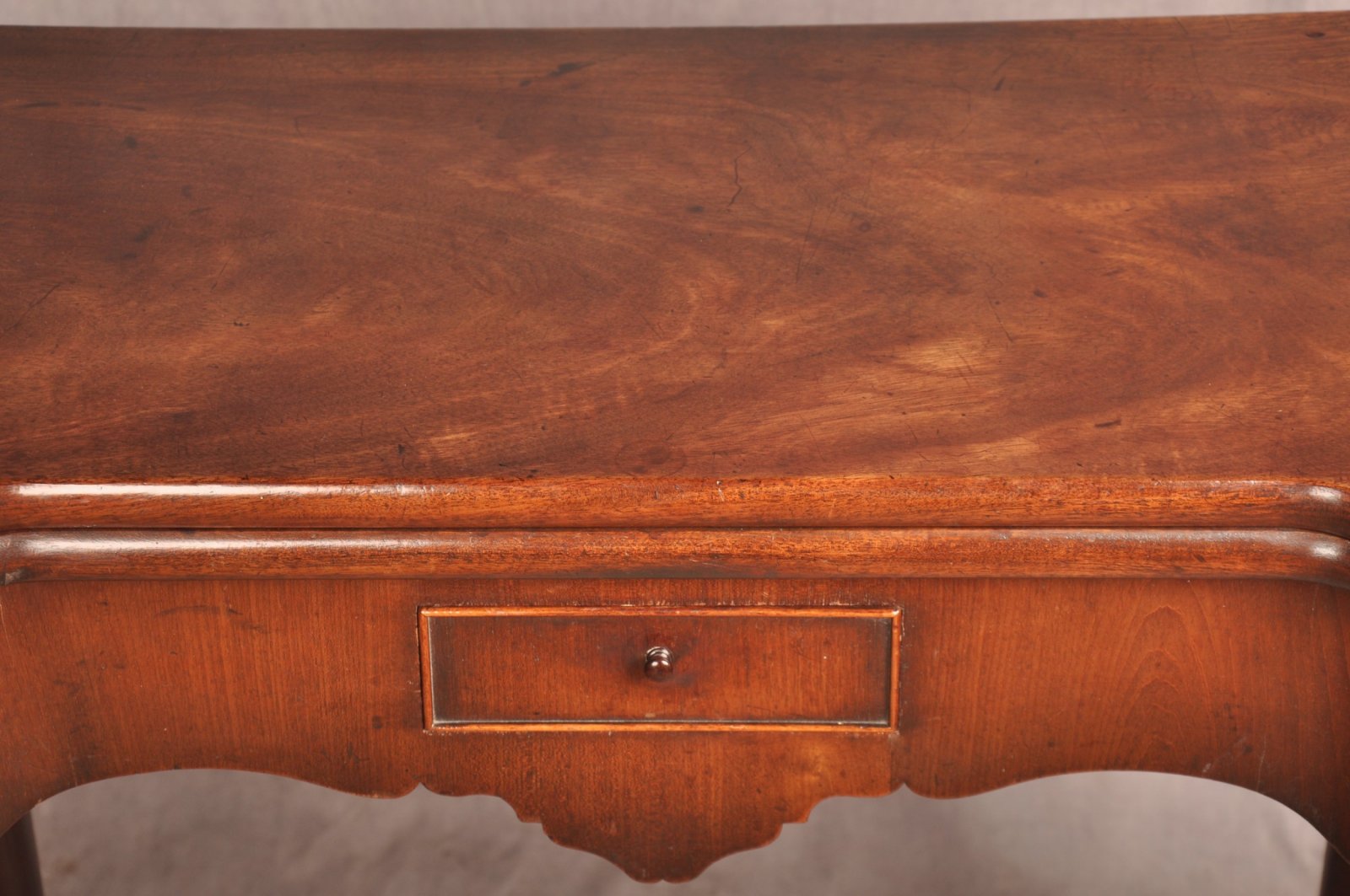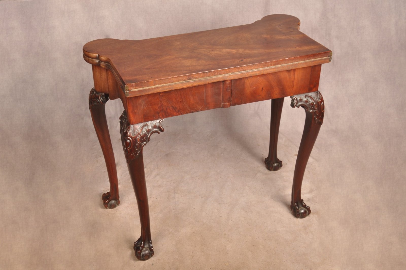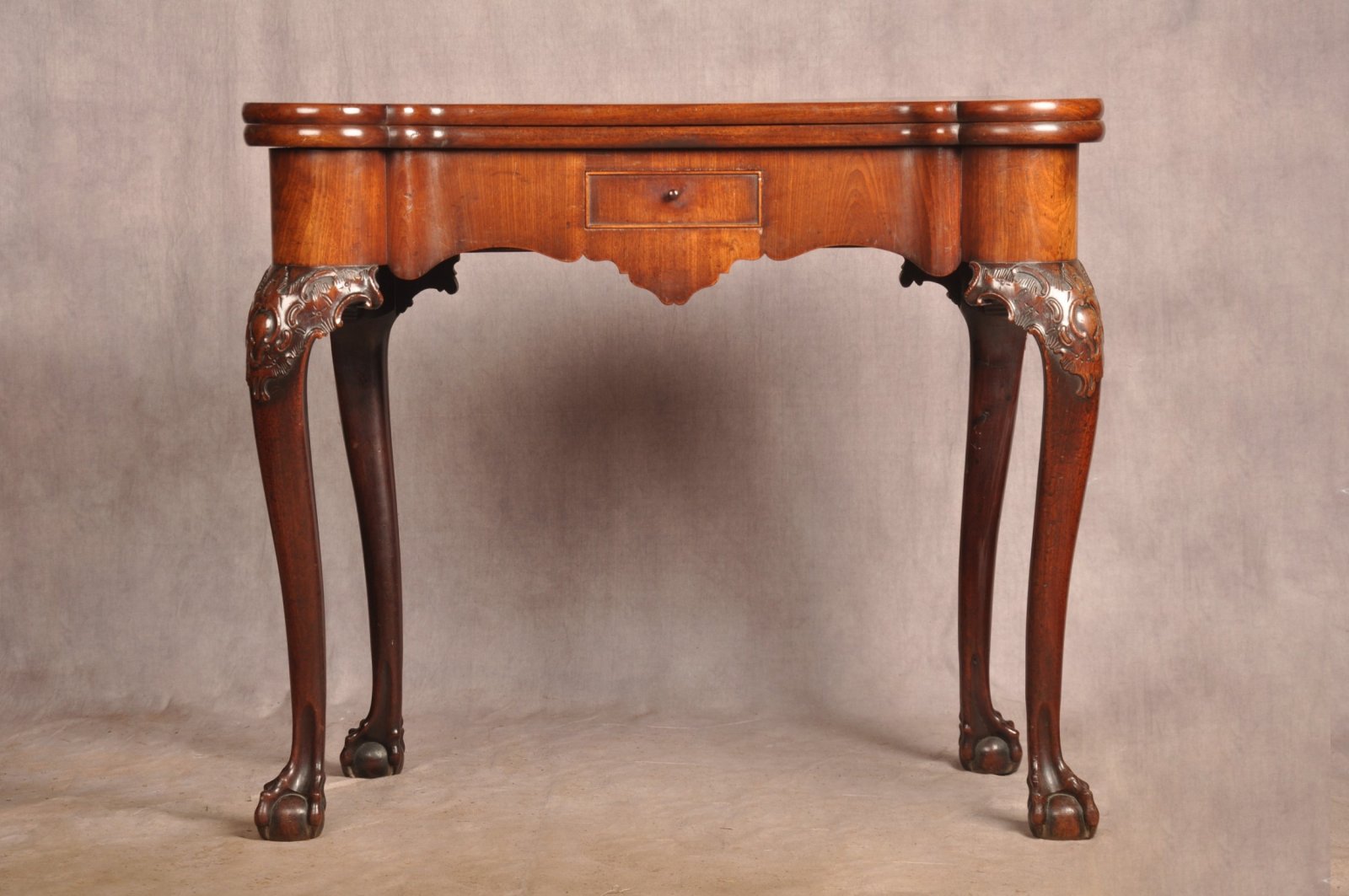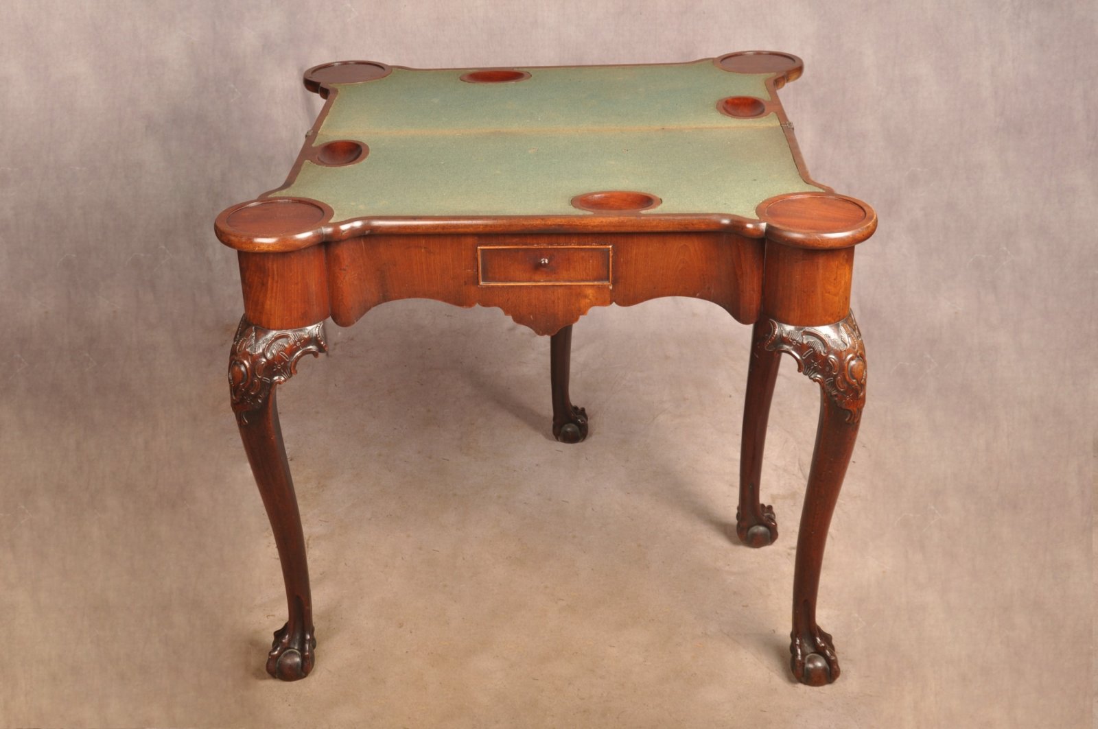 See shipping detailsAn exceptional 18th Century Mahogany card table of superb faded golden colour, beautifully shaped and wonderfully carved with rococo motifs. Retaining the untouched original hinges and in fabulous condition throughout. The top is fitted with old baize, guinea pockets and candle stands. All four legs are carved with cabochon and C scrolls to the knee, finishing at the base with wonderfully carved claw & ball feet.