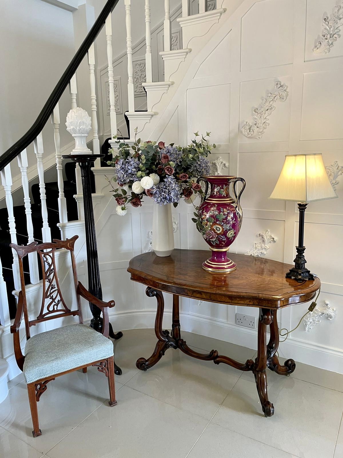 Exceptionally beautiful large Staffordshire porcelaneous twin handled vase being 57 cm high and raised on a pedestal shaft to a bulbous body and a trumpet shaped rim enclosed by two twin loop handles decorated with very attractive mauve background and picked out with a spray of blooms.