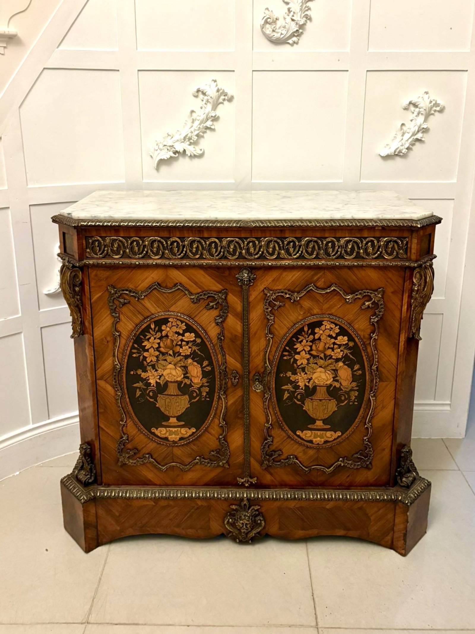 A magnificent antique French Louis XVI style side cabinet of exceptional quality showcasing beautiful marquetry work, richly cast gilt-bronze mounts and a shaped white marble top. The façade features finely detailed floral inlaid panels framed with crisp ormolu all set within striking parquetry arranged in elegant geometric patterns. The serpentine front, bold mounts and refined proportions give this cabinet a commanding presence, making it a standout decorative piece for any sophisticated interior.