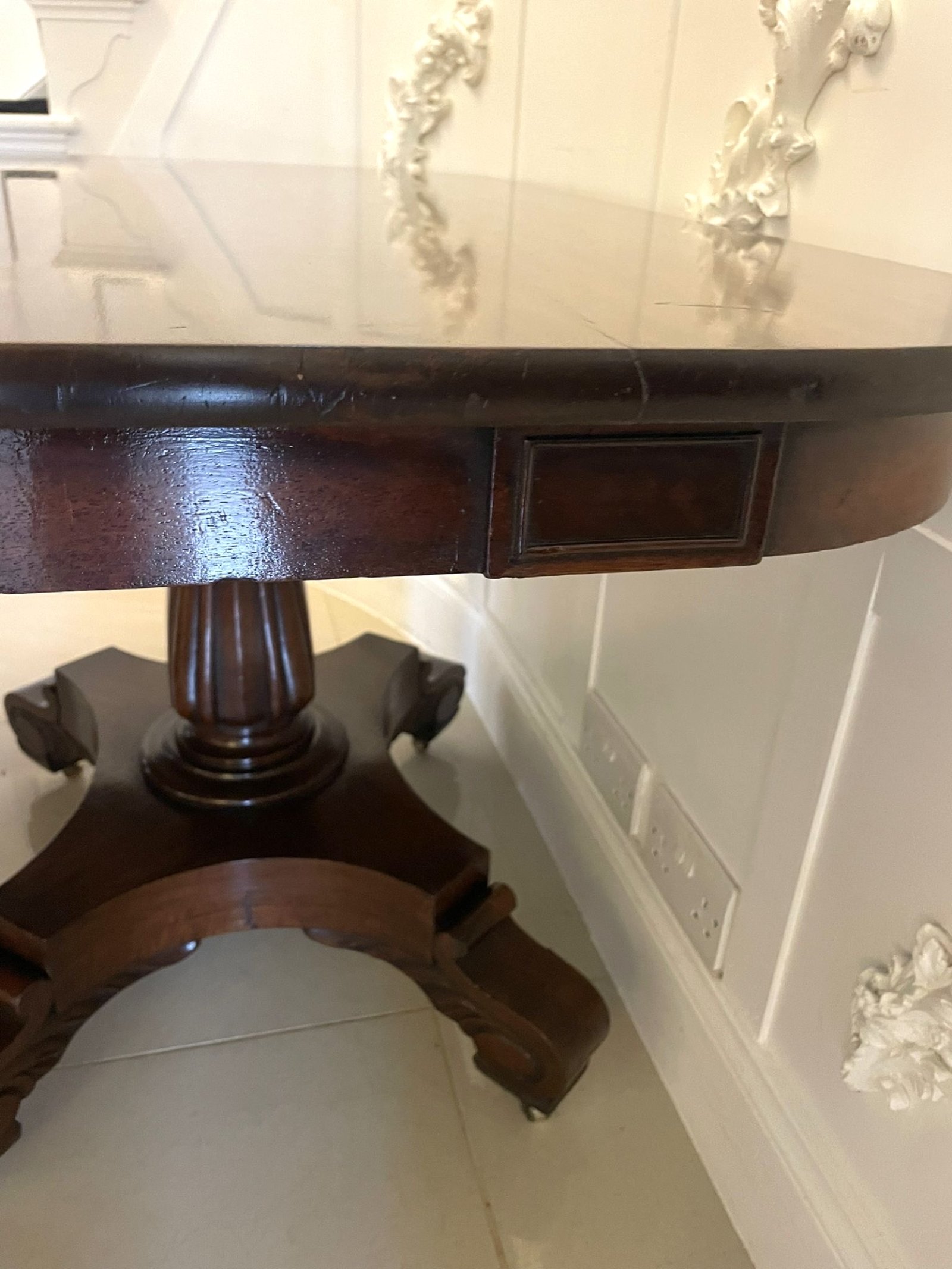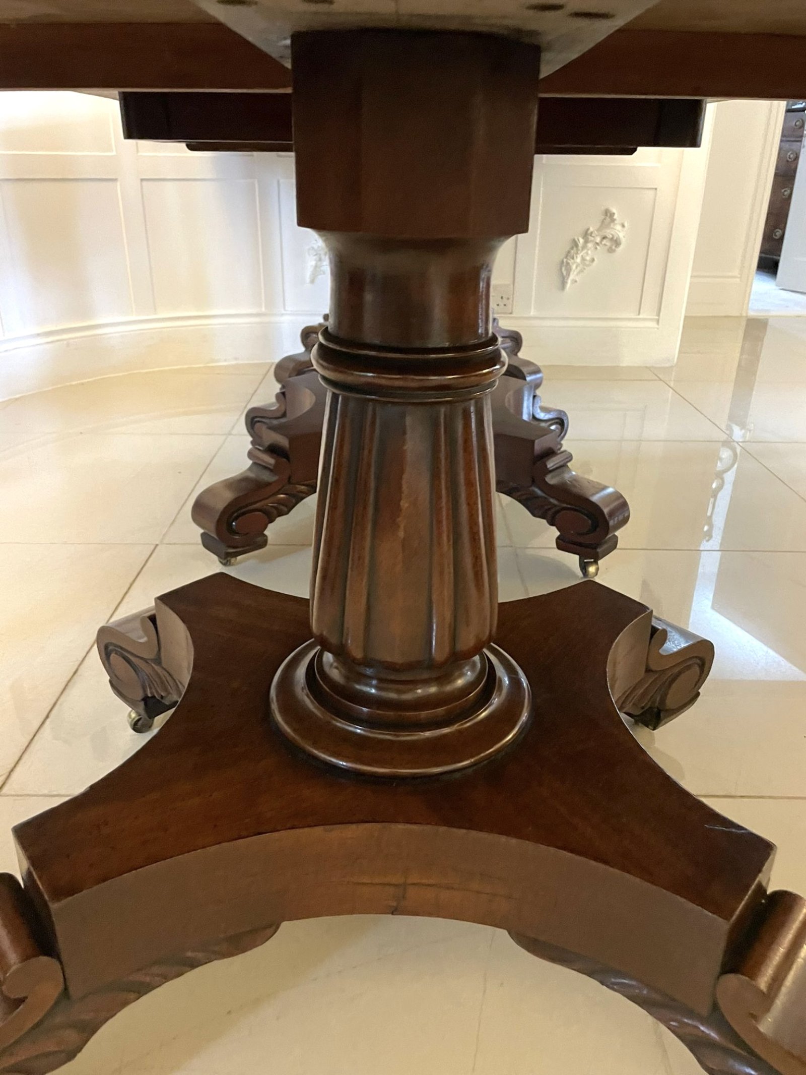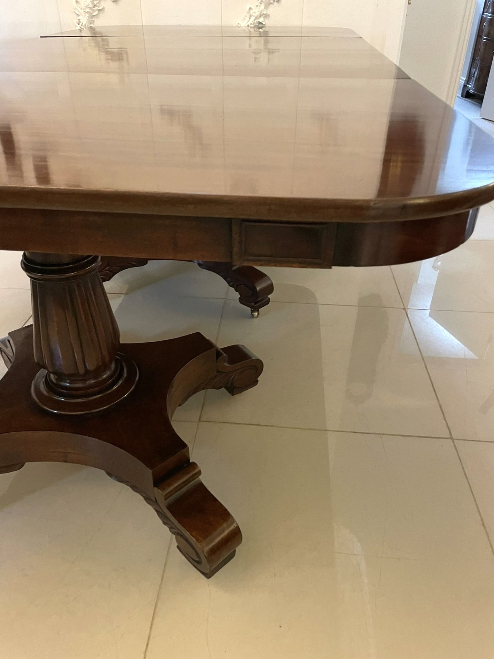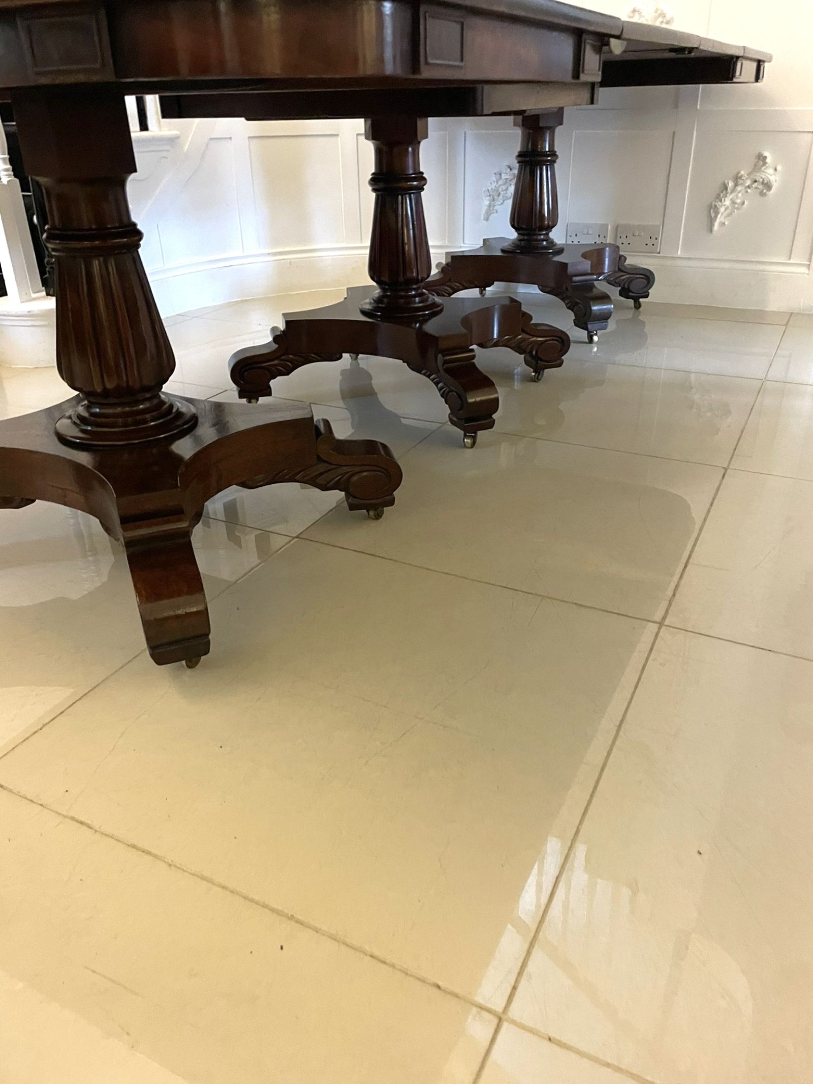 Exceptional quality antique regency figured mahogany triple pedestal 10/12 seater dining table having an outstanding figured mahogany top above a frieze which boasts attractive moulded rectangular panels supported by fabulous turned reeded pedestal columns standing on shaped platform bases with scrolled carved feet on original brass castors.