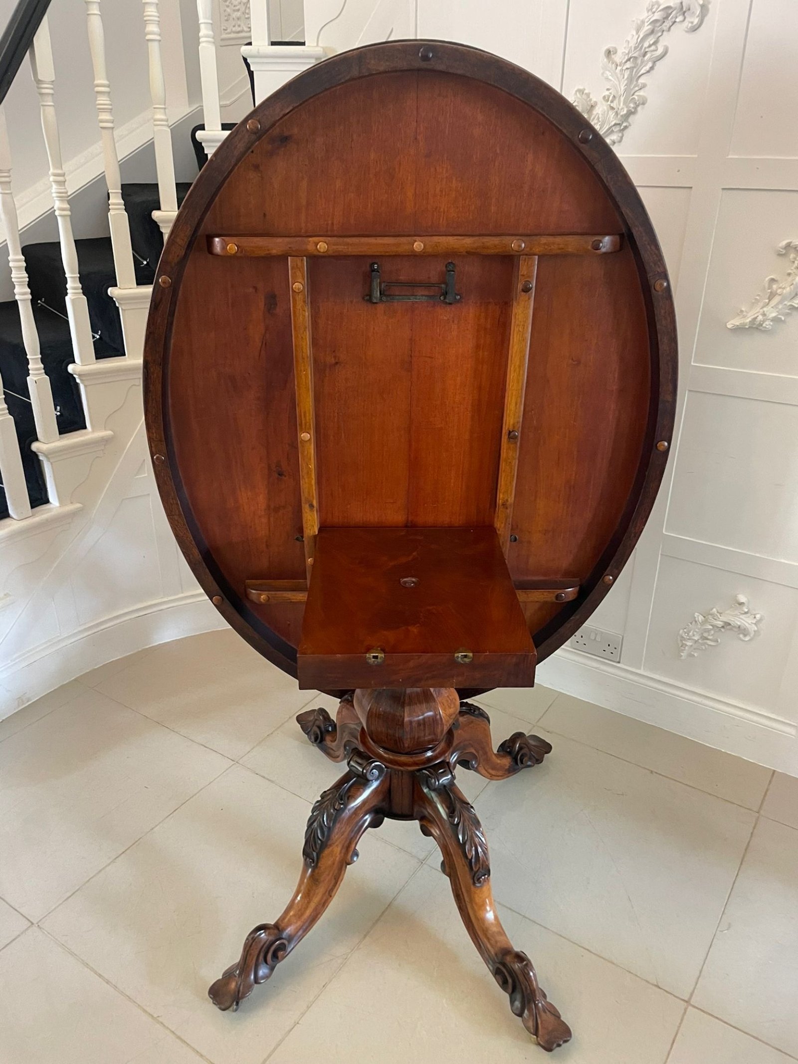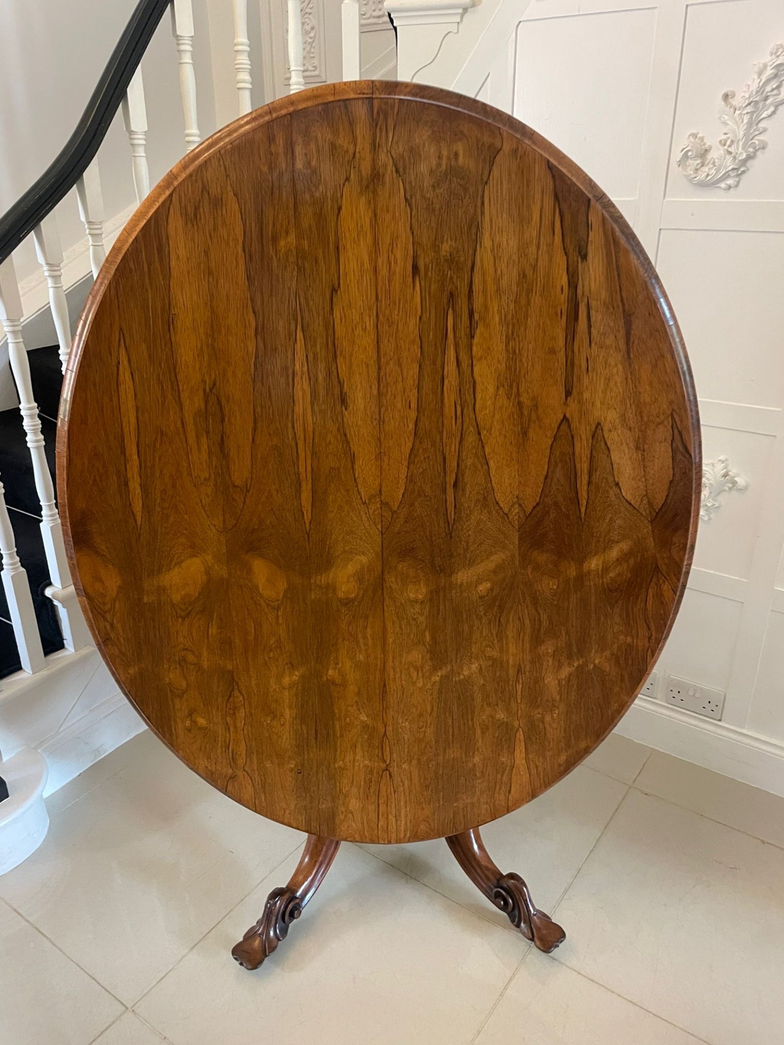 Exceptional quality antique Victorian rosewood centre/dining table having an outstanding quality oval rosewood top with a moulded edge, rosewood frieze supported on an attractive shaped pedestal column standing on four shaped carved solid rosewood cabriole legs with scroll feet and original castors