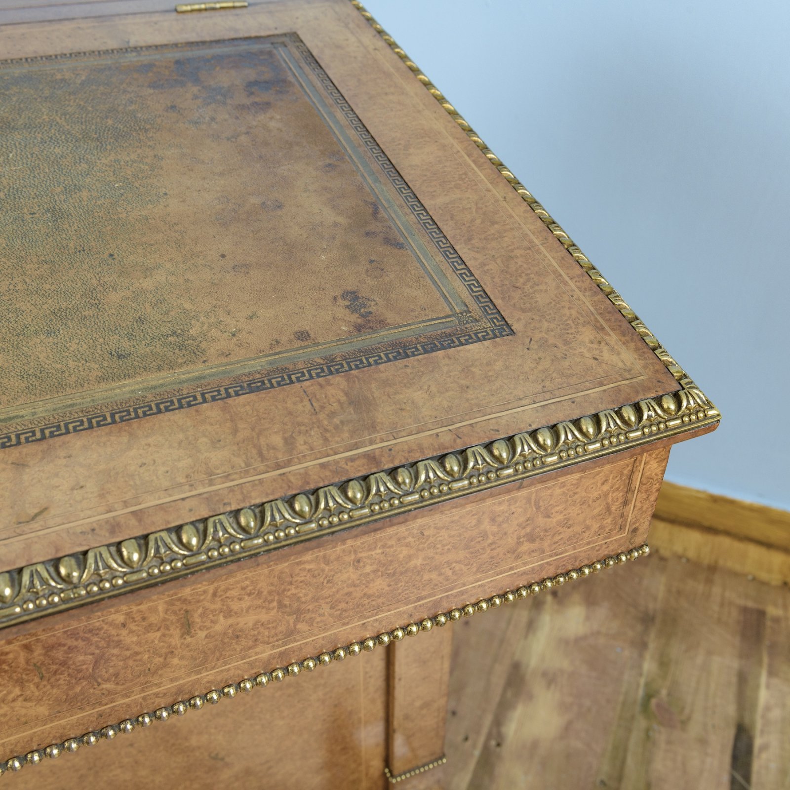 The gilt brass gallery surmounted to the top, opens to reveal a boxwood interior that contains divisions and a pen holder. The writing fall is lined with the original green leather and tooled with broken gilt tooling. The fall is hinged and opens to reveal a boxwood lined interior space. The fall acts as a lock for the top so that the whole top writing section can be locked by locking the writing fall.