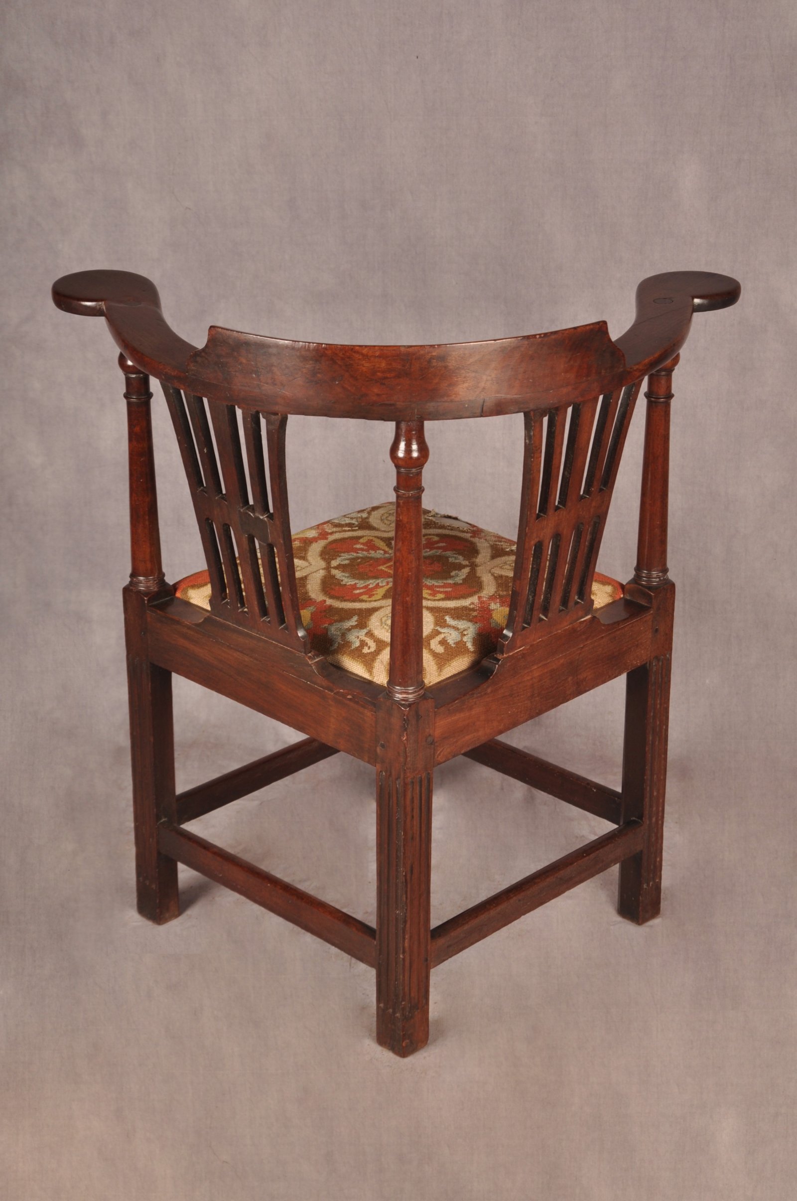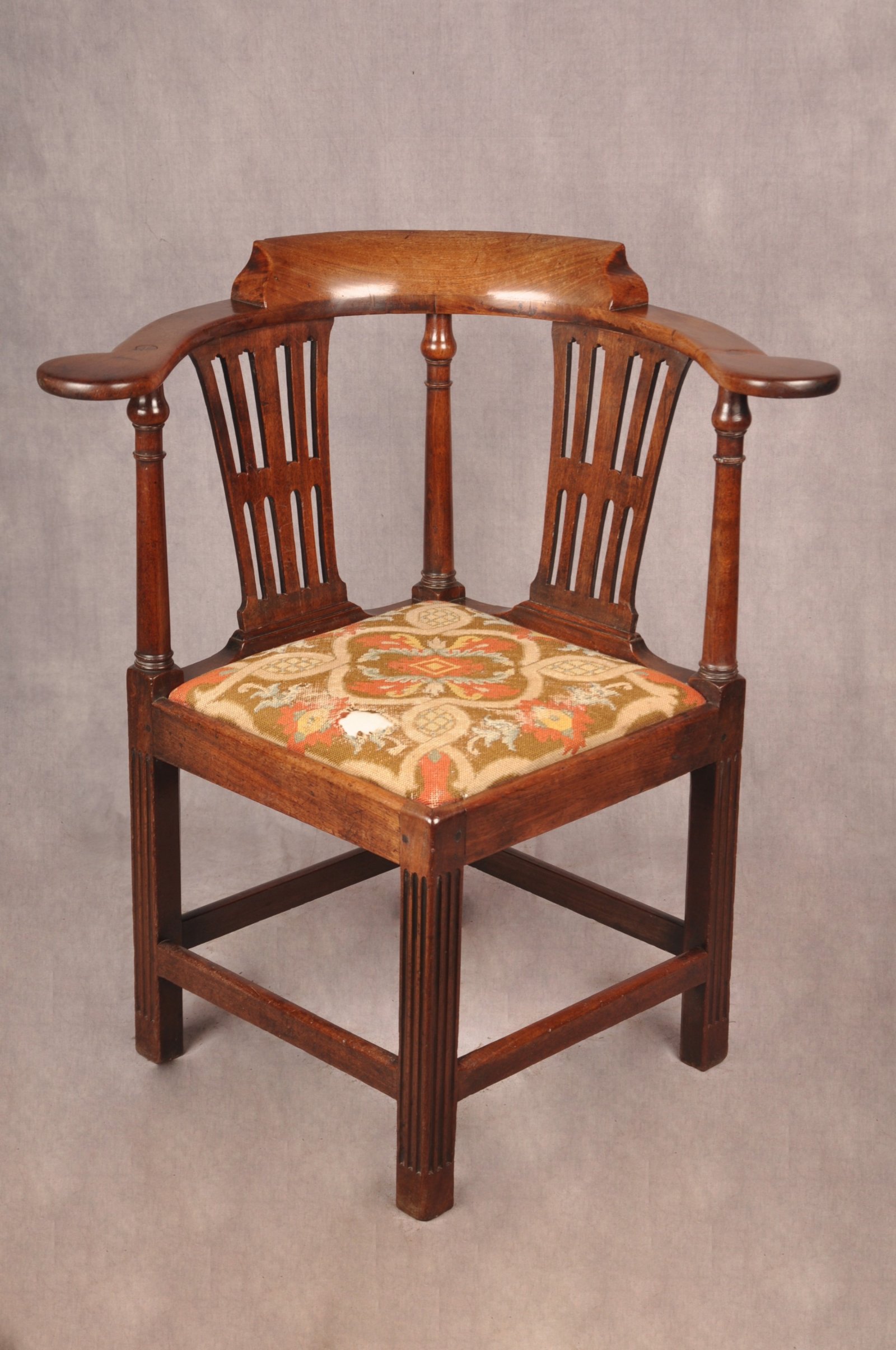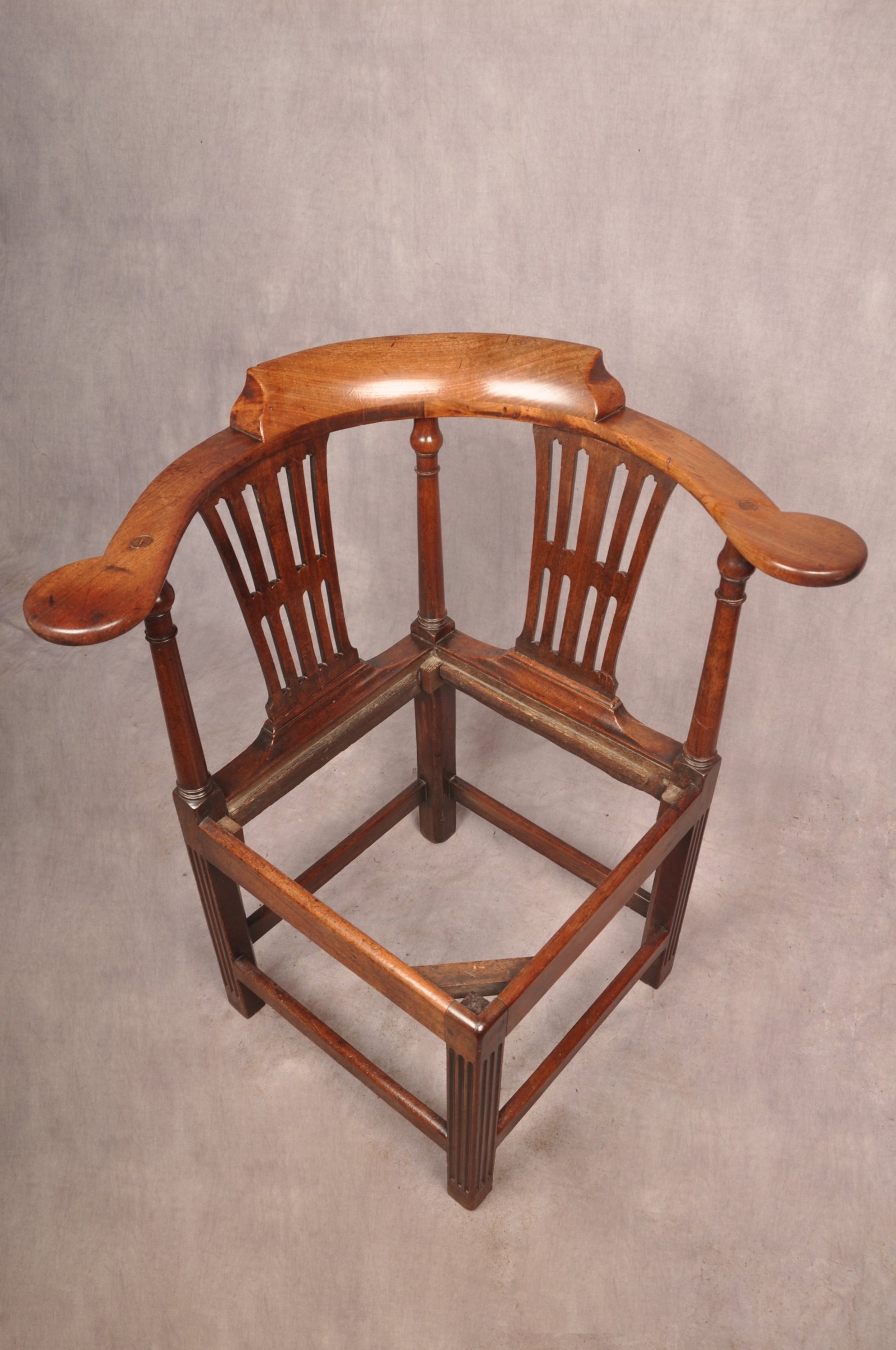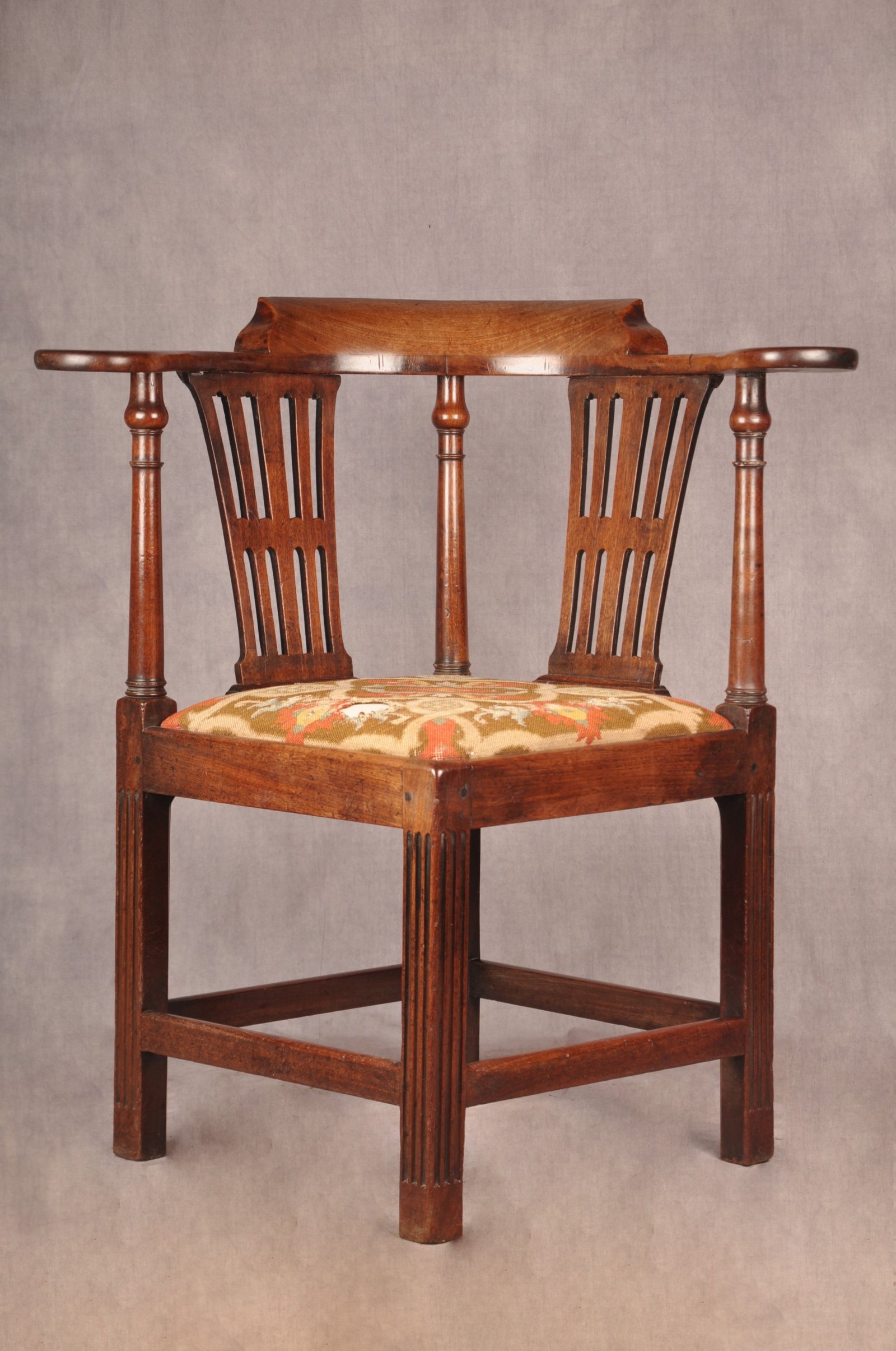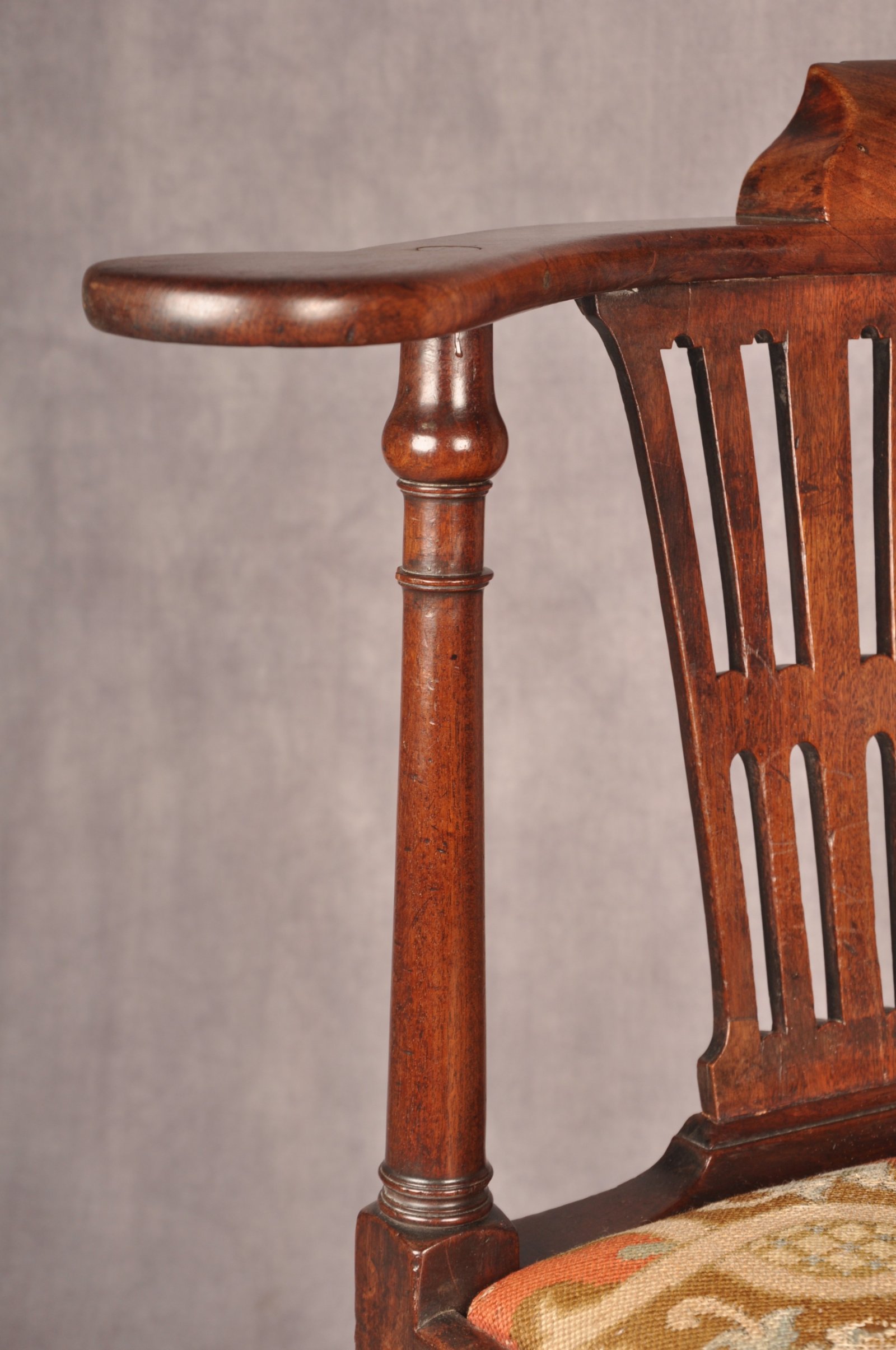 A fine 18th Century Chippendale period Corner Chair of absolutely Superb colour and in good original condition. Having shaped top rail and arms, fretted arcaded splats, turned supports and square cut fluted legs.