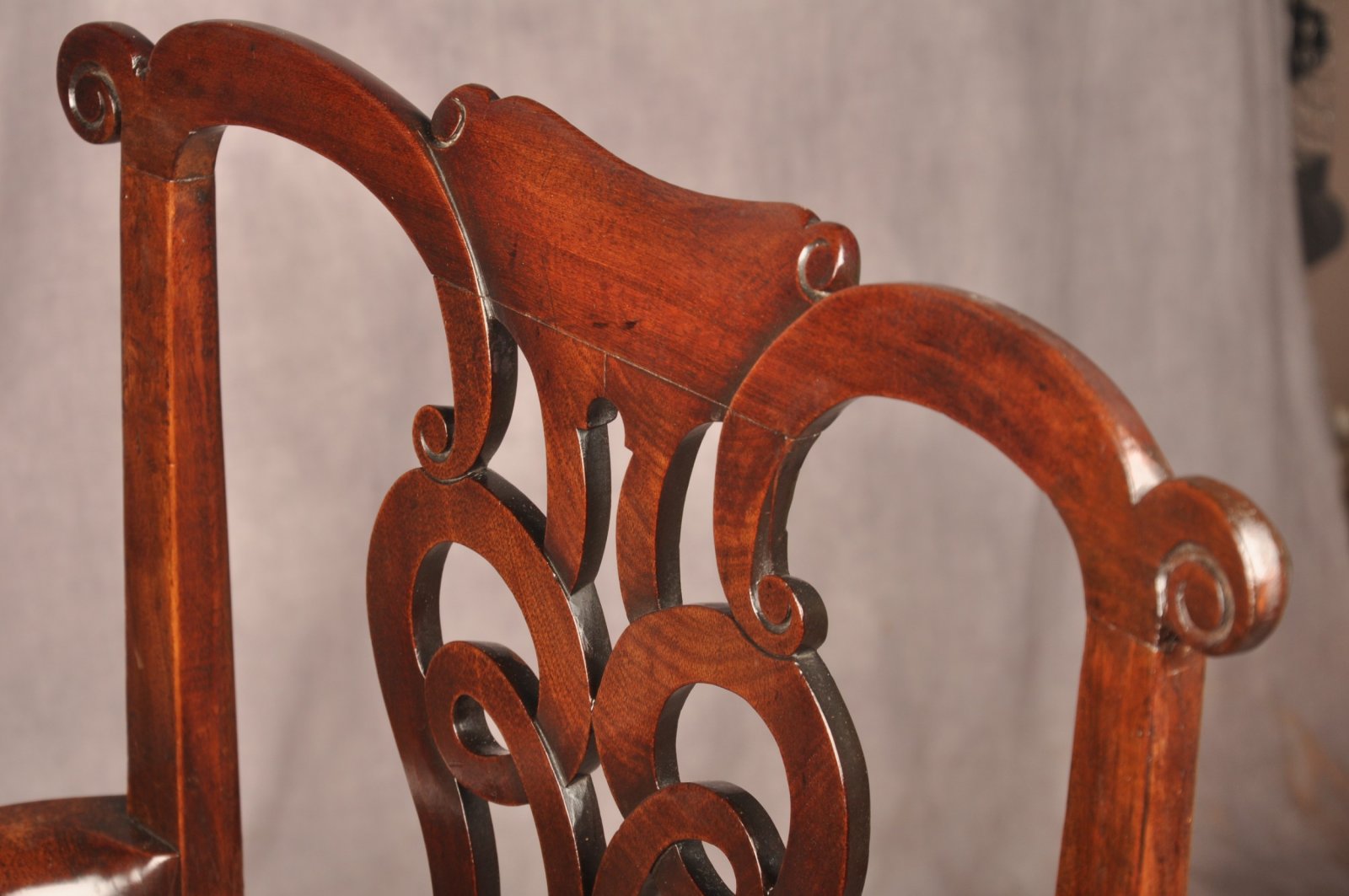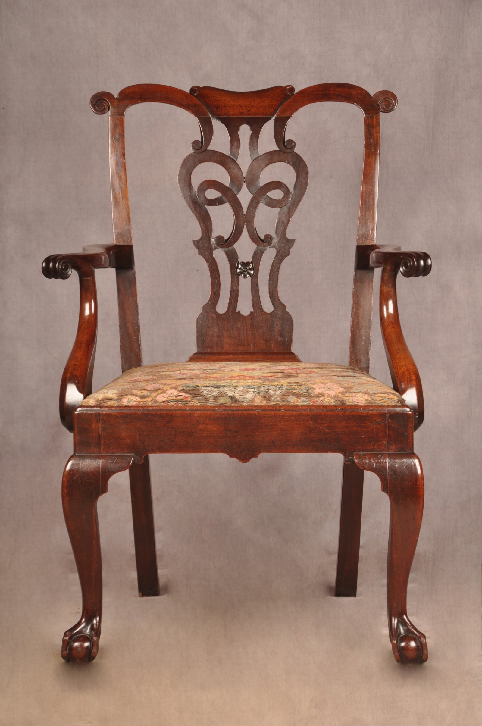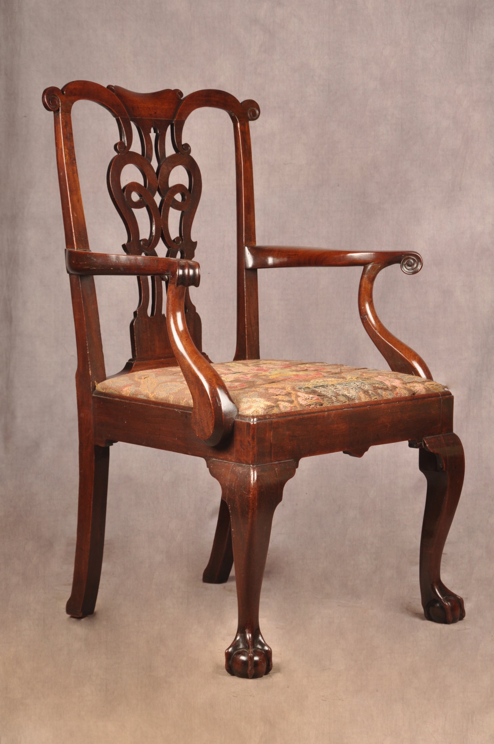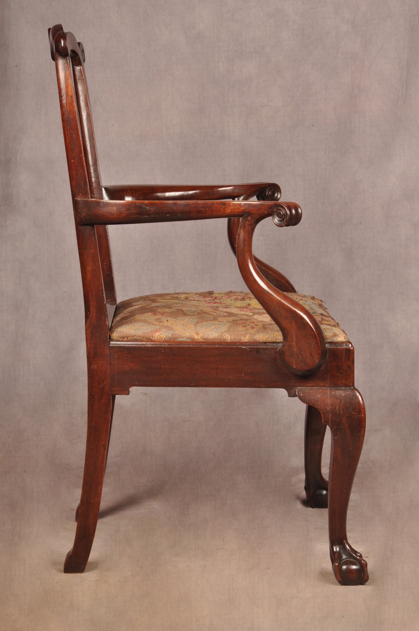 A fine and impressive George II Irish Armchair of the most fabulous glowing colour, made from the finest Mahogany. Having beautifully shaped splat and arms with carved scrolls to the tips. Standing on cabriole legs with claw and ball feet. In good original condition apart from a replaced scroll to the right edge of the top rail, all feet and ear pieces are original.