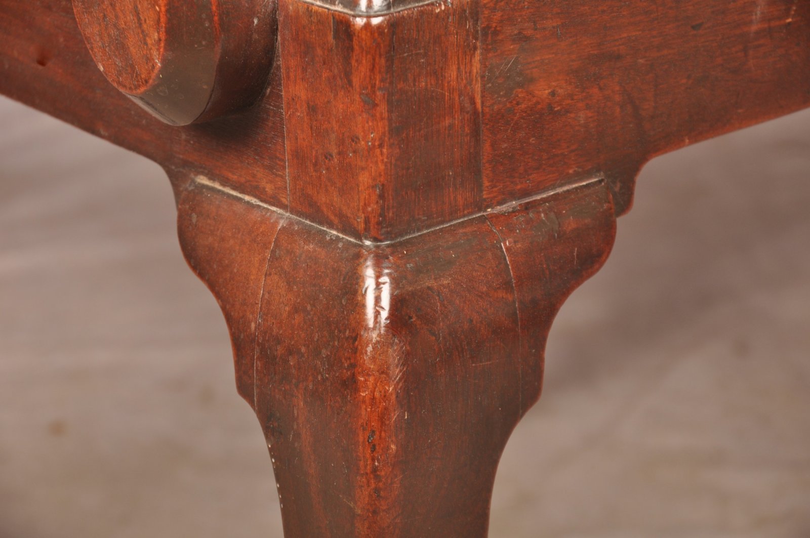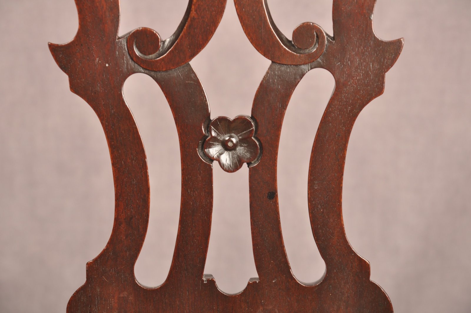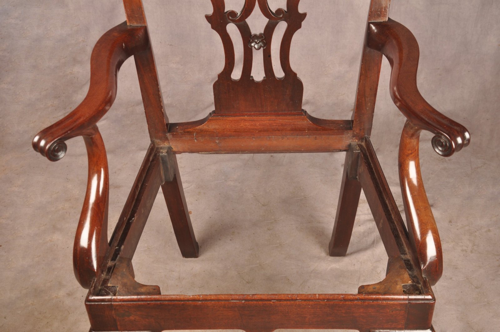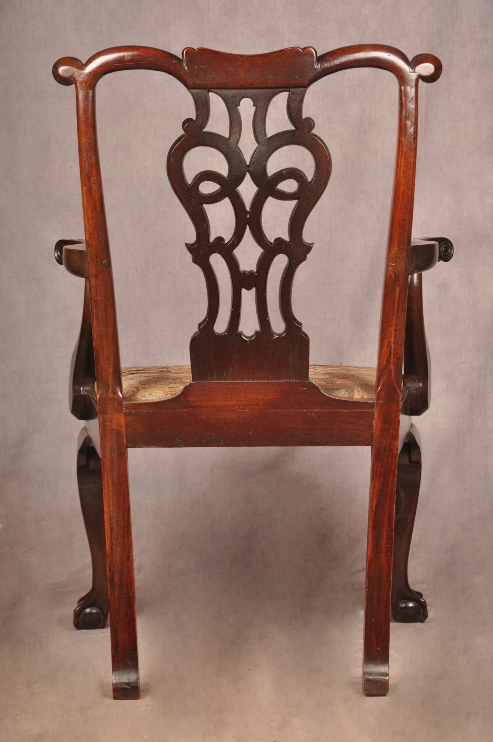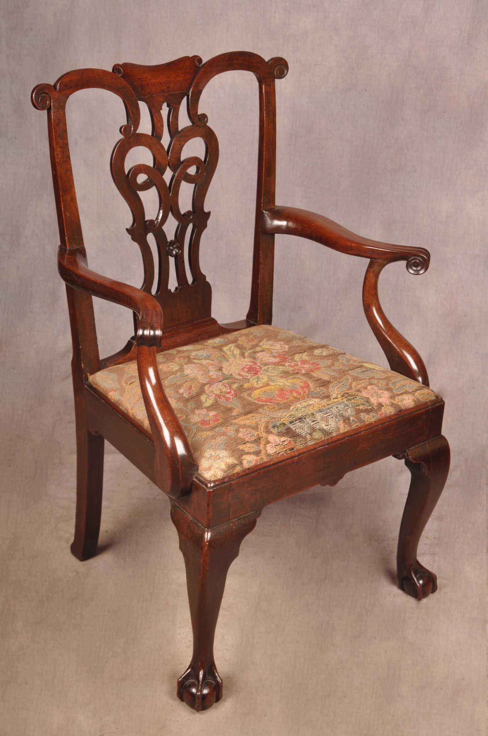 A fine and impressive George II Irish Armchair of the most fabulous glowing colour, made from the finest Mahogany. Having beautifully shaped splat and arms with carved scrolls to the tips. Standing on cabriole legs with claw and ball feet. In good original condition apart from a replaced scroll to the right edge of the top rail, all feet and ear pieces are original.