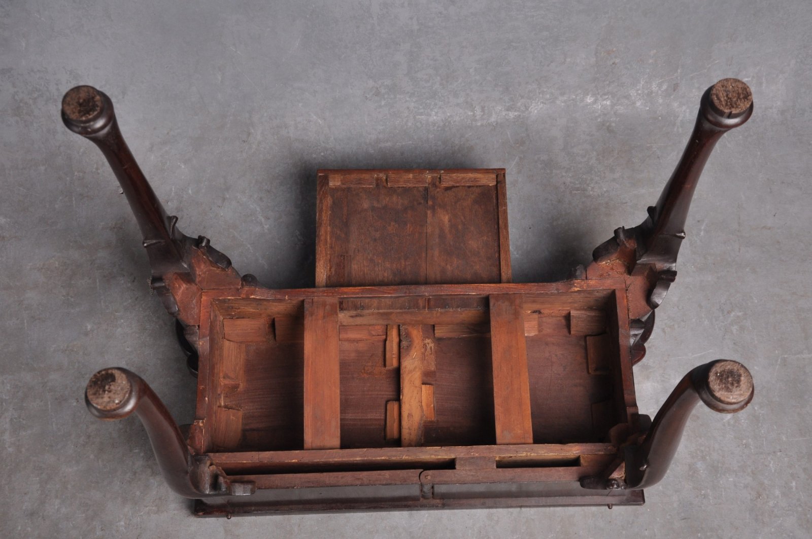 The table is in very good original order, even retaining the original pierced brass handle to the drawer. It is superbly shaped and well proportioned with scrolls carved to the tops of the elegant cabriole legs. One hinge has been replaced at some point. Circa 1750.