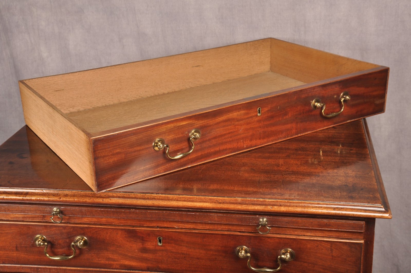 In perfect original condition retaining the original gilt brass handles and feet, having clean original oak drawer linings throughout. Circa 1760.