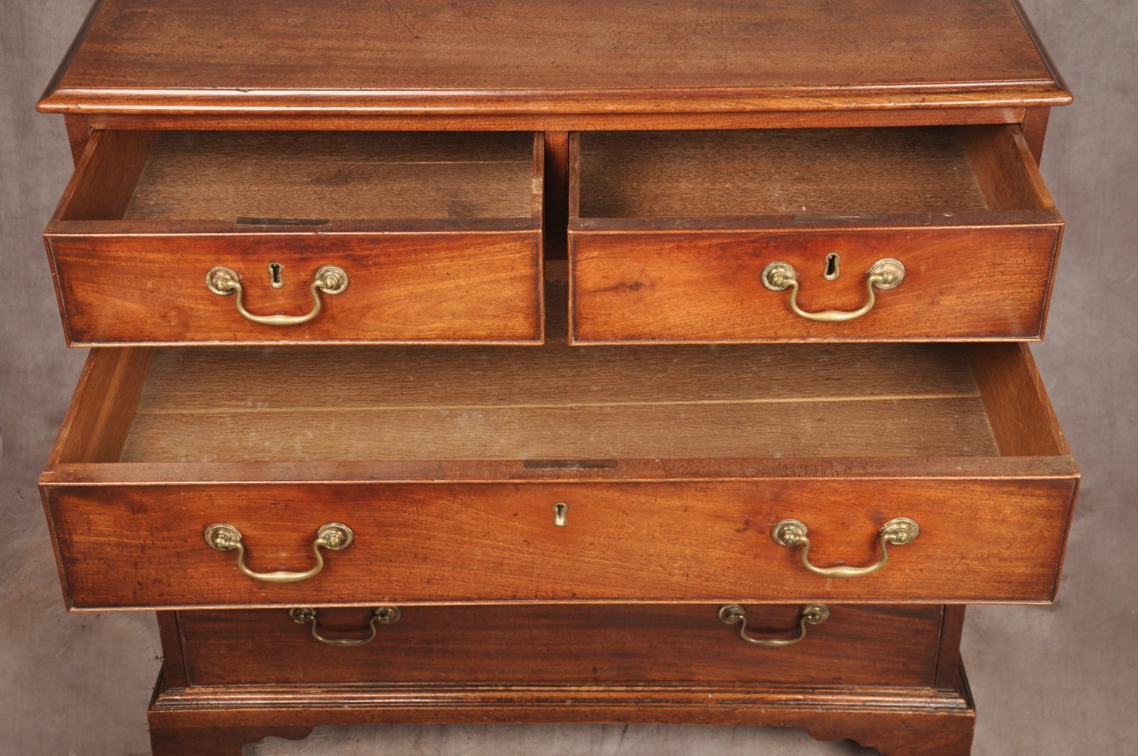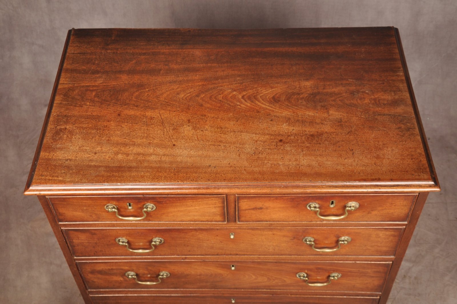 A beautiful 18th Century Mahogany Chest Of Drawers of fabulous faded golden colour and small proportions. In mint original condition retaining the original handles, feet and wonderfully clean oak drawer linings. Circa 1770