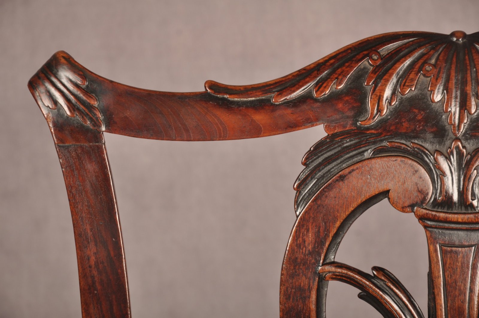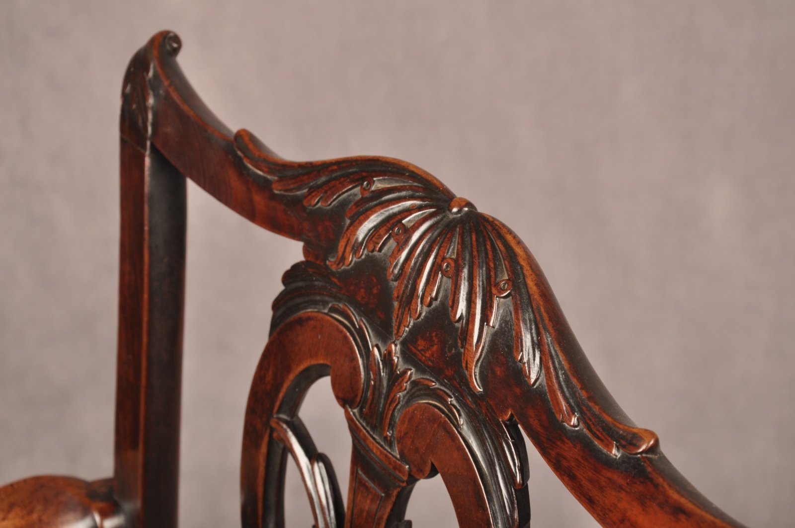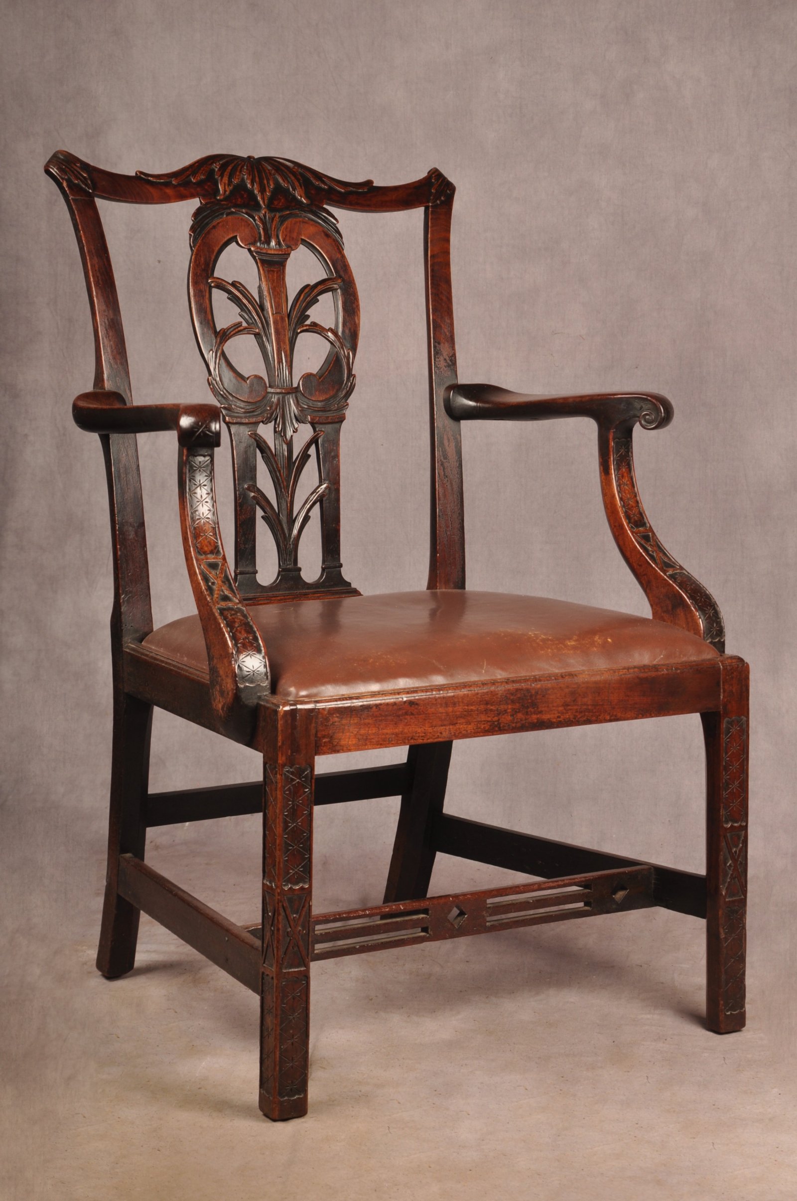 A fine and rare quality 18th Century Mahogany Armchair of wonderful rich colour and patina in the manner of Thomas Chippendale, having beautifully carved draped acanthus leaf to the the centre and shoulders of the top rail. The splat shaped and carved with C scrolls and leaf work. The burnished arms carved with scrolls and strap work with punched decoration in the Chinese Chippendale Fashion, this flows down the uprights onto the front legs. The front stretcher pierced in the same manner.