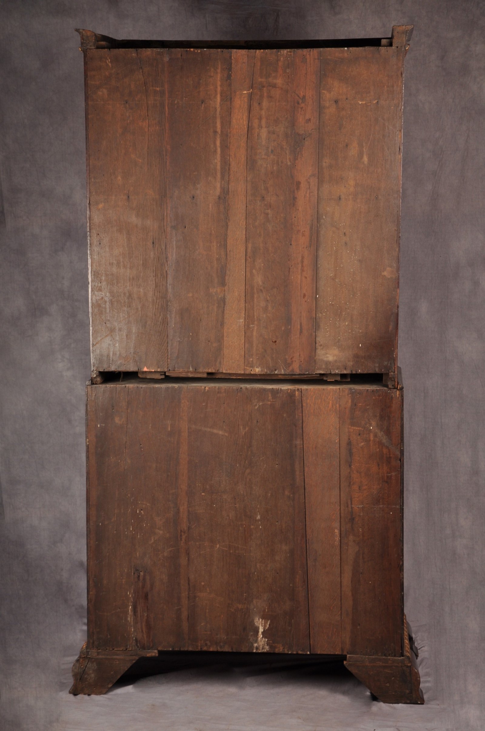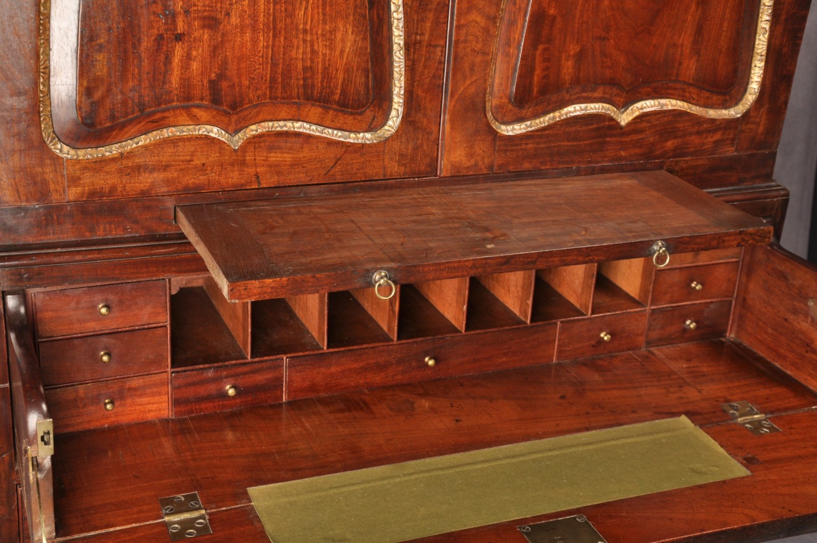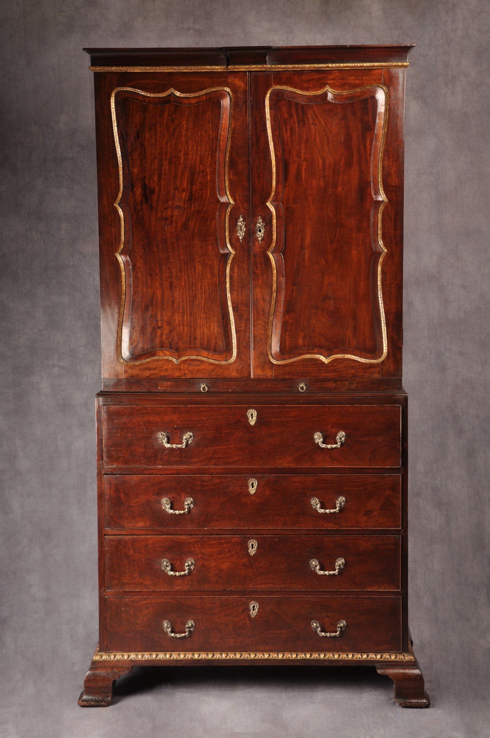 A magnificent and rare 18th Century George II Parcel Gilt Secretaire Cabinet of wonderful colour, in the manner of Giles Grendey. This superbly made piece of English furniture has a concave shaped and carved gilt wood break front cornice above two shaped doors with fine foliate gilt wood carving bordering the fielded panels. Interestingly the single wide candle slide on this piece can be seen on London made pieces by Old & Ody and is a relatively rare feature. The base mould is boldly carved with egg & dart gilt wood decoration and the ogee feet are swept outwards. The interior of the cabinet is fitted with many drawers of varying sizes retaining the original ring drop handles. The secretaire drawer fitted with finely made pigeon holes and drawers retaining the original brass knobs. The locks and hinges are original, the exterior handles are later replacements.