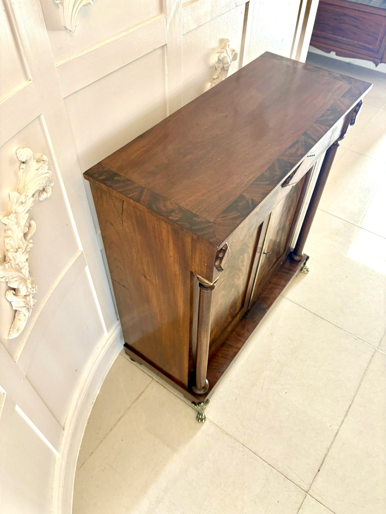 The piece stands on a plinth base with elegant brass lion paw feet and concealed castors for ease of movement. The rich patina and craftsmanship are characteristic of the Regency period reflecting refined taste and neoclassical influence.