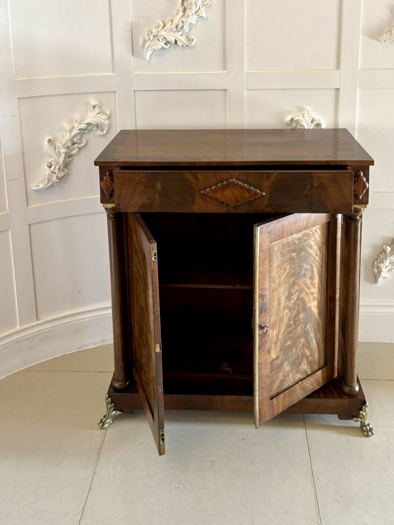 The rectangular top is veneered in beautifully figured mahogany with crossbanded edging over a pair of panelled doors displaying rich flame mahogany grain. The doors open to reveal a shelved interior offering useful storage. The upper frieze features finely carved diamond and beaded appliqués, flanked by turned columns with brass-mounted capitals.