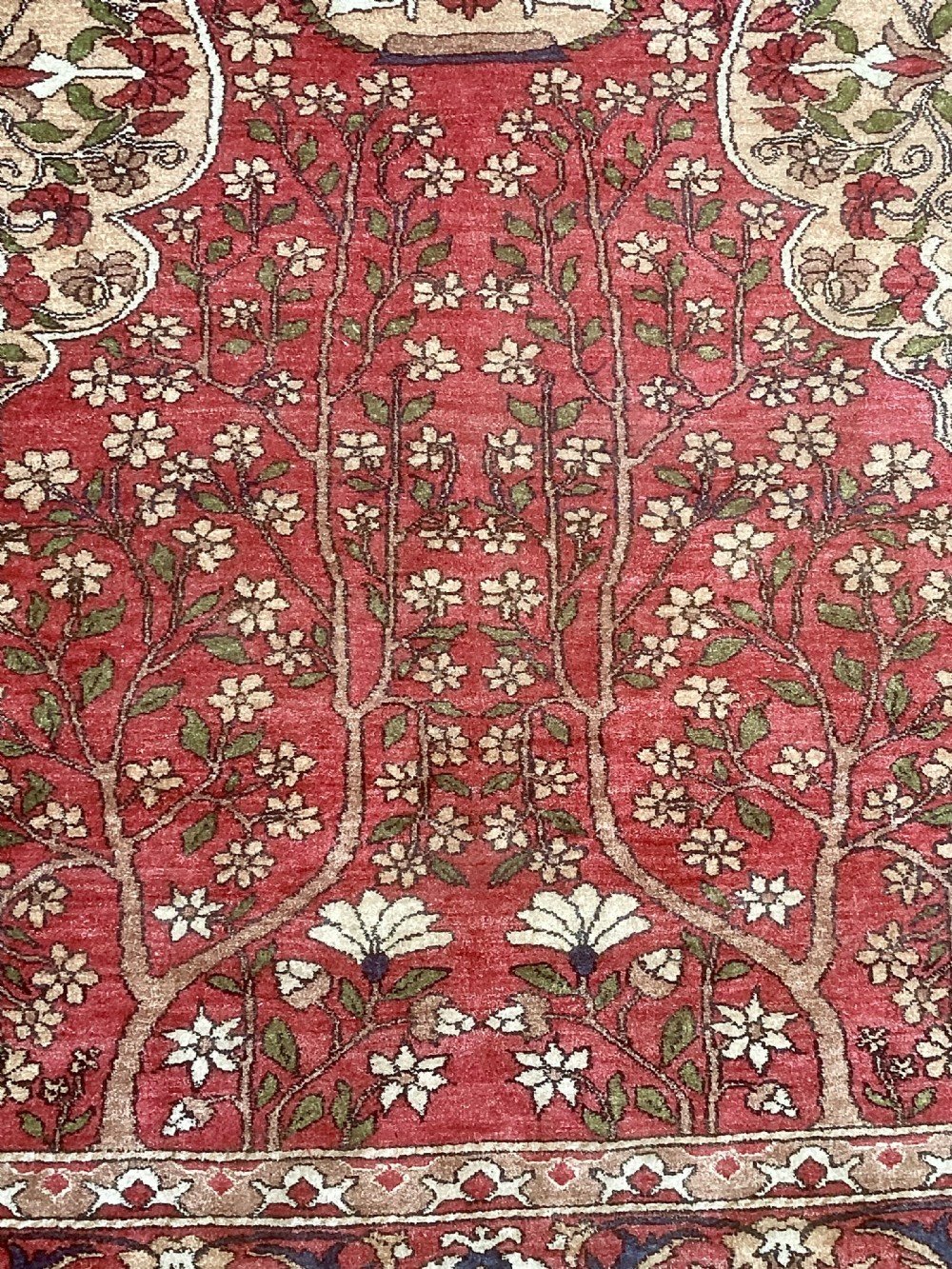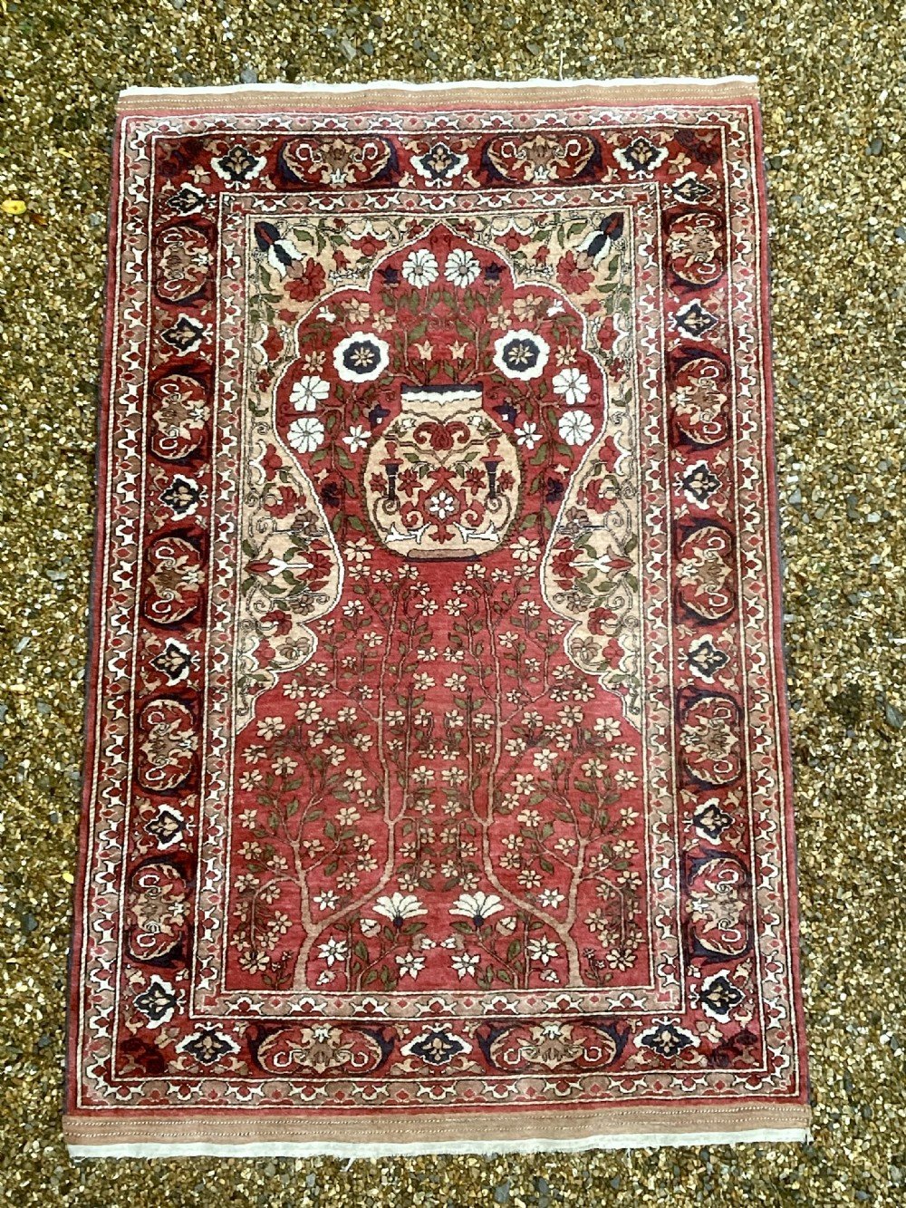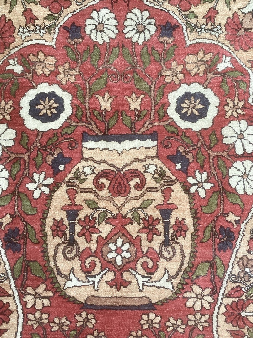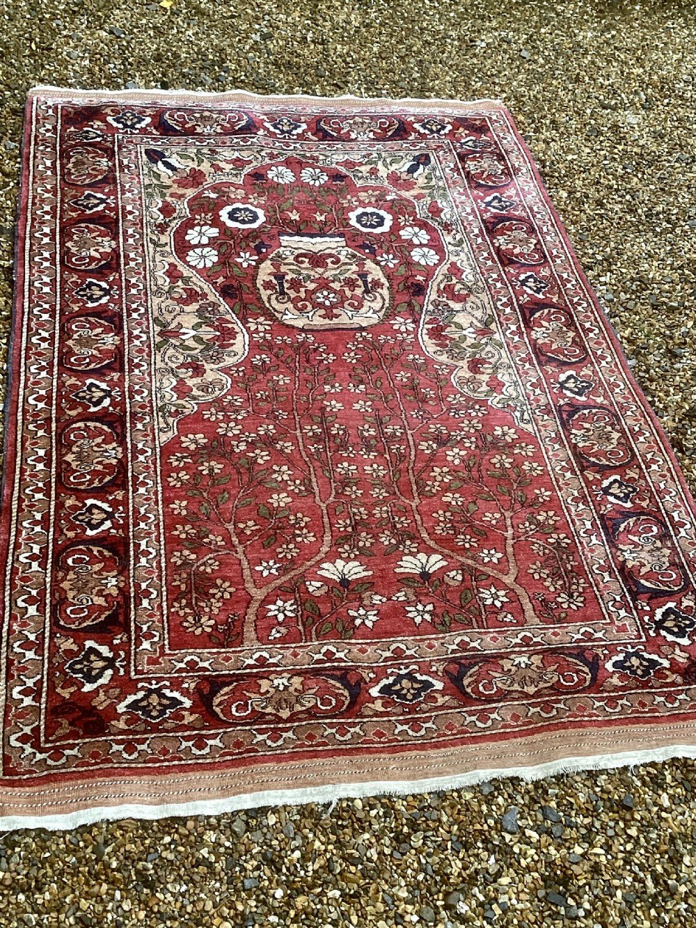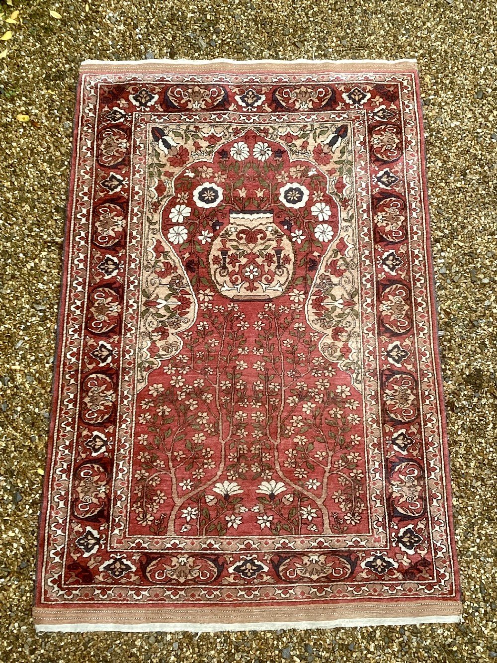 This finely woven Mauri Turkman silk prayer rug from North West Afghanistan dates from the early 20th century. ''Mauri'' rugs are destinctive for being extremely finely knotted, the Mauri weavers being descended from the Tekke, Yamoud and Saruq tribes on the silk route. This very pretty prayer rug has a raspberry field with an urn issuing flowers surrounded by blossoming trees and floral borders in deep indigo and warm ivory. The rug is in very good order with a good pile throughout. It is a good size, measuring 180 cms by 118 cms.