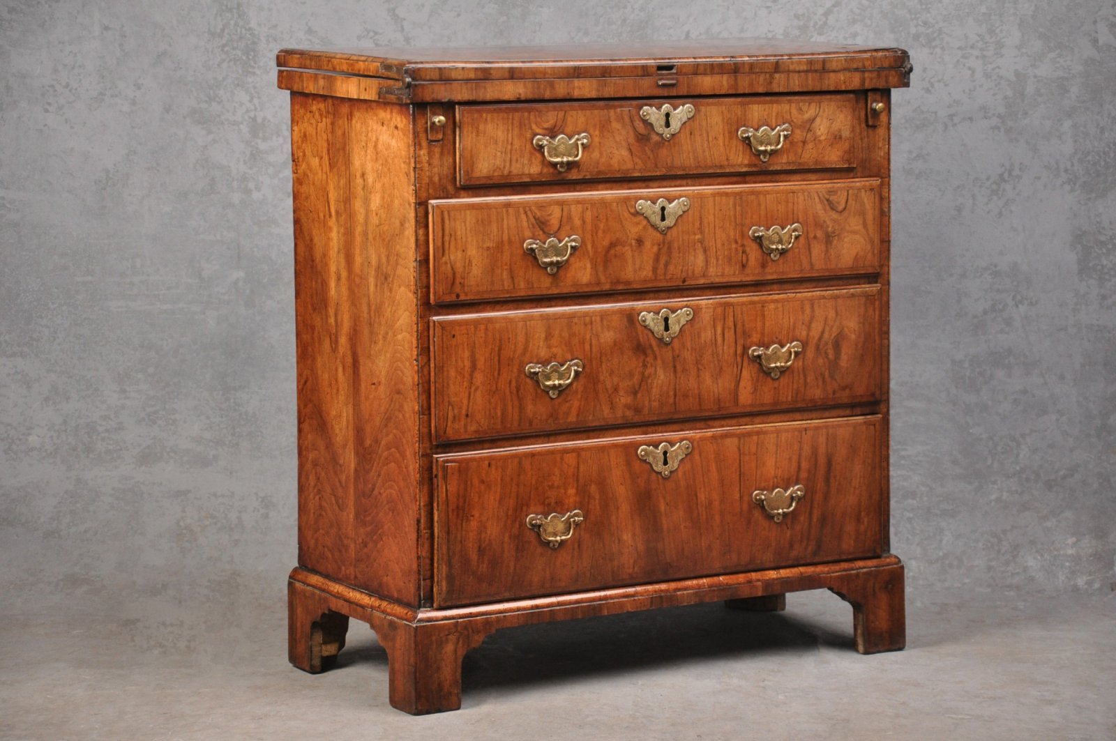 An extremely rare George I Walnut Bachelors Chest of good colour and patina with original handles and hinges. This is a wonderful example with good clean oak linings, original veneers and feather banding. Quite remarkably the handles retain most of there original gilding, it is interesting to note that although the chest has been made in the George I manner the handles are more associated with the Queen Anne period, it is possible that this is a transitional piece. There is a similar chest from the same period as this one at Beningbrough Hall a National Trust property near York which also has lip moulded drawers that are typical of the period, this one too has Queen Anne handles. It has been well documented over the last century in various books that these chests are rare and highly sort after by collectors of Walnut and connoisseurs alike. One of the most famous Walnut collectors of recent times John Parry actually had five Walnut Bachelors Chests at the time of his last sale at Christies in March 2010, the most expensive of these made an incredible £91,250. In the 54 years that my farther has spent in the business he has bought and sold examples from different periods and also seen many fakes and badly restored ones. This example is particularly rare being in such good original condition and retaining the original handles and hinges.