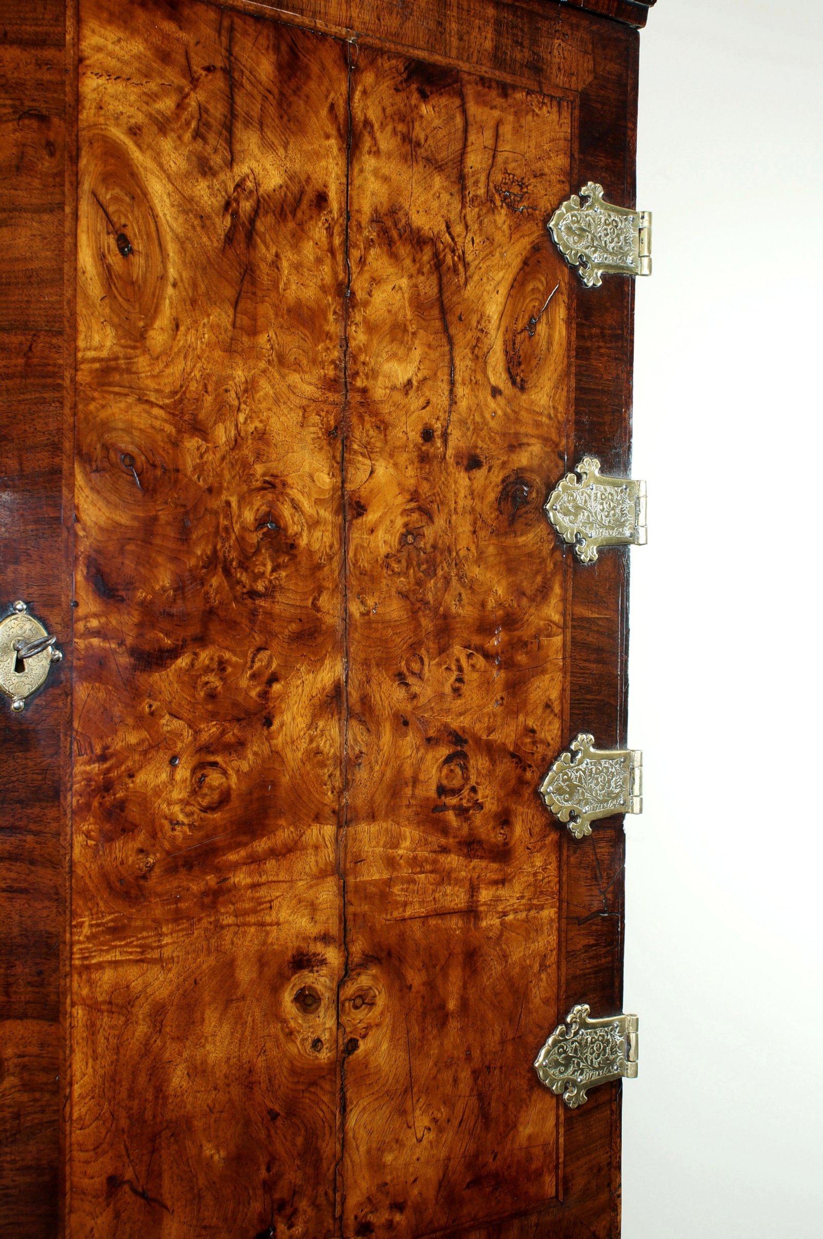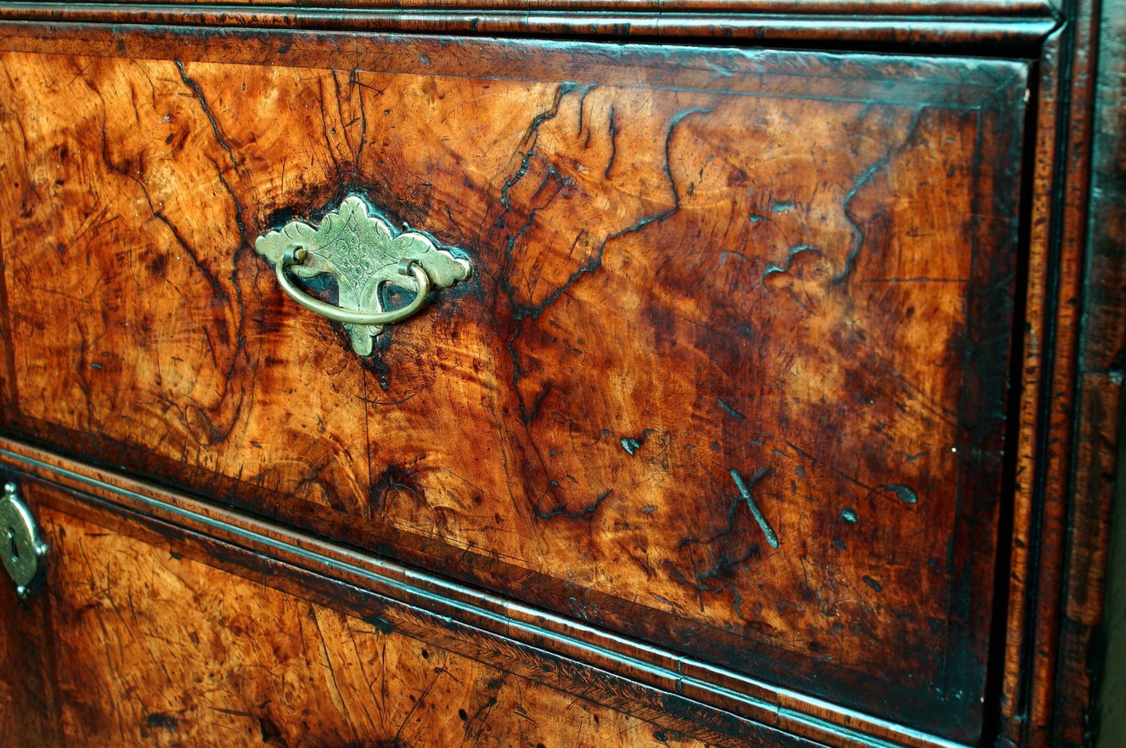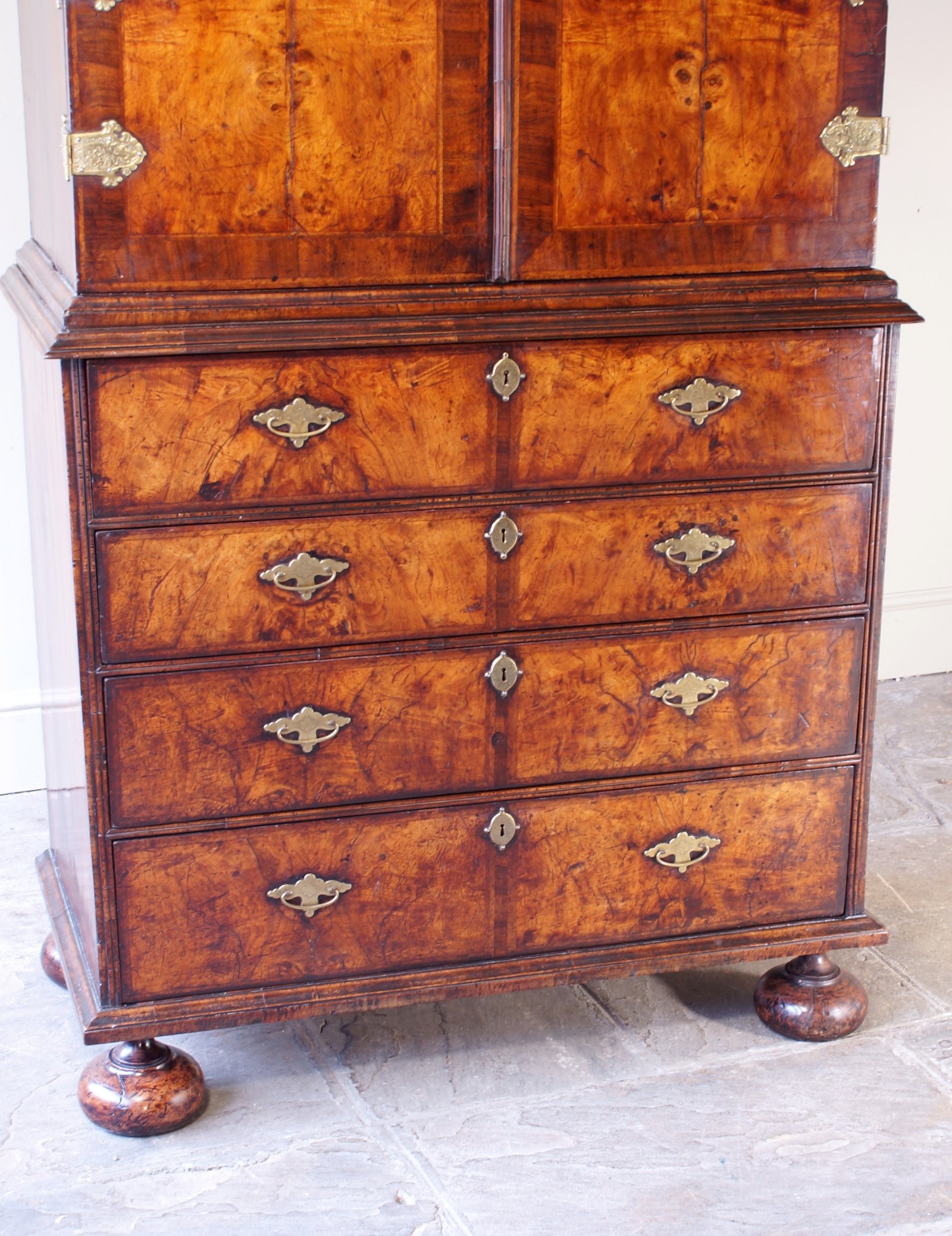 A top-quality cabinet made with oak-lined drawers throughout and highly prized figured walnut veneer in excellent condition, having just later handles and bun feet. This piece of early walnut furniture is of a fabulous glowing warm color and patina highly prized by collectors.