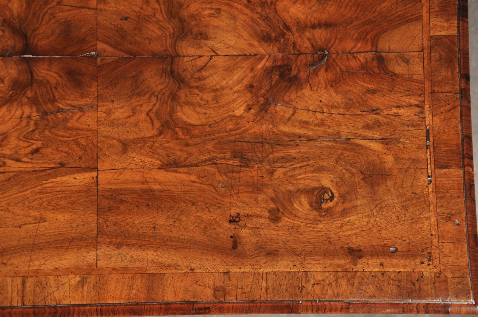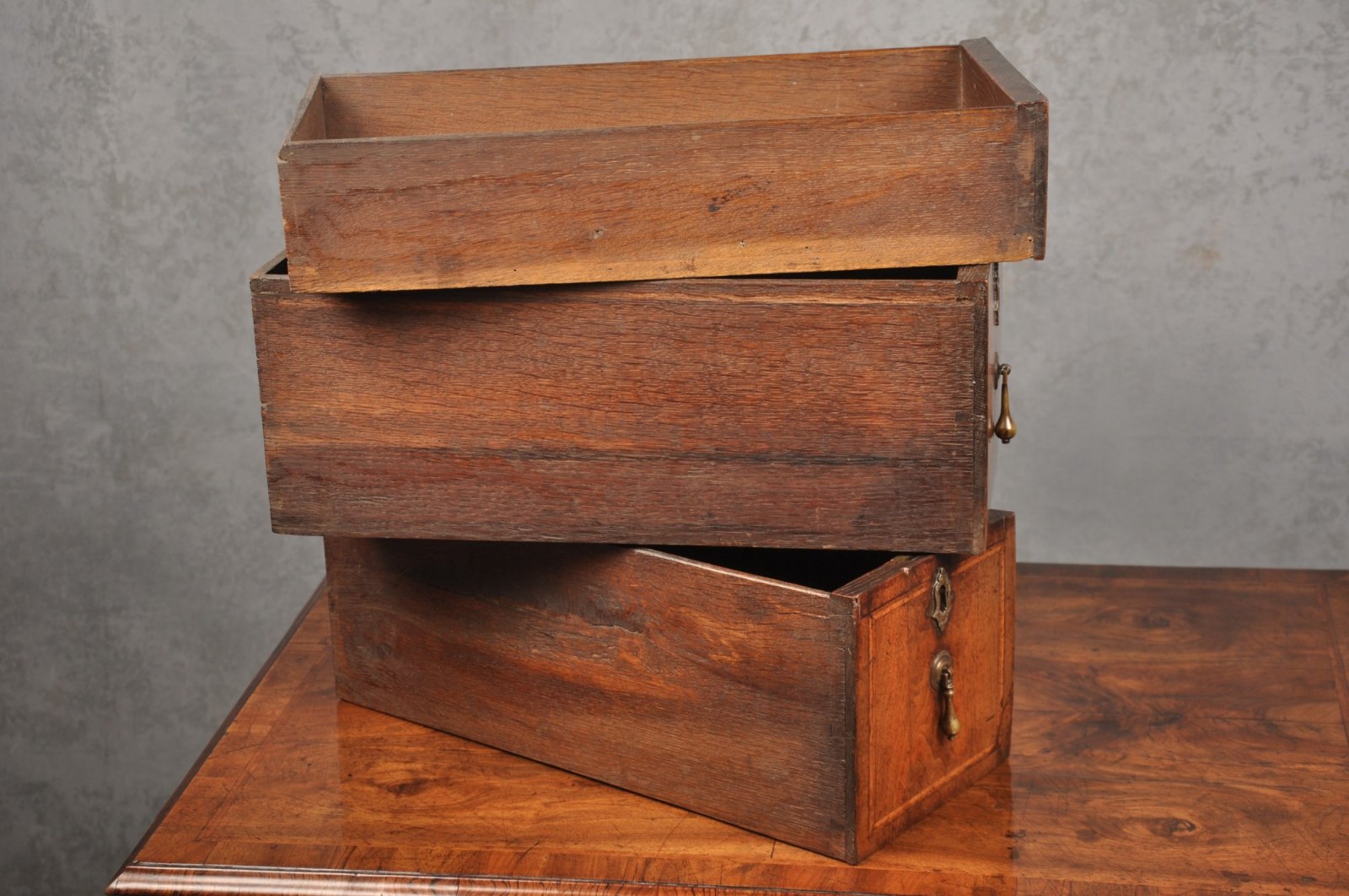 The applied double bead surrounding the drawers appears to be made from dark rosewood in order to give a contrasting affect to the light coloured Walnut. The top is in figured matched Walnut with feather banding and cross band. Having clean original Oak drawer linings.