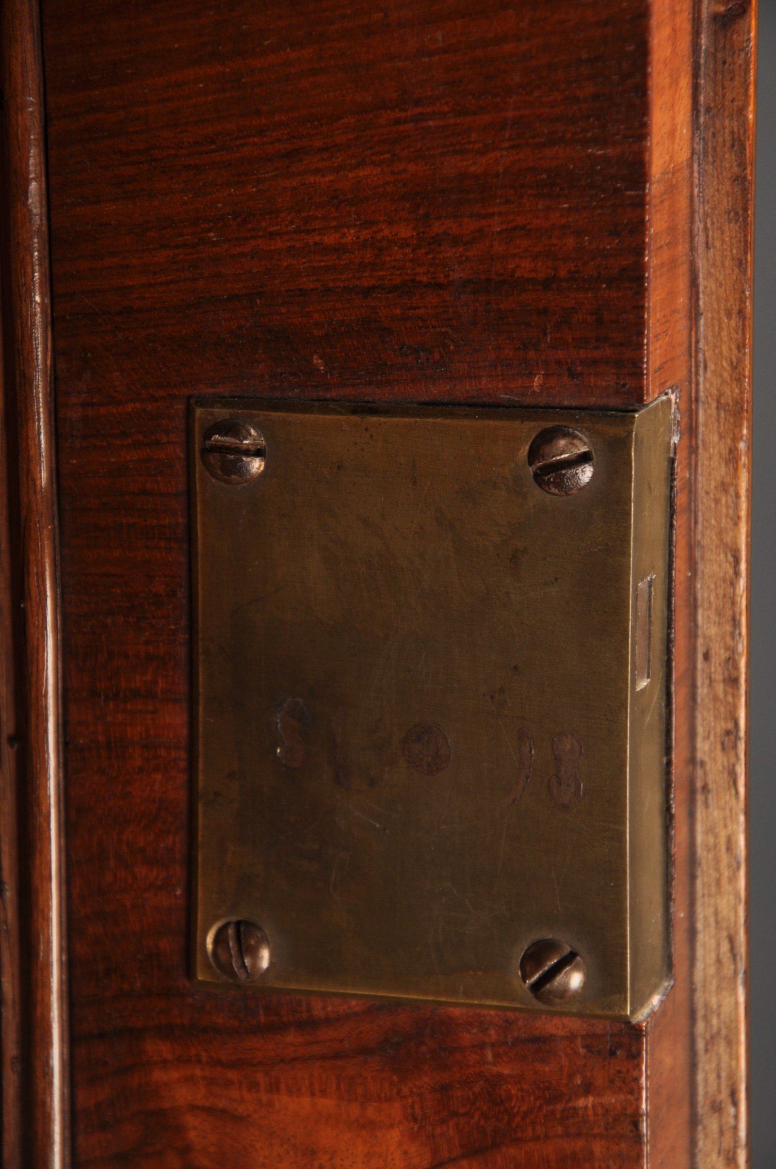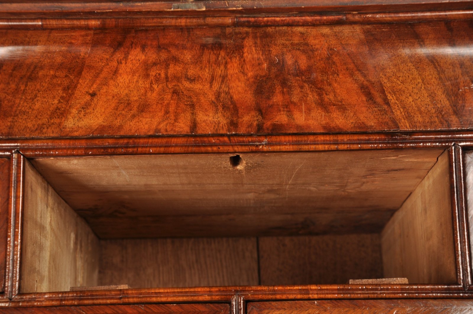 It is interesting to note that the same gilt brass ring drop handles with domed back plates were used on the interior of both pieces and that the top section of the interior drawer formation is almost identical, apart from the addition of a secret concave drawer operated from underneath by removing the middle drawer. This type of drawer to the top can be seen on pieces by William old and John Ody who were contemporaries of Coxed and Woster, both firms had workshops in the st. Paul''s Churchyard area of London.