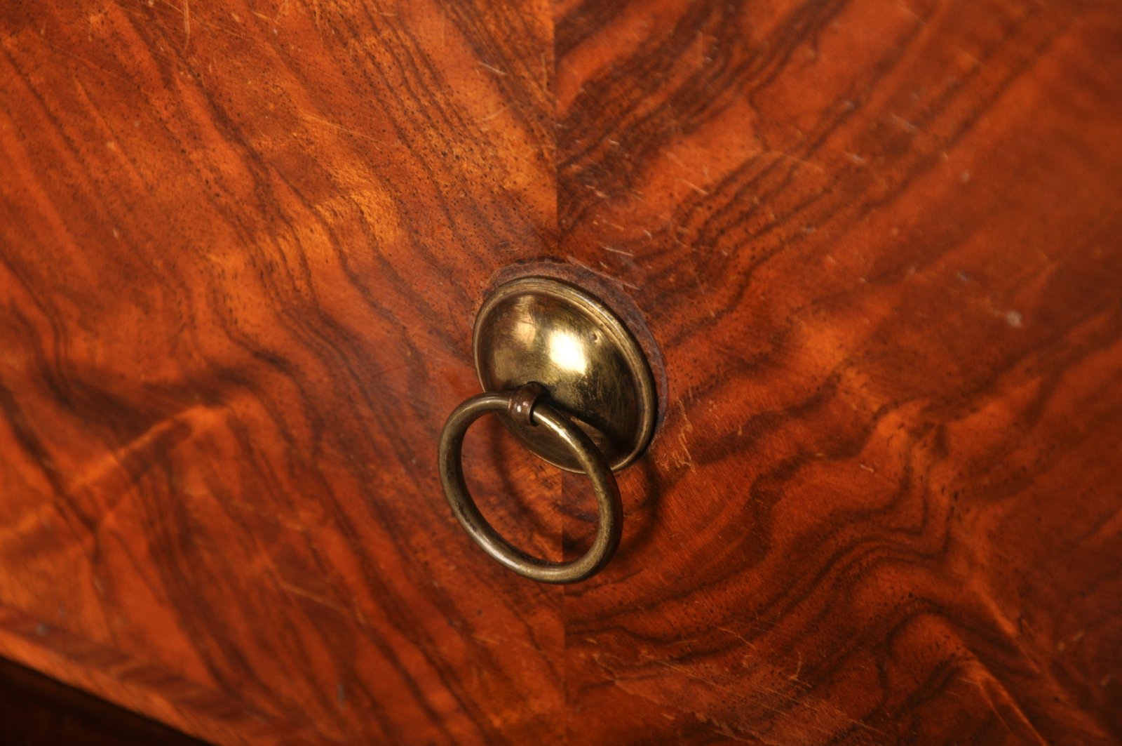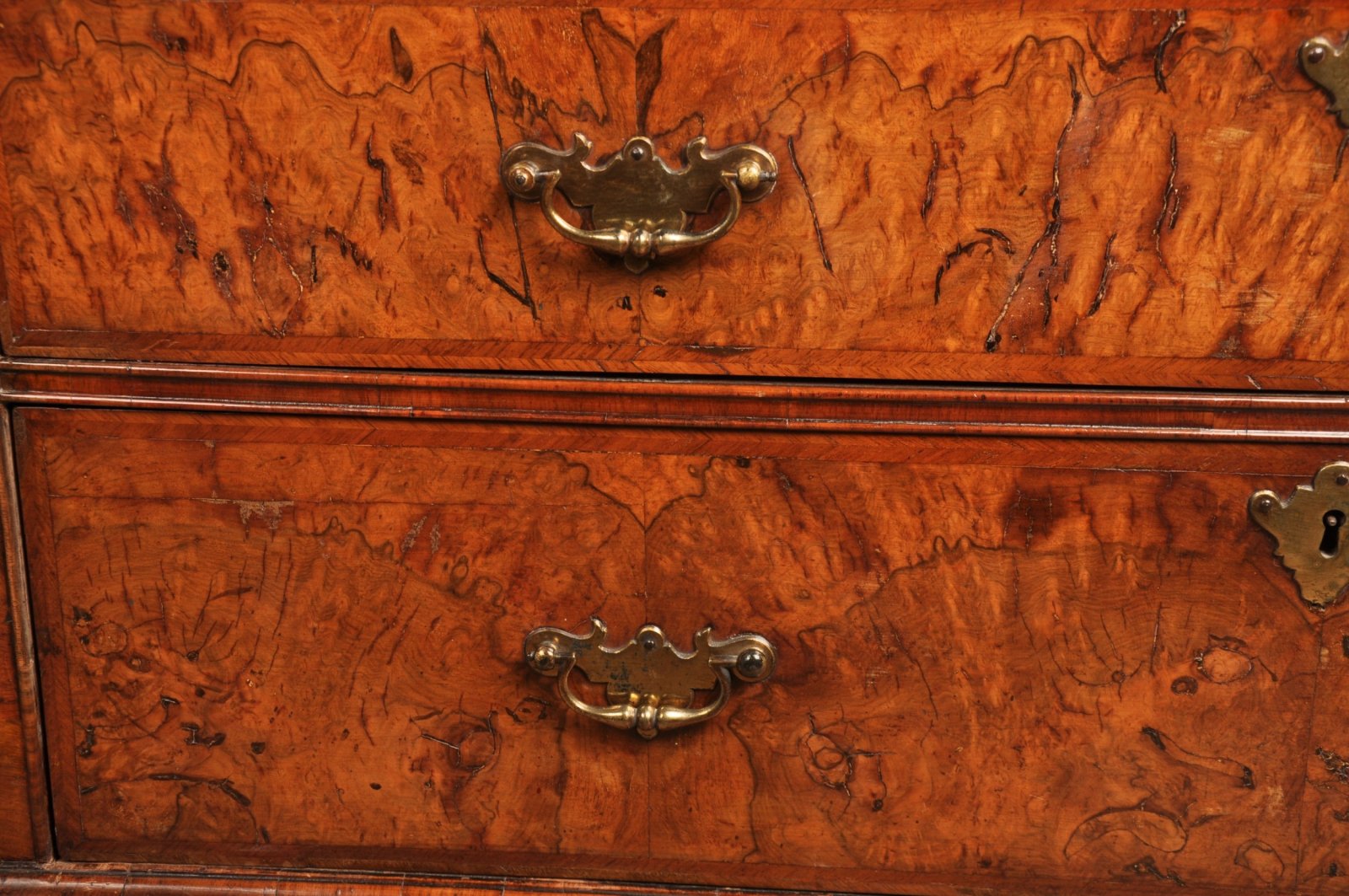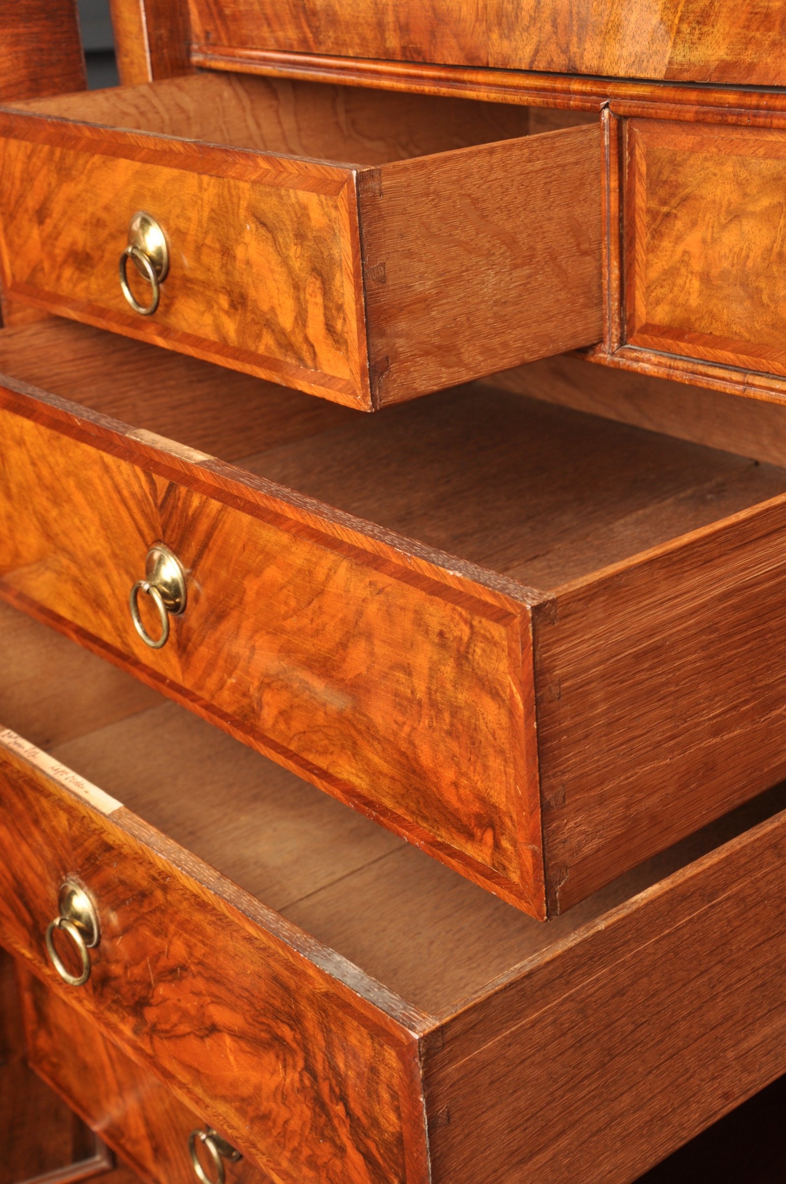 The originality of this piece along with the striking Walnut veneers make it special. Originally the handles to the drawers in the base were the same as those of the interior, we can see this due to the old fixings inside the drawer fronts, ring handles can also be seen to the base of other documented examples from st. Paul''s Churchyard London. The handles that are now fitted to the base drawers are gilt brasses of the period and similar to those on other pieces of this type. These larger and stronger handles we believe were fitted within the first few years after it was made as the originals were too weak for the larges base drawers. The other fittings are all original including hinges, locks, bolts and interior handles.