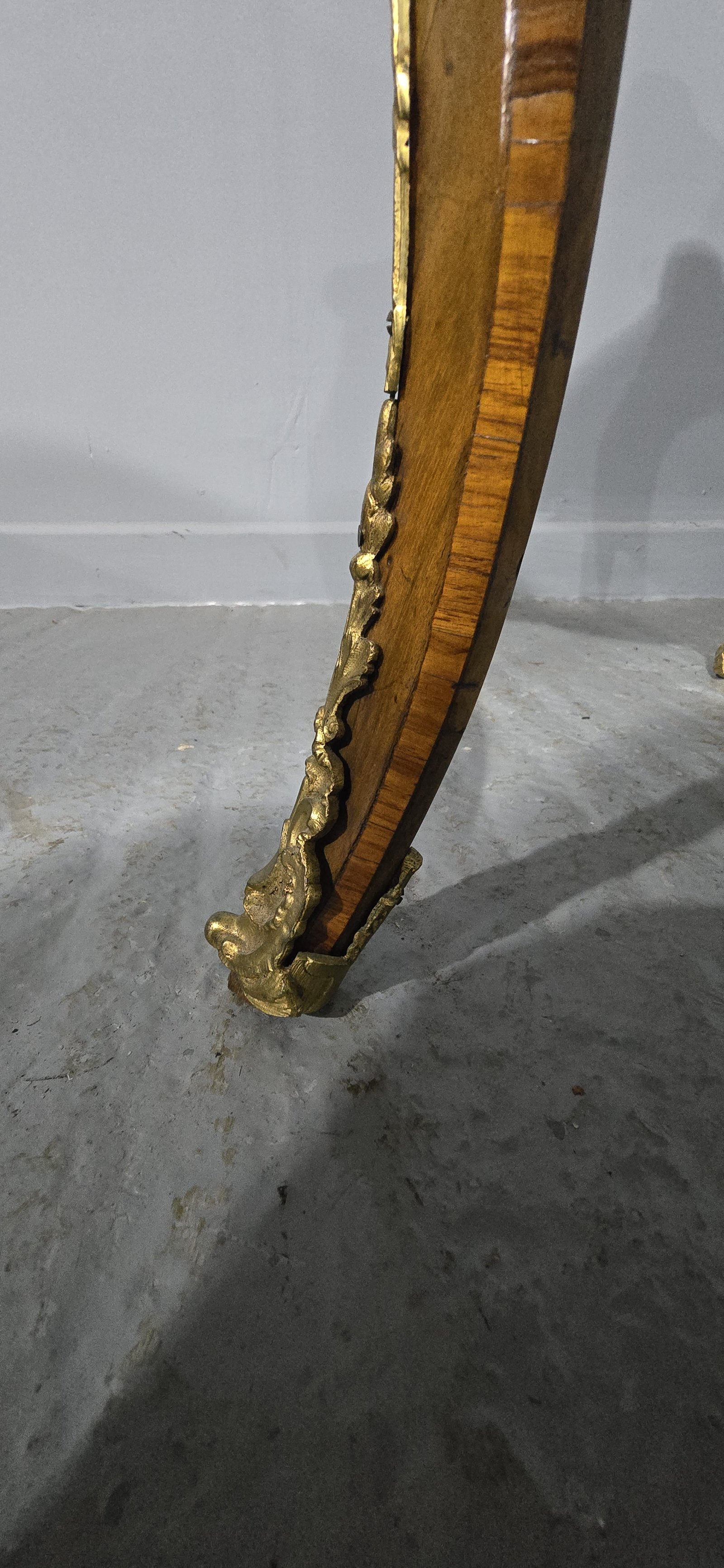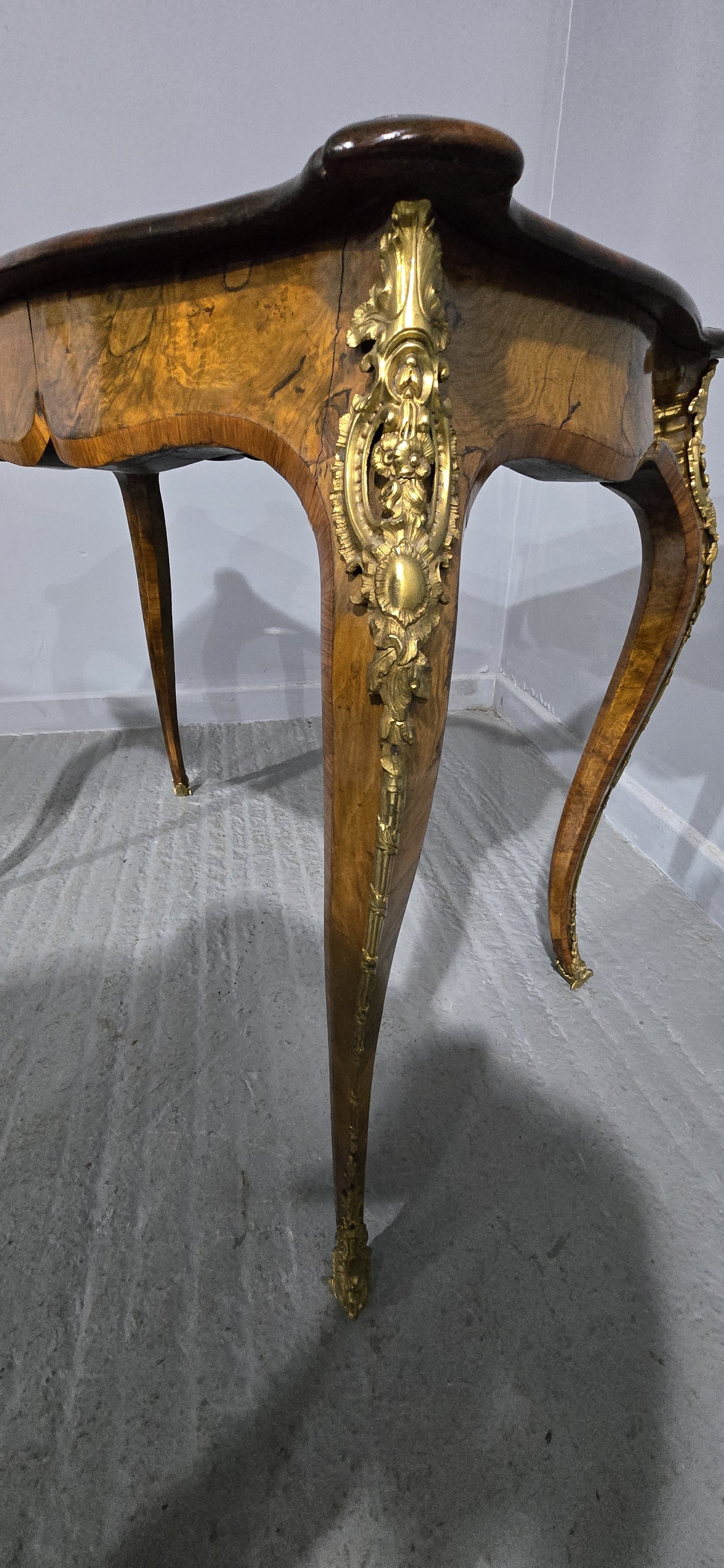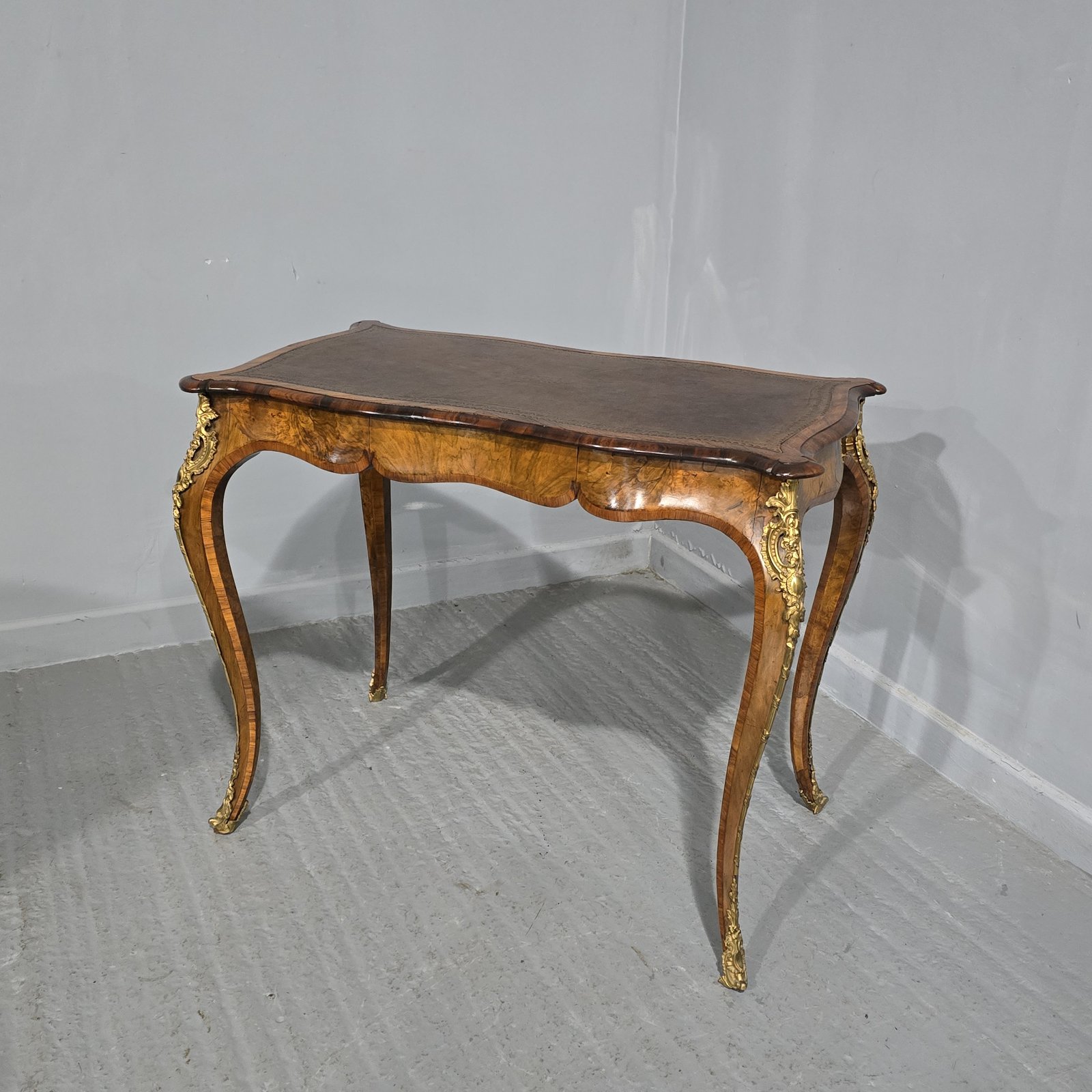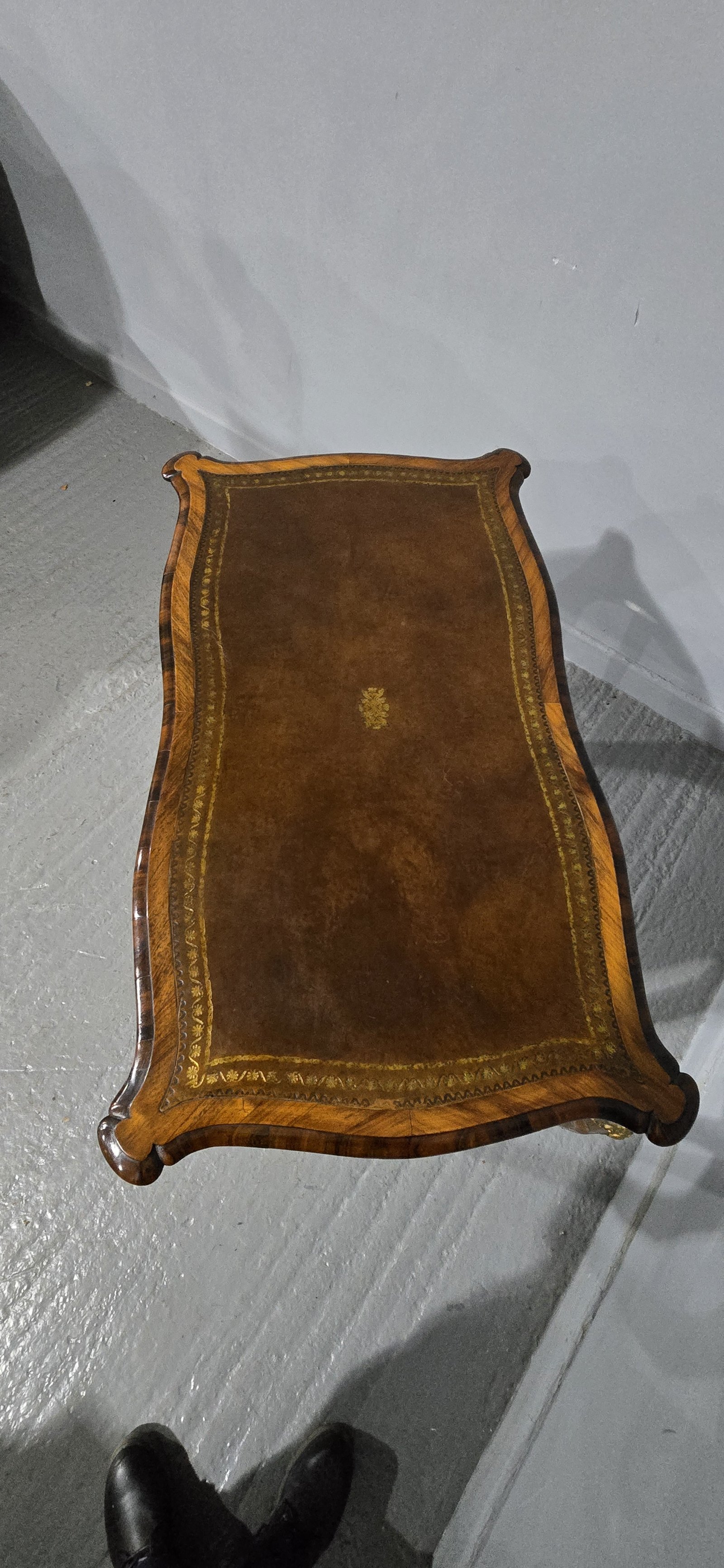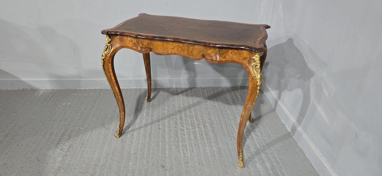A lovely French burr walnut and tulipwood banded bureau platt or dressing table, with gold shaped leather top, ormolu mounts, single drawer, in very nice overall condition.